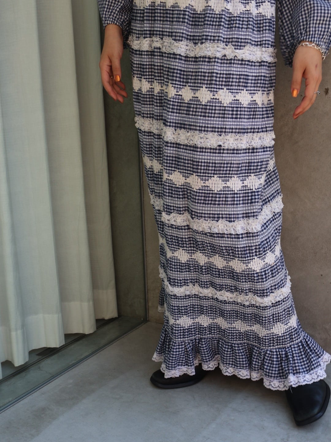 レースや刺繍が施された可愛らしいギンガムチェック柄のロングワンピース。