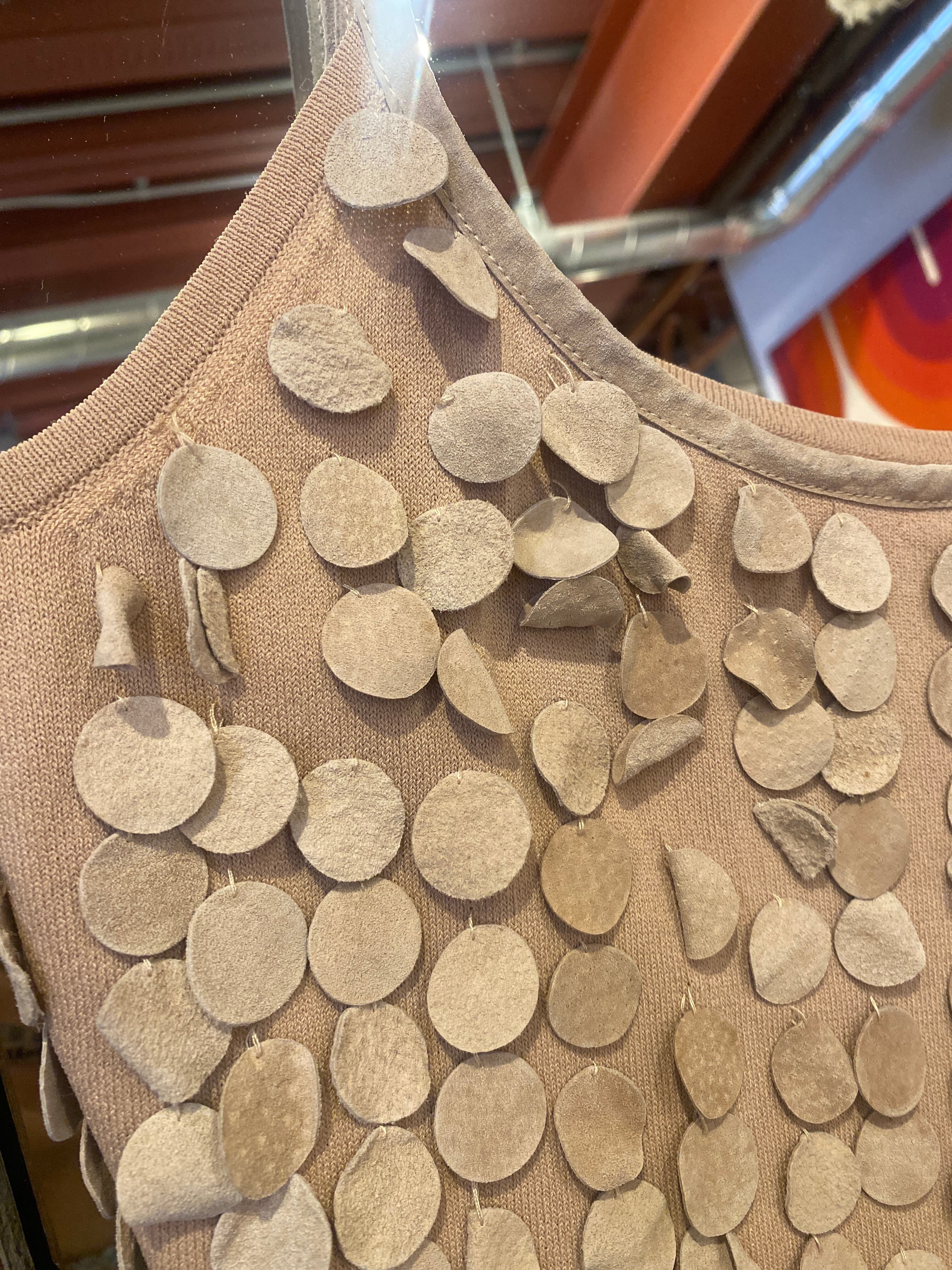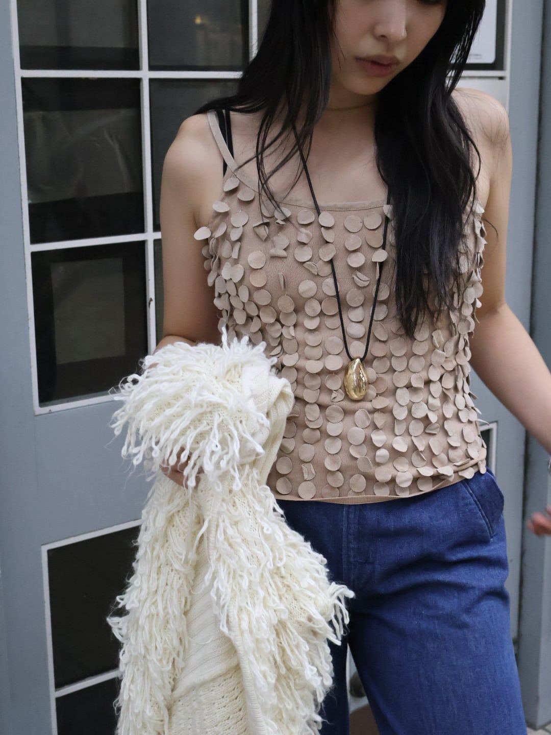 伸縮性のある生地に、たっぷりとスエードの飾りがあしらわれたキャミトップス。