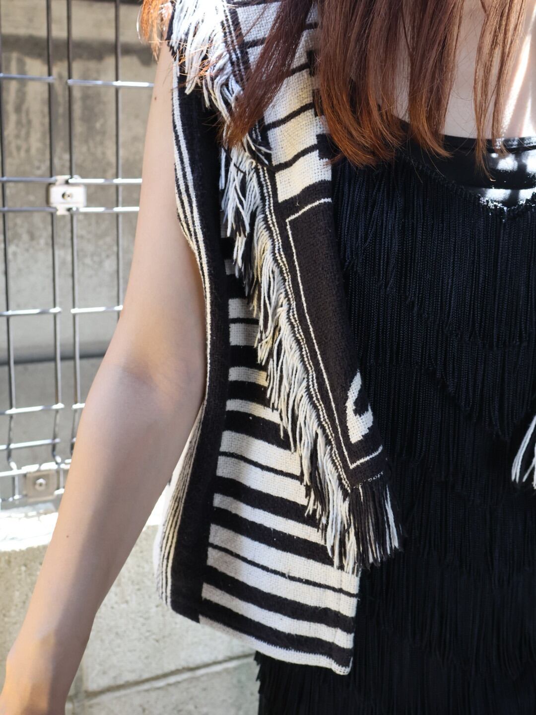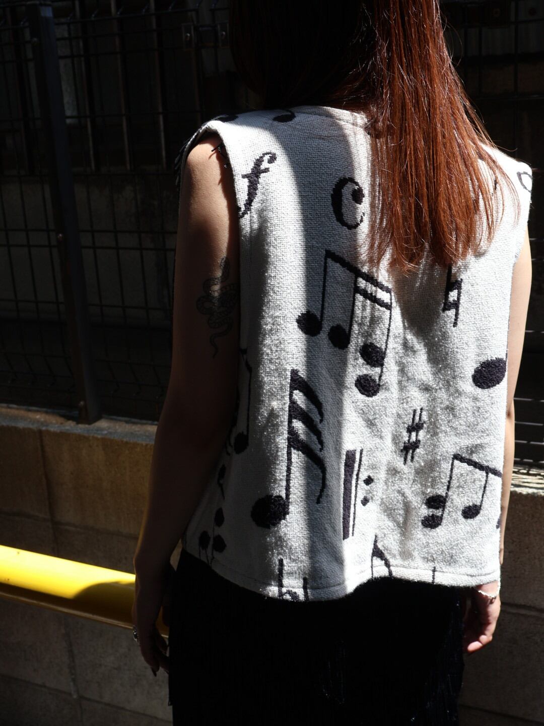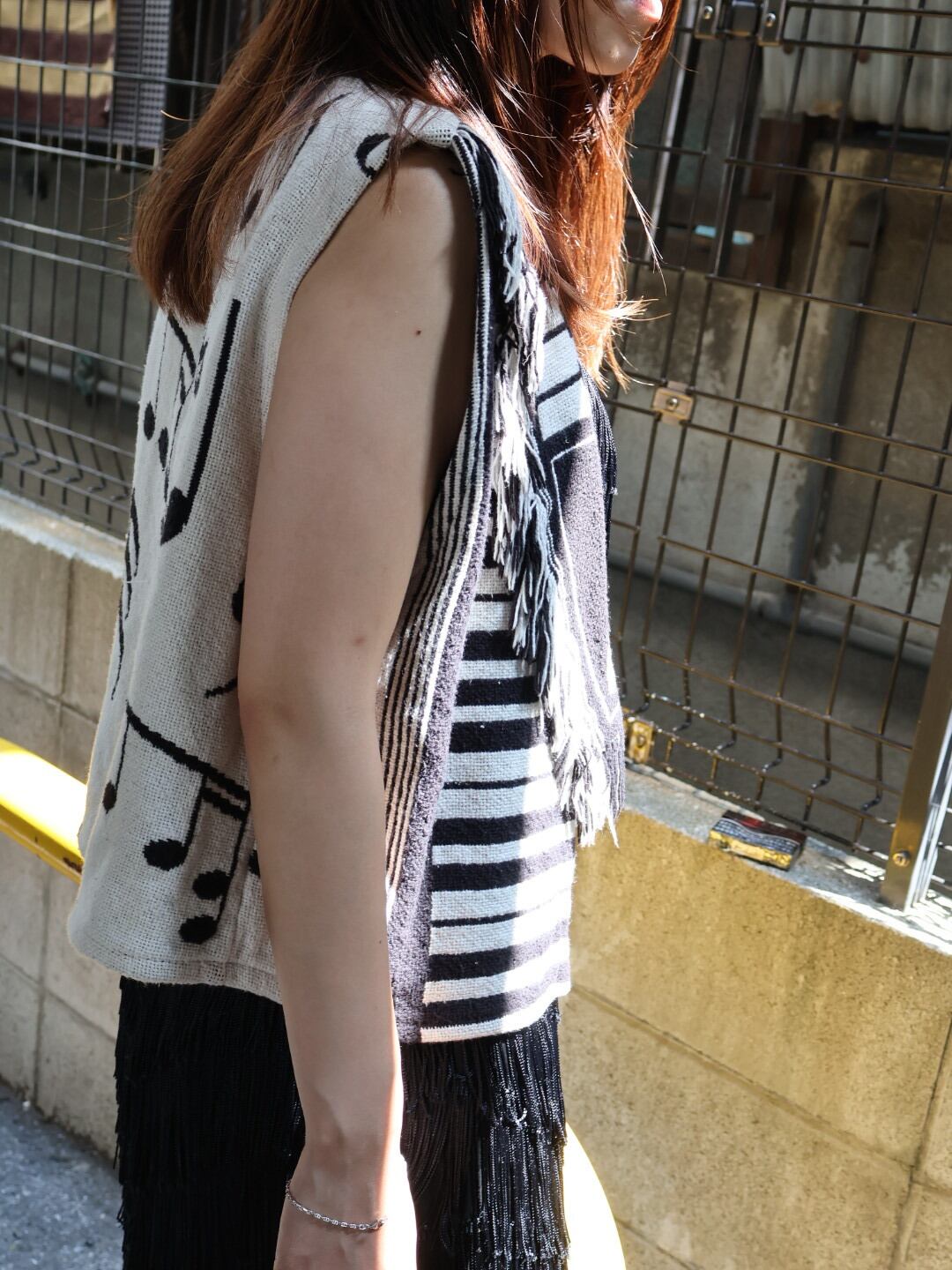 鍵盤や音符のパターンがあしらわれたベスト。