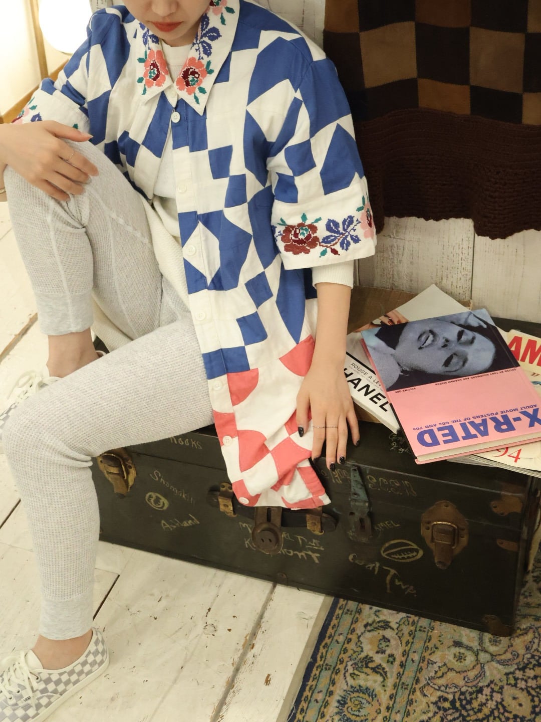 鮮やかなパッチワークデザインが目を惹くシャツワンピース。