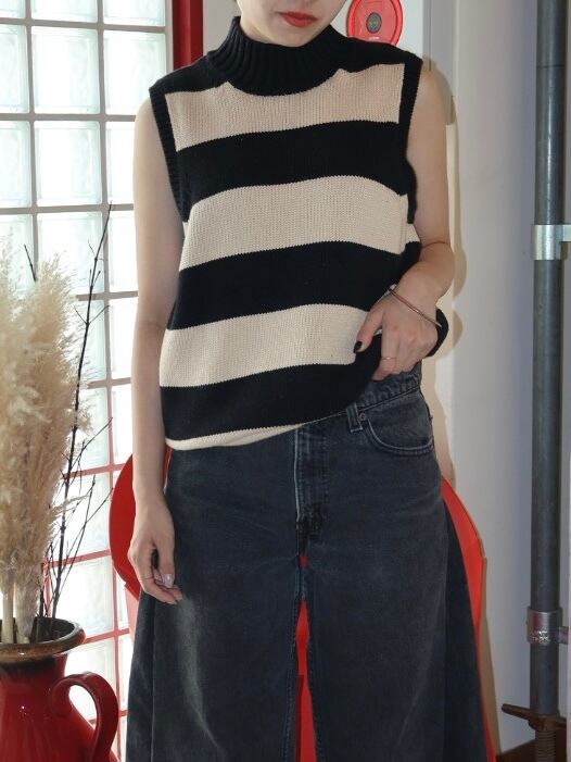 太ピッチのボーダー柄が特徴的なニットベスト。