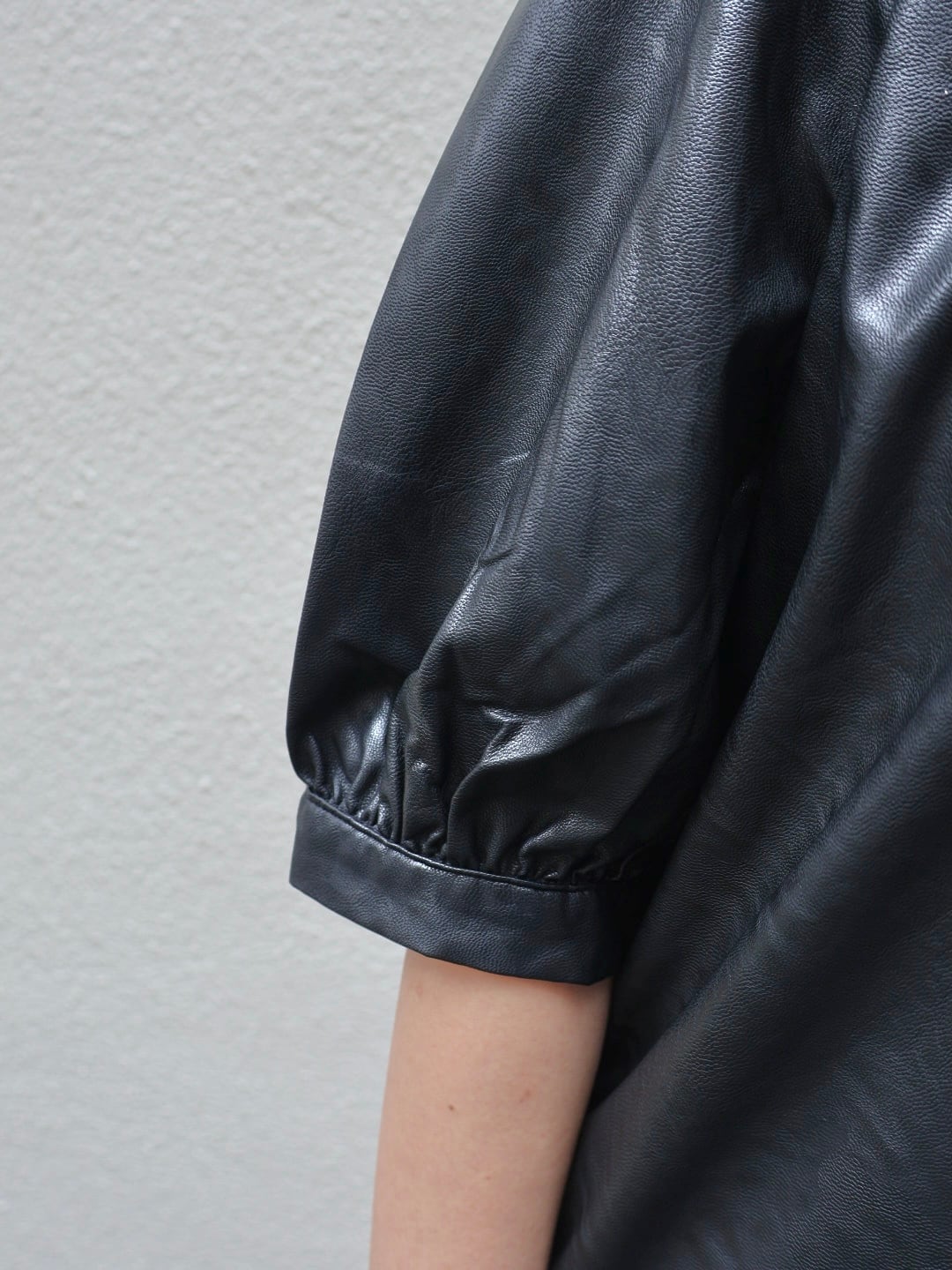 ふわっとしたパフスリーブと大きめのボタンが並んだバックスタイルがポイントの一着。