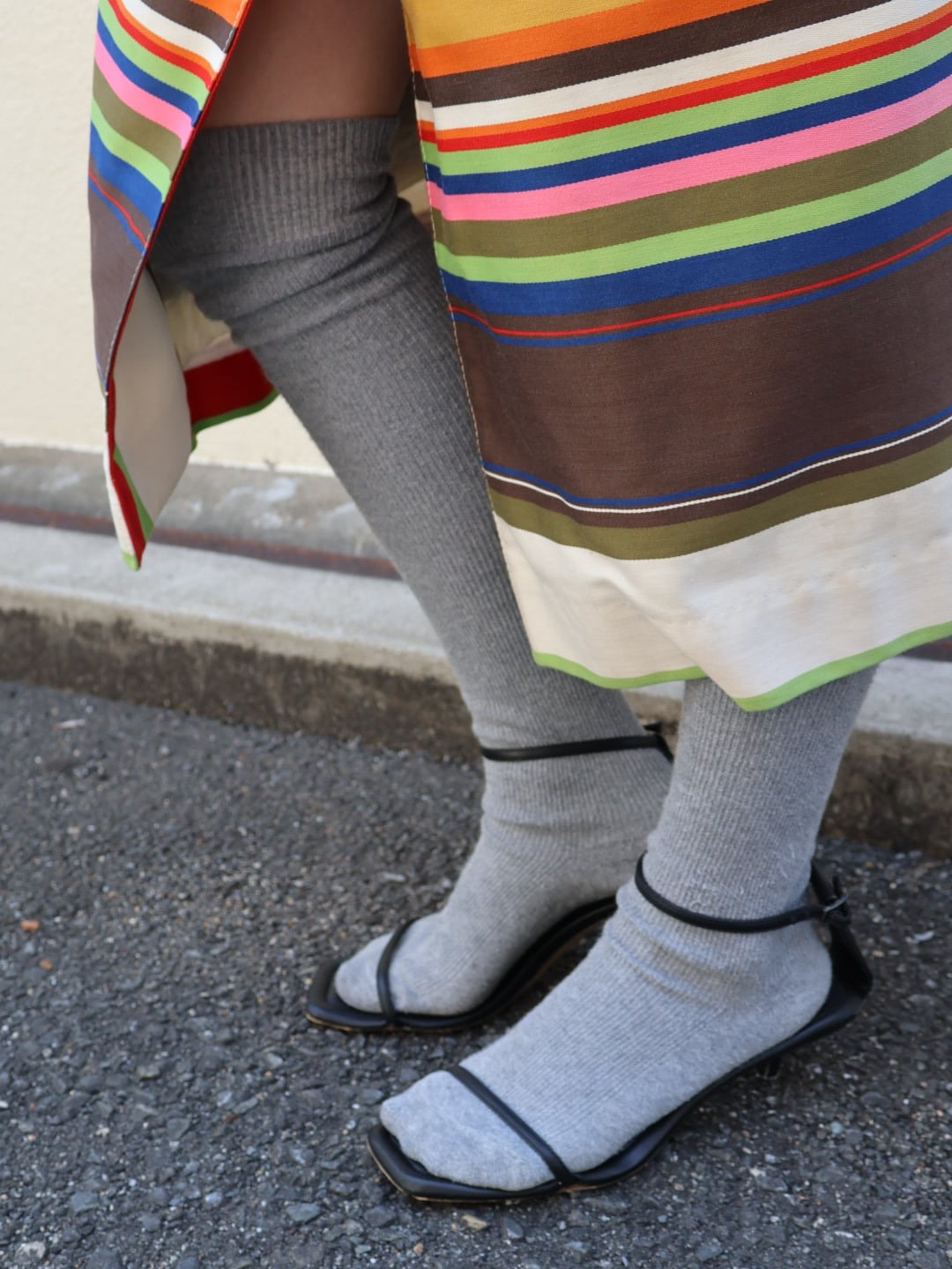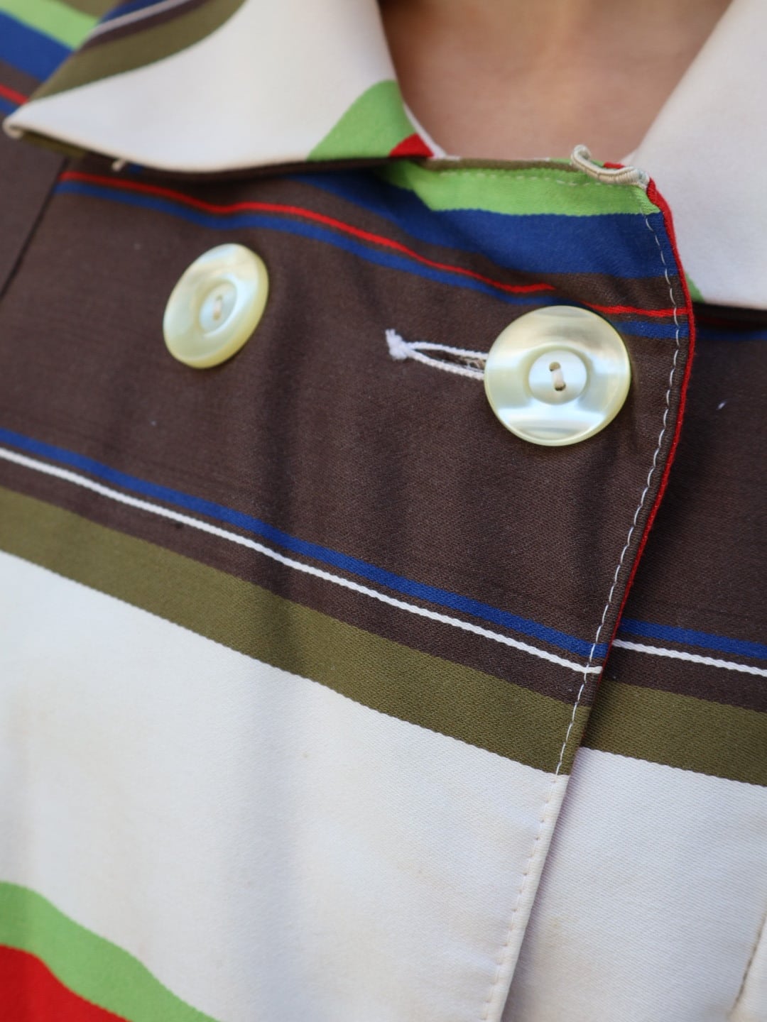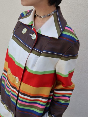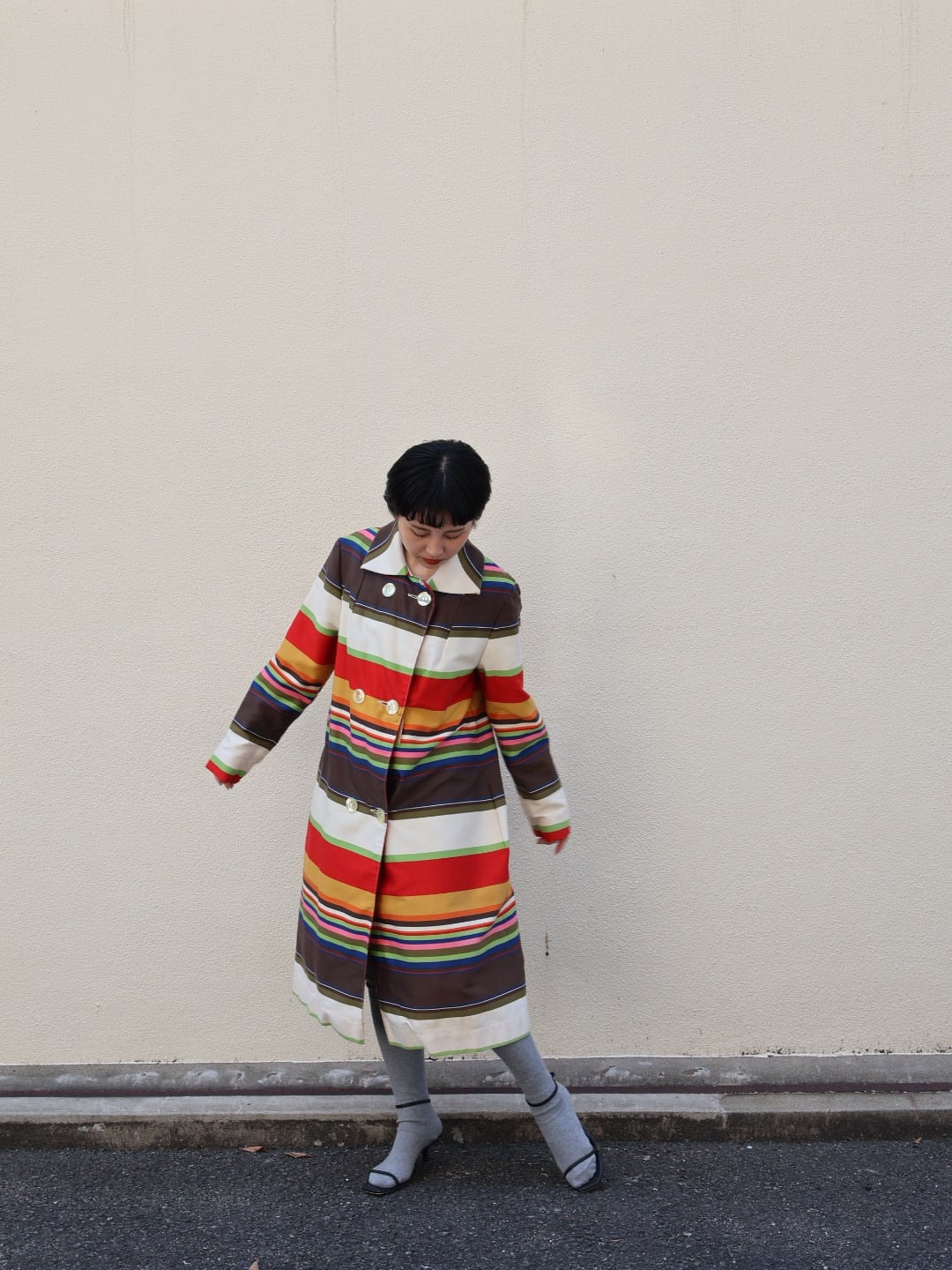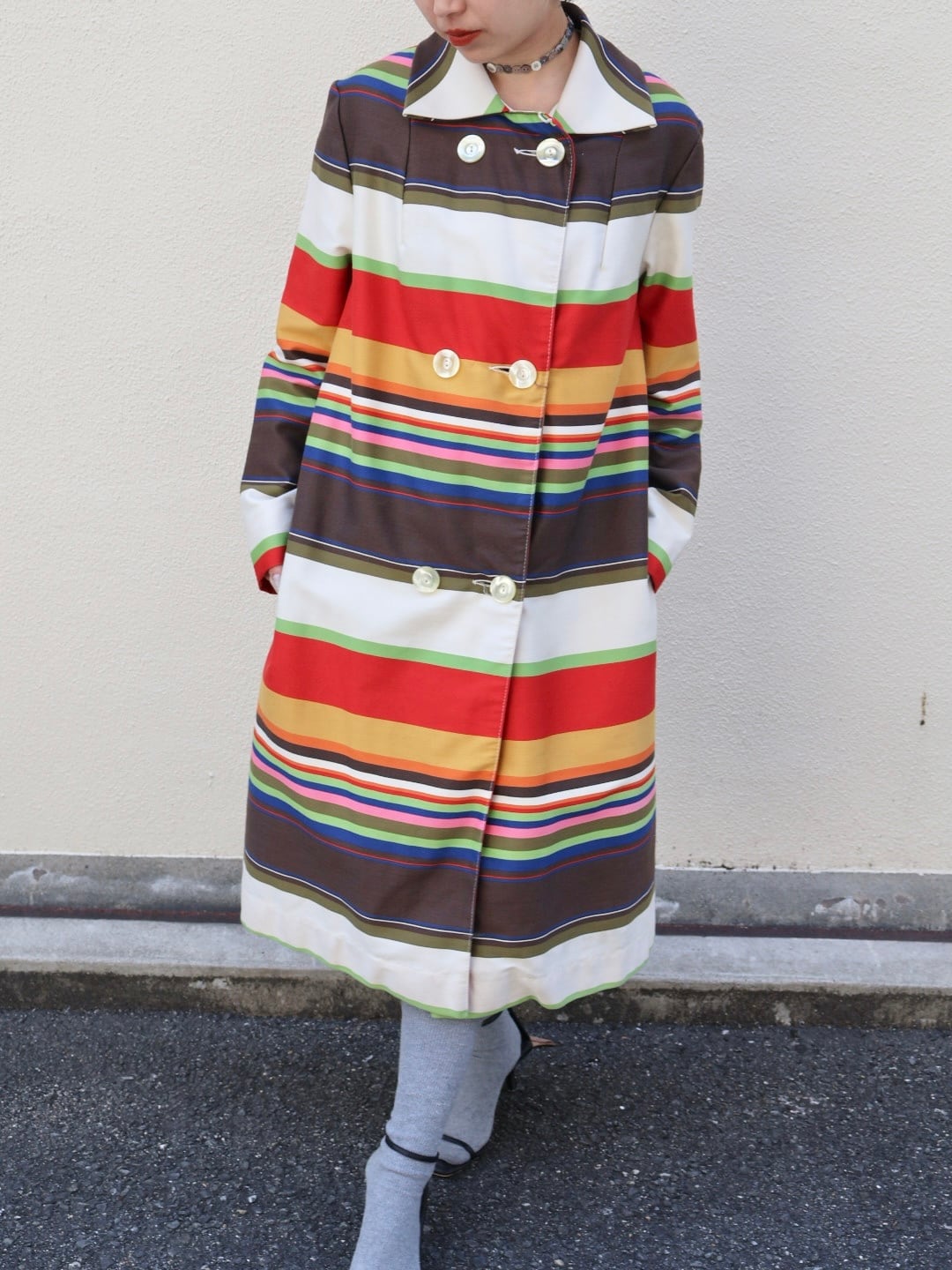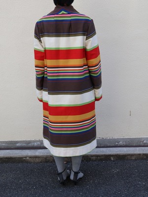 カラフルなマルチカラーのボーダー柄が目を引くコート。