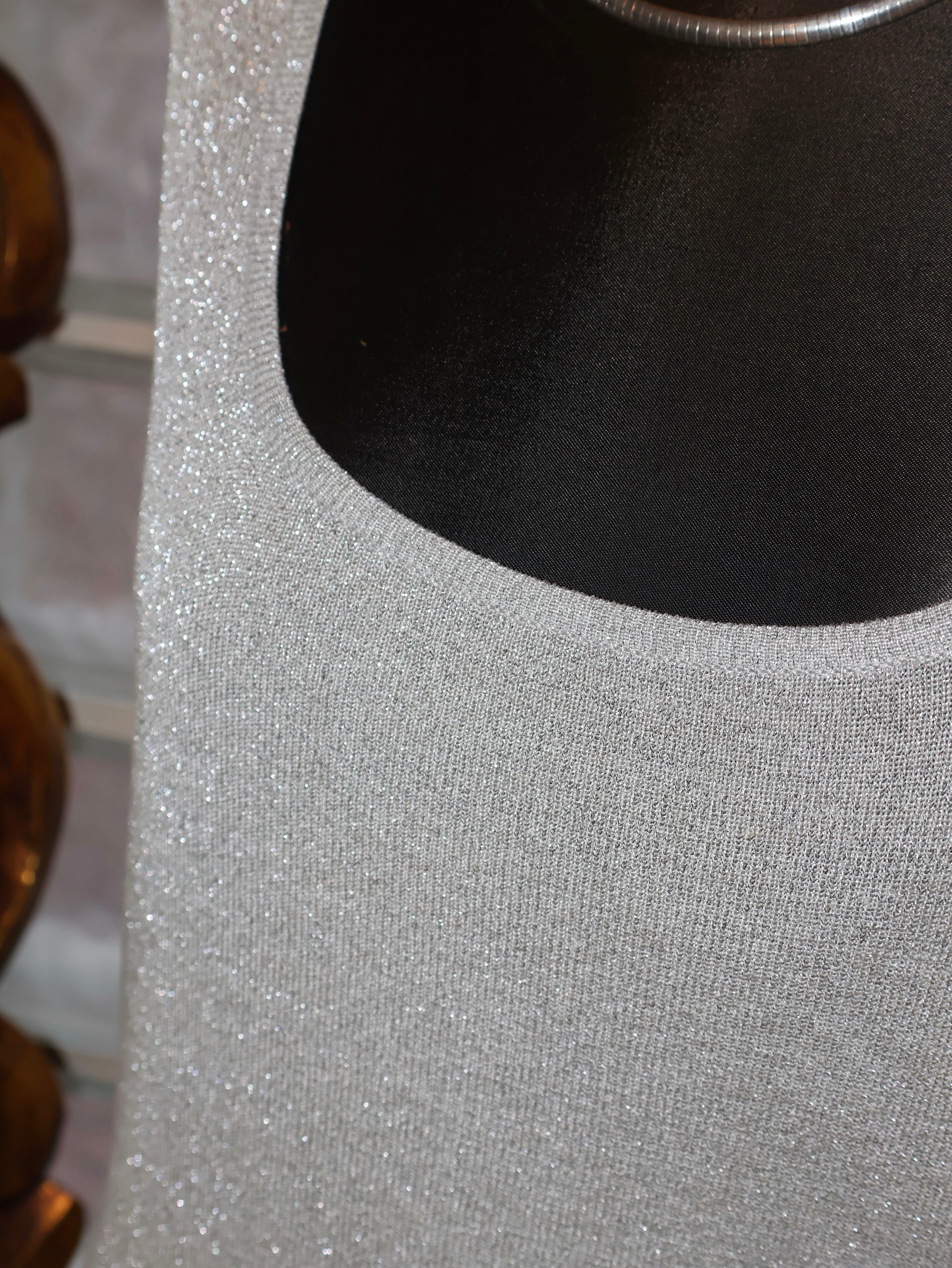 光沢感がのあるメタリックシルクのスリーブレストップス。シルクの素材も良く伸縮性もあるので使い勝手は抜群。