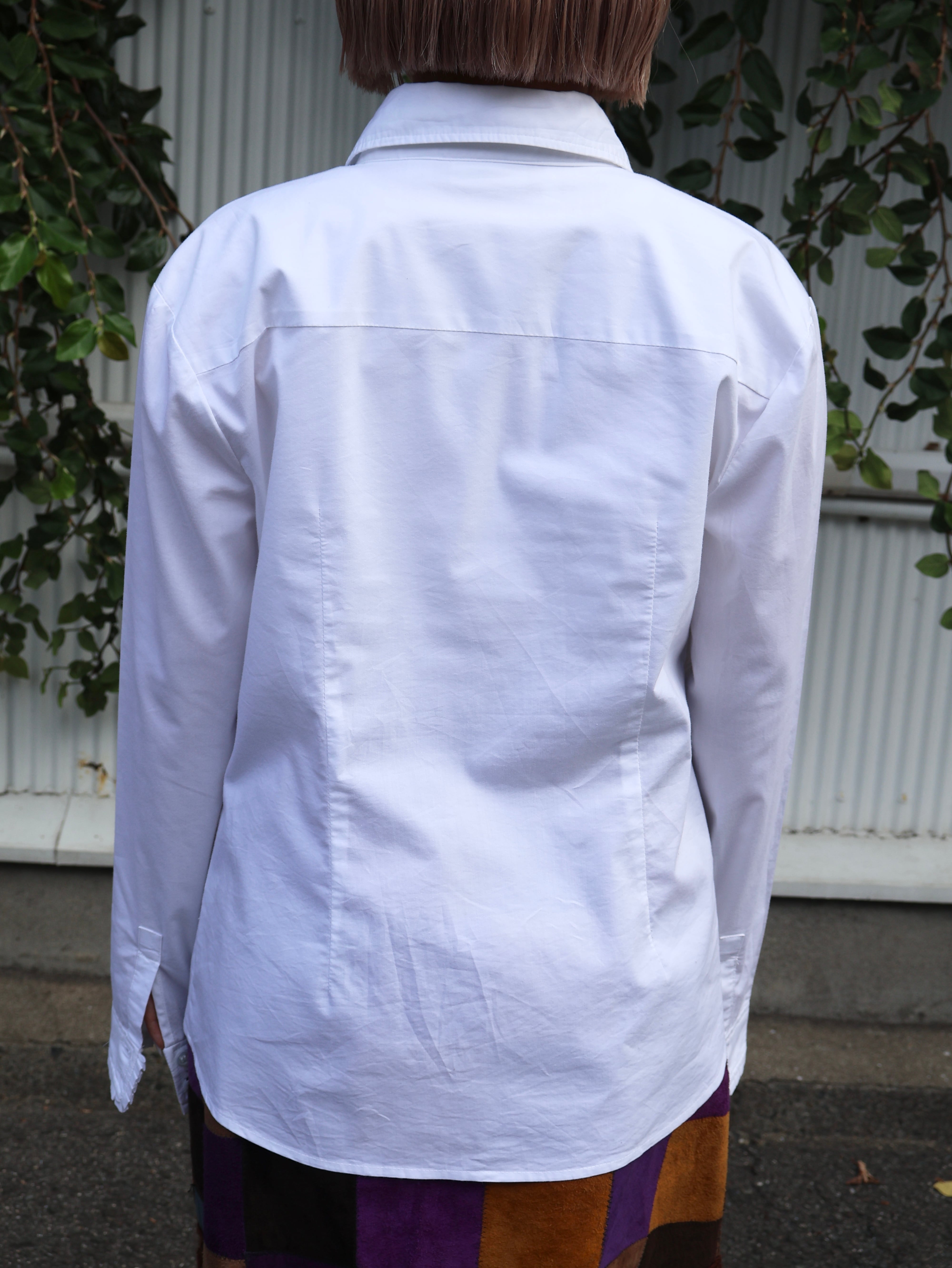 シンプルな中にも、フロントや襟・カフスにさりげなく施されたフリルが上品で可愛らしい一着。