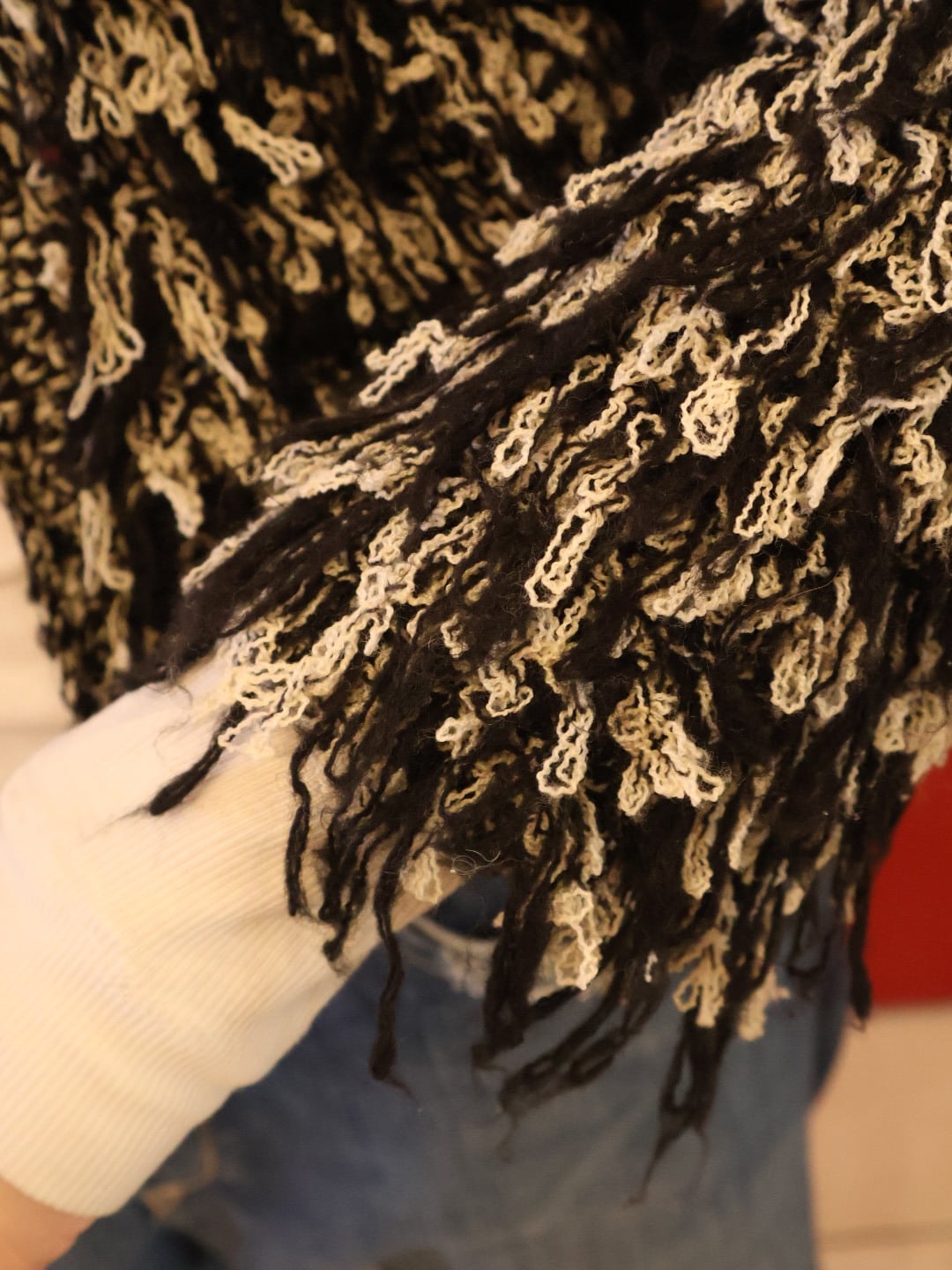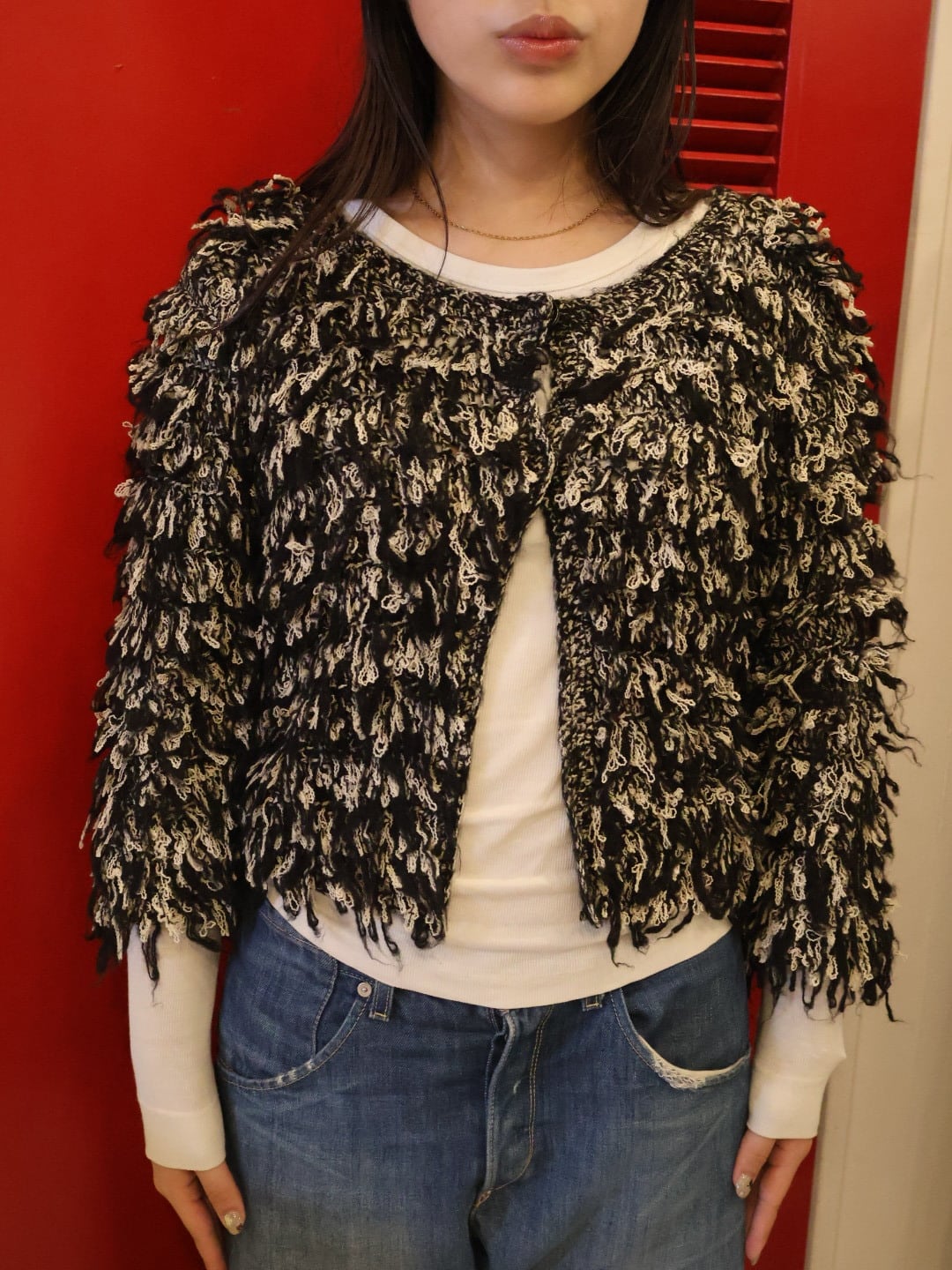 フリンジのような動きのある、ループ編みで編まれたニットカーディガン。