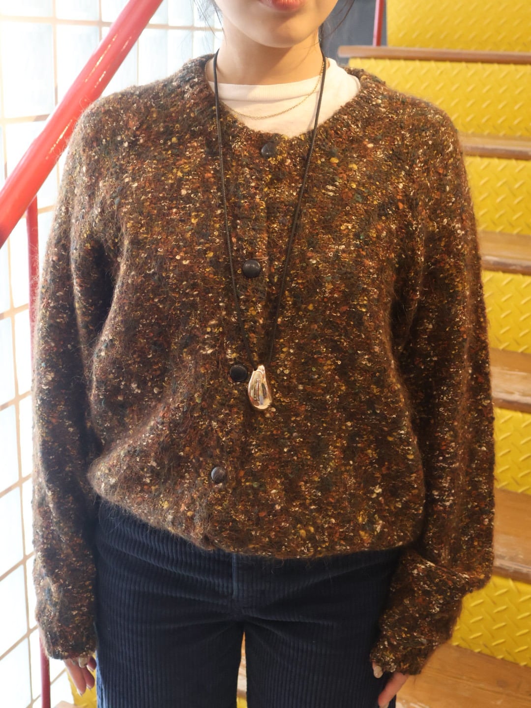 ブラウンベースに、オレンジやホワイト、グリーンなど、様々なカラーの糸で編まれたモヘアニット。アクリル混の軽い着心地は、長い時期活躍する一枚。身幅に対して着丈の長すぎないシルエットは、どんなスタイルにもハマるアイテムかと。さっと羽織でも活躍する一着です◎