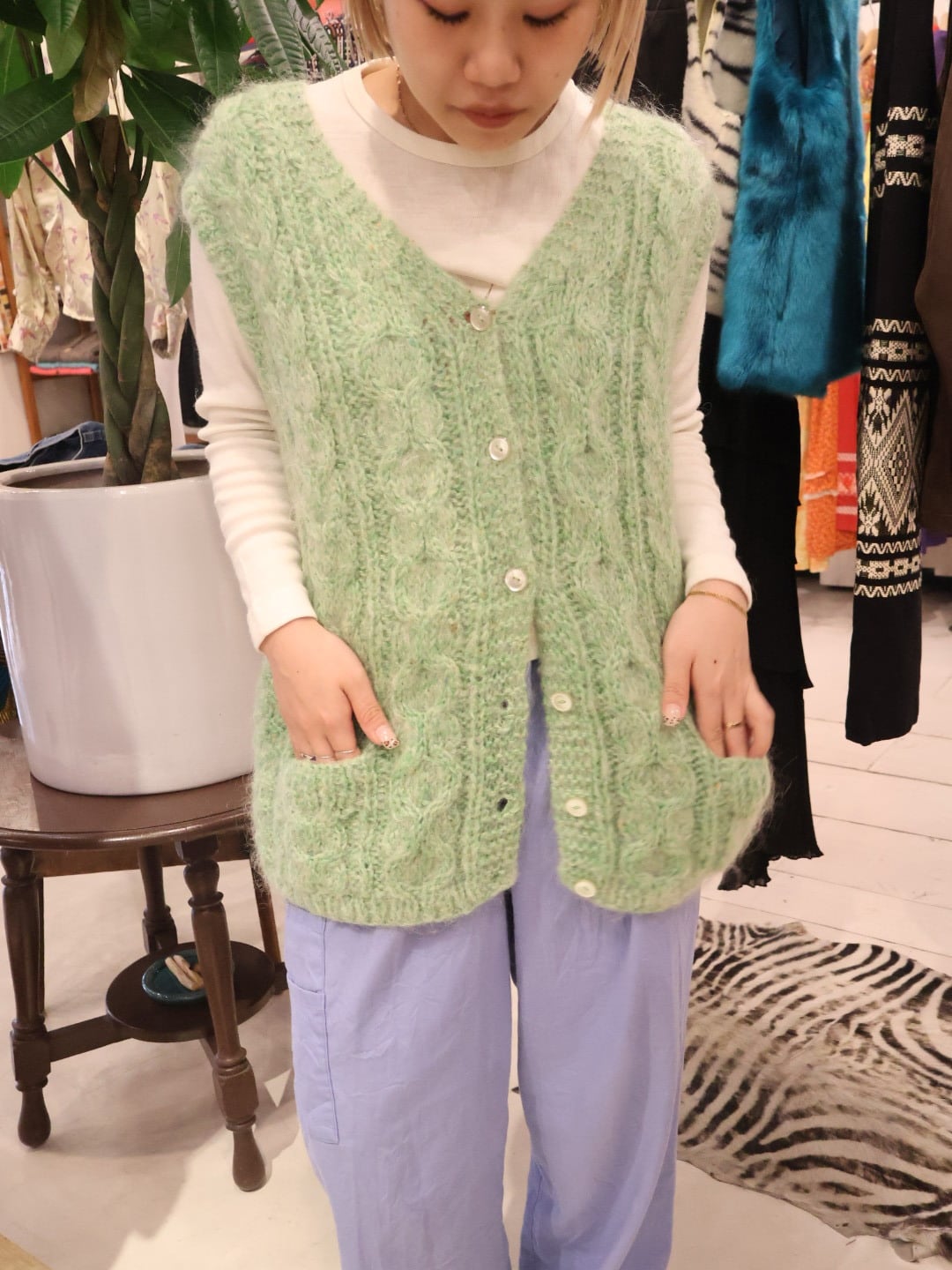 よく見ると、オレンジやブルーなどのカラーネップで編まれています。ケーブル編みでざっくりと編まれたローゲージ感がたまりません。ふんわりと柔らかで、ちくちくしづらいのもポイント。ロンTやシャツと合わせてどうぞ◎