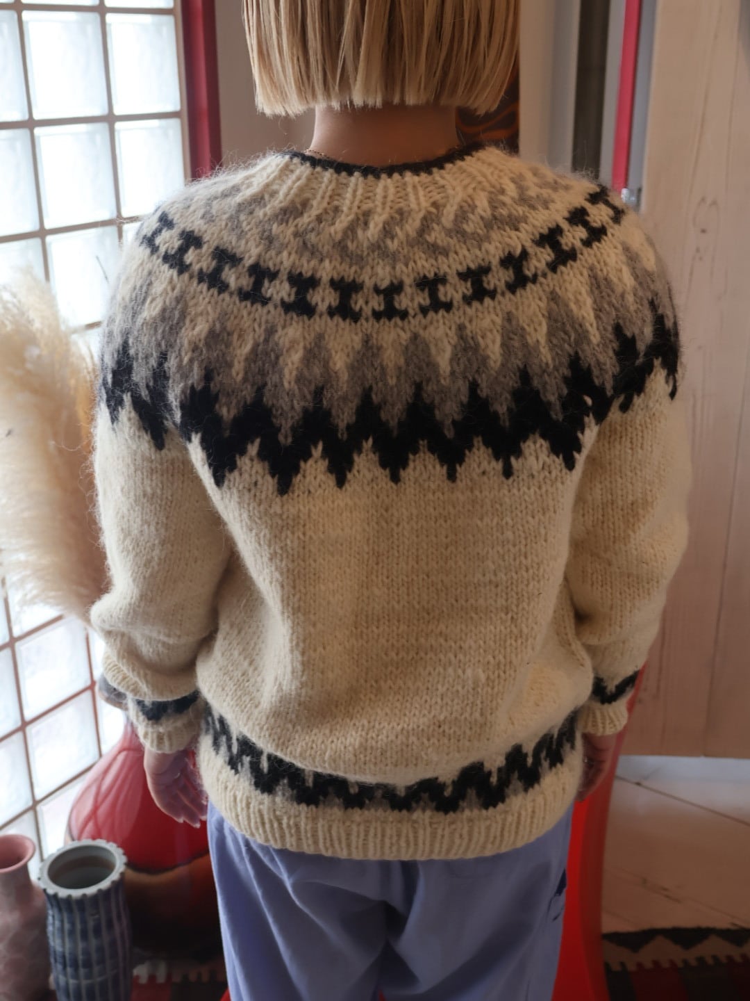 モノトーンですっきりと着られるノルディックニット。目の詰まったウール素材ながら、軽い着心地で暖かさも備えた一枚。どんなカラーのアイテムともすんなり馴染む一着は、秋や春の中間季も羽織で活躍します。