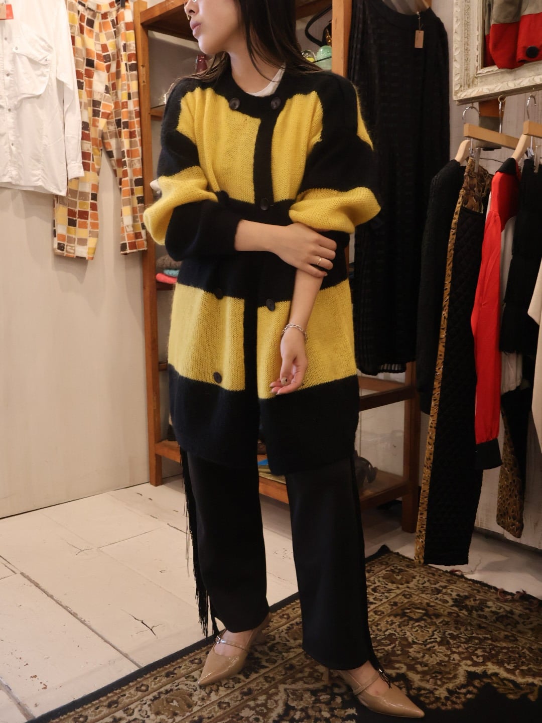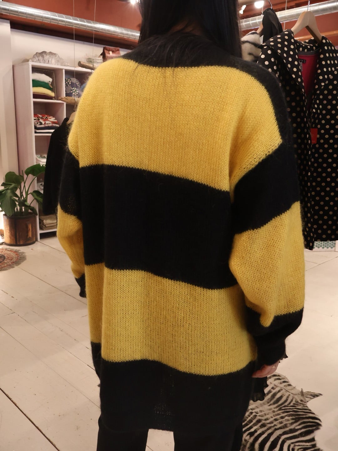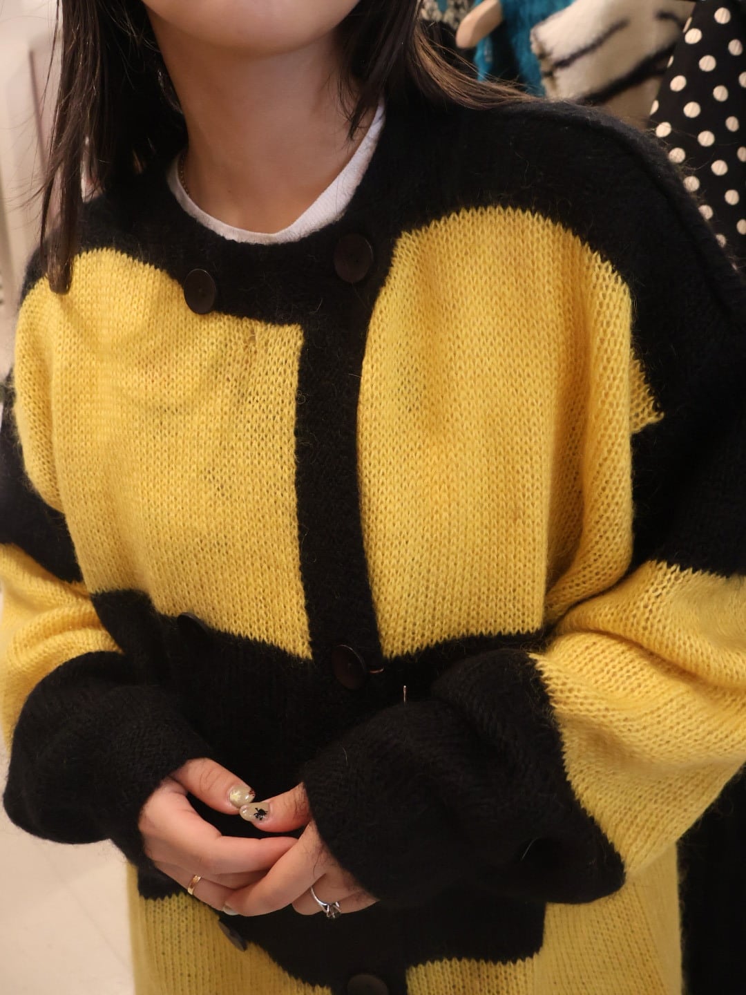 イエロー×ブラックの太ピッチボーダーが個性的なモヘアカーディガン。
