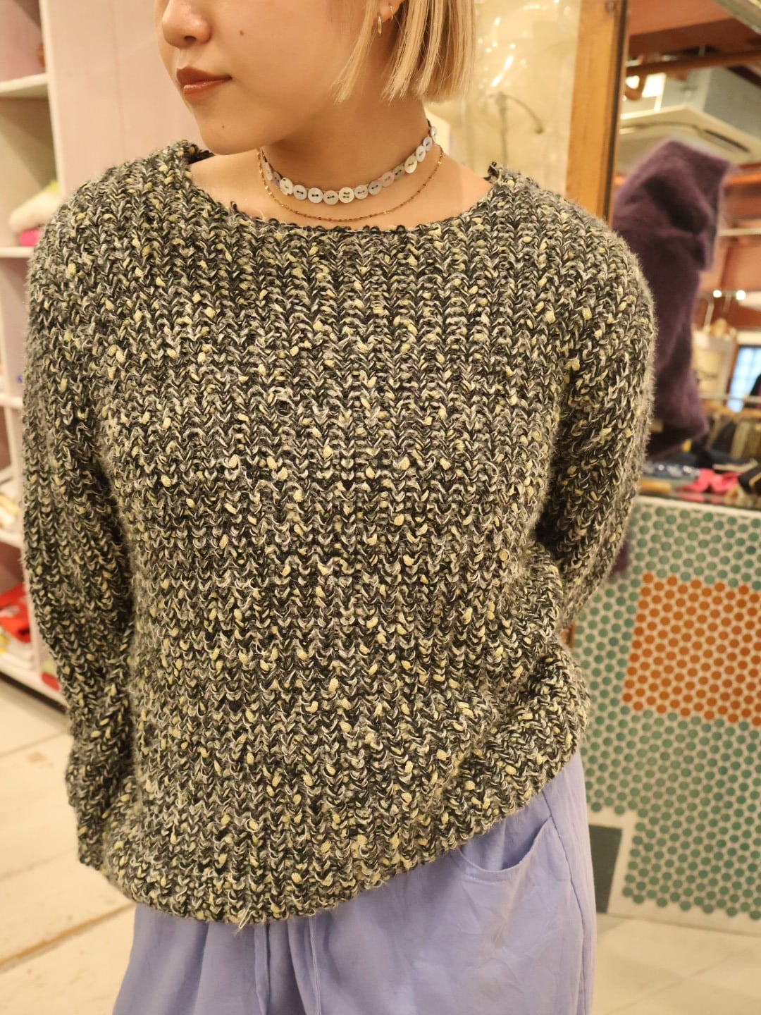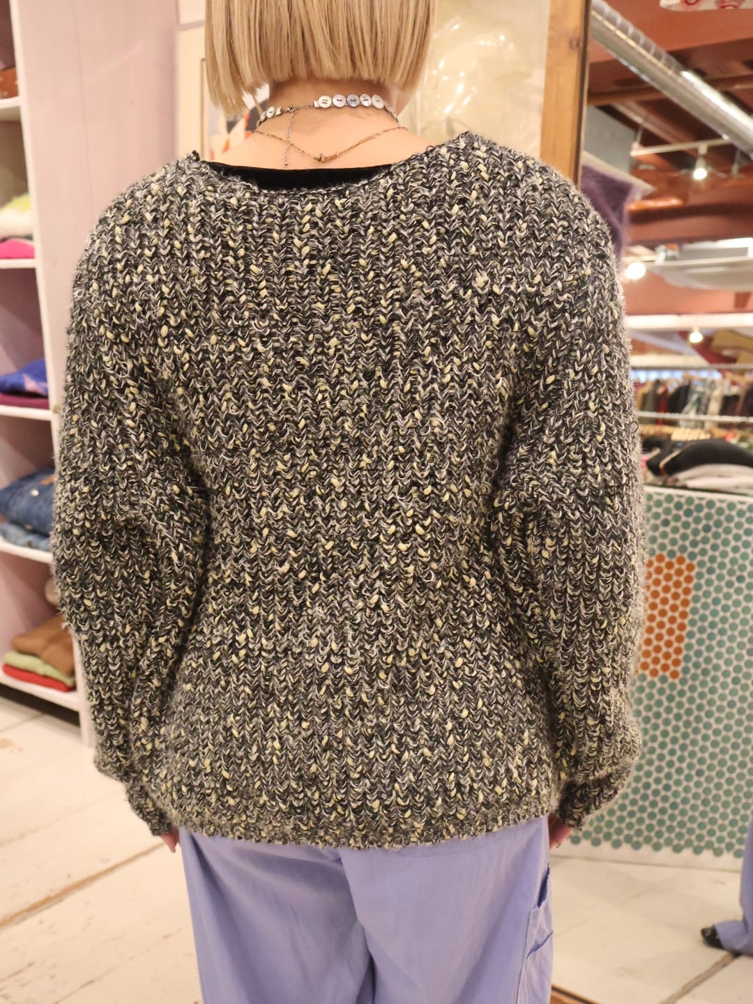 モノトーンを基調にゴールドのラメ糸が編み込まれた一着。身幅広め、着丈は短めのボックスシルエット。ふんわりとボリュームのある、丸いシルエットにきゅんときます。ざっくりとローゲージで軽く着られ、全体的に伸縮性があり、着心地も楽ちん。カジュアルも綺麗目もハマる一着かと◎