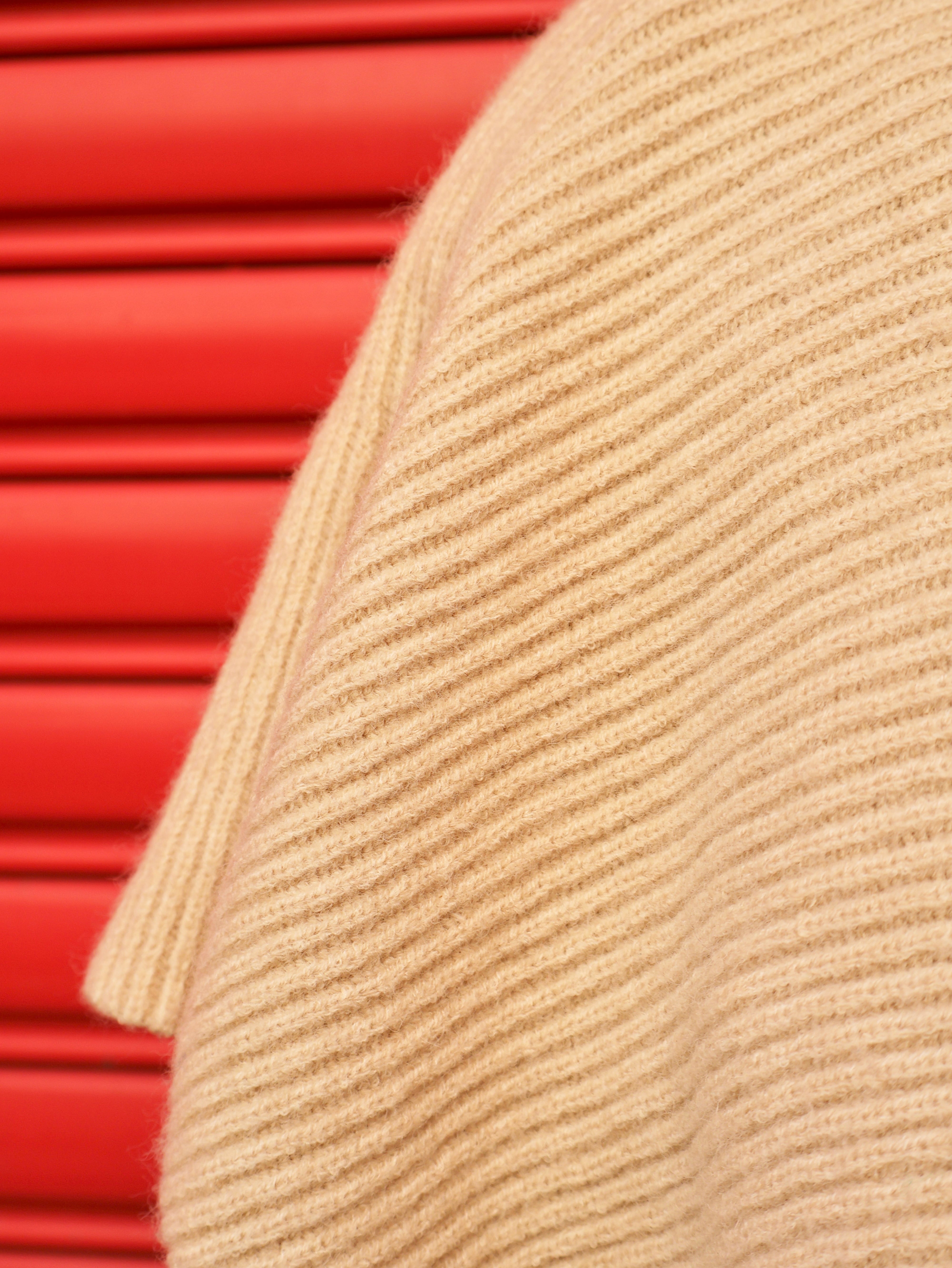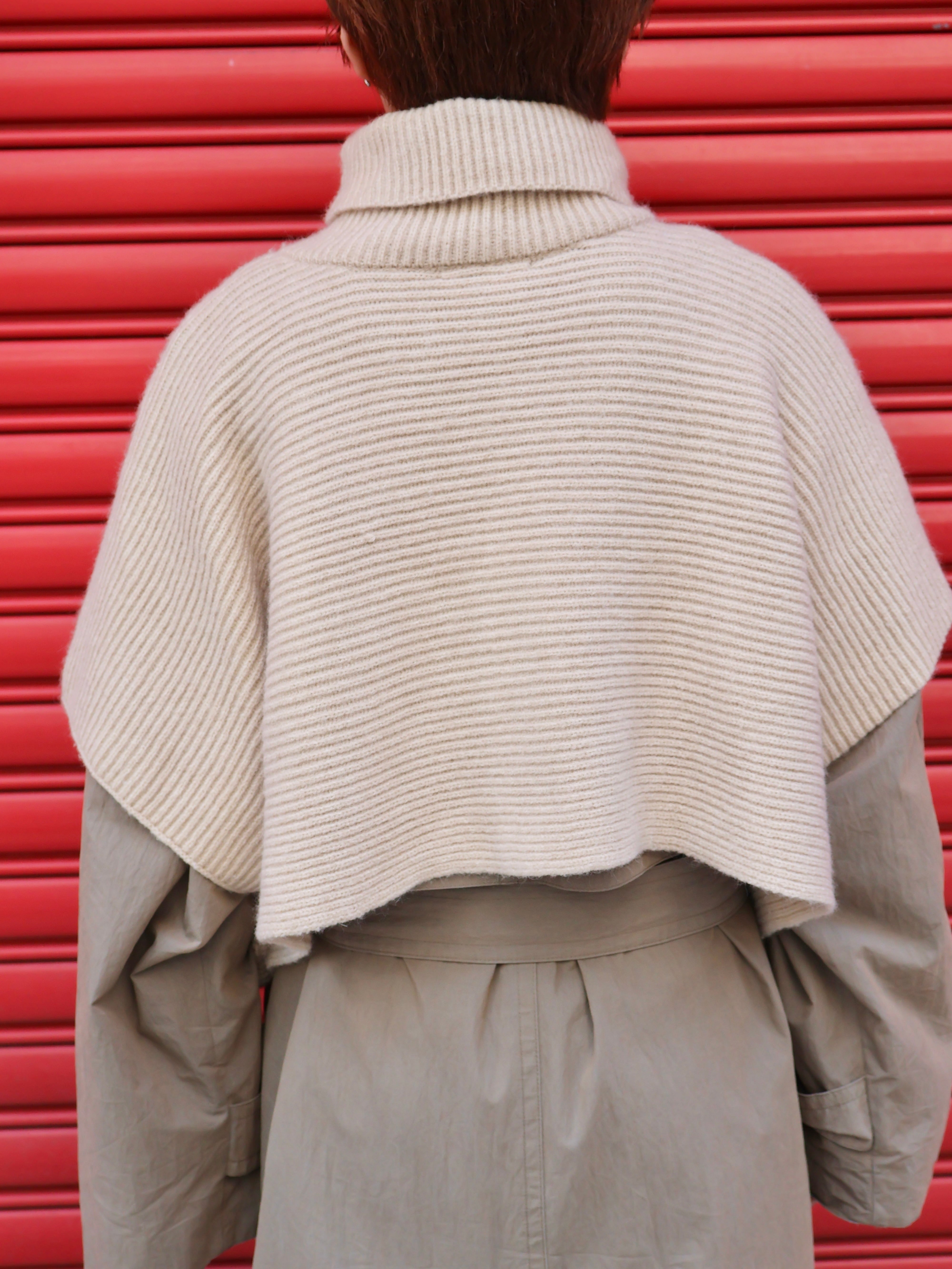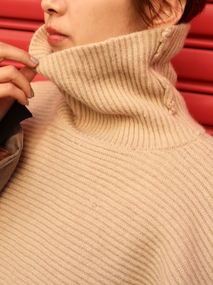 柔らかく暖かいリブニットのハイネックデザイントップス。