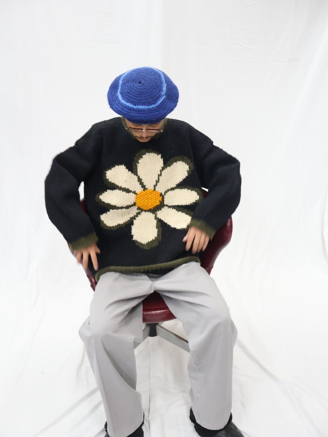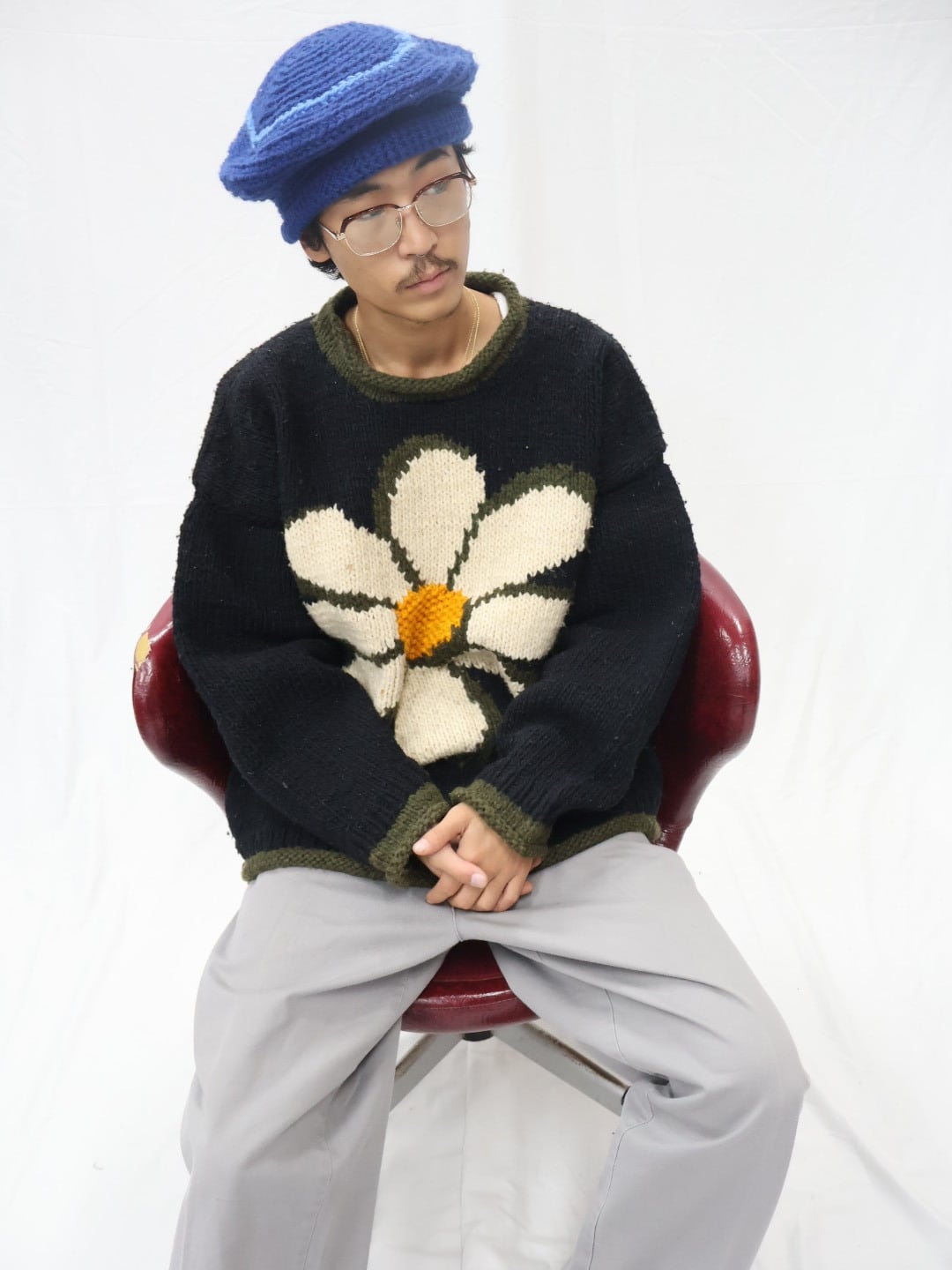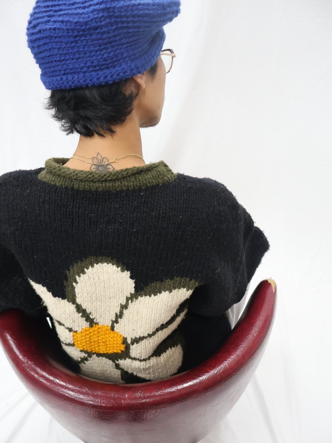 エクアドルで手編みされた、あたたかみのある一枚。ざっくり着られるサイズ感と、可愛くなりすぎないブラック×カーキの配色も◎