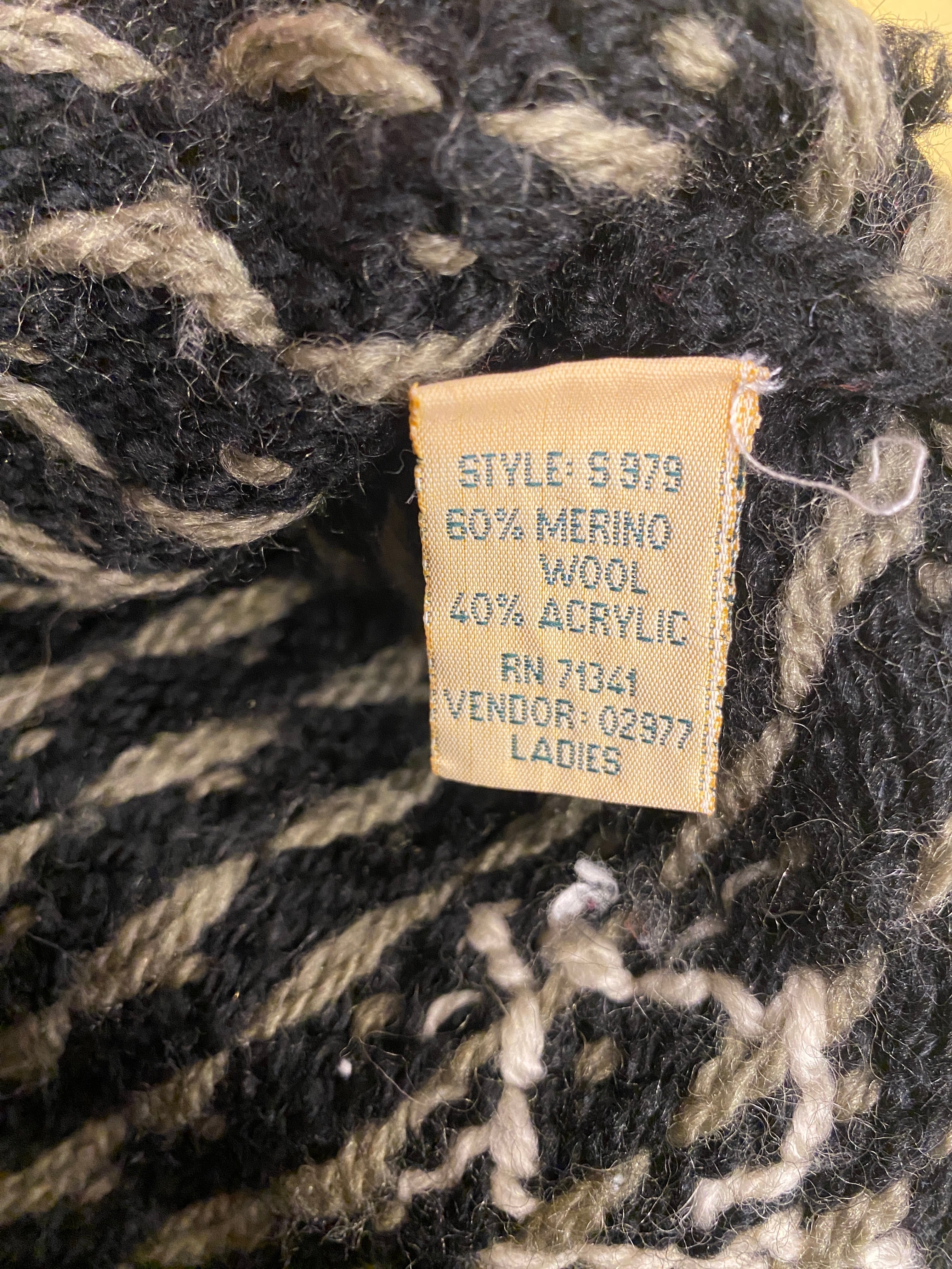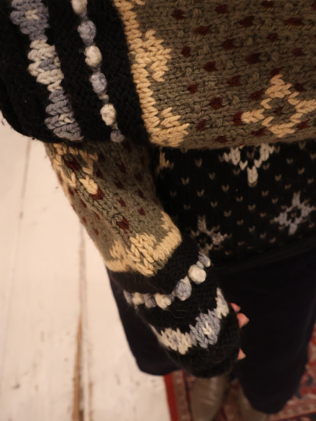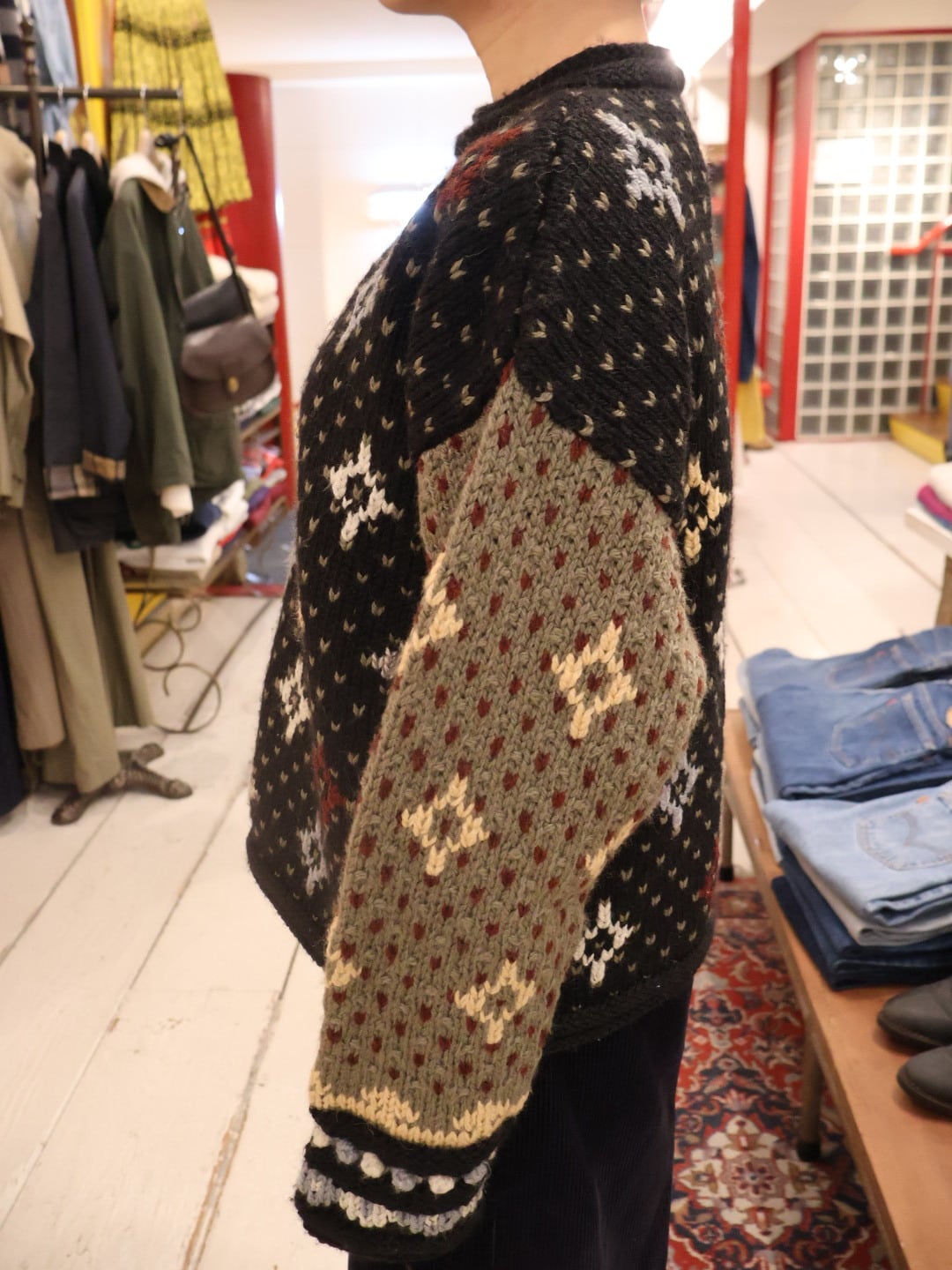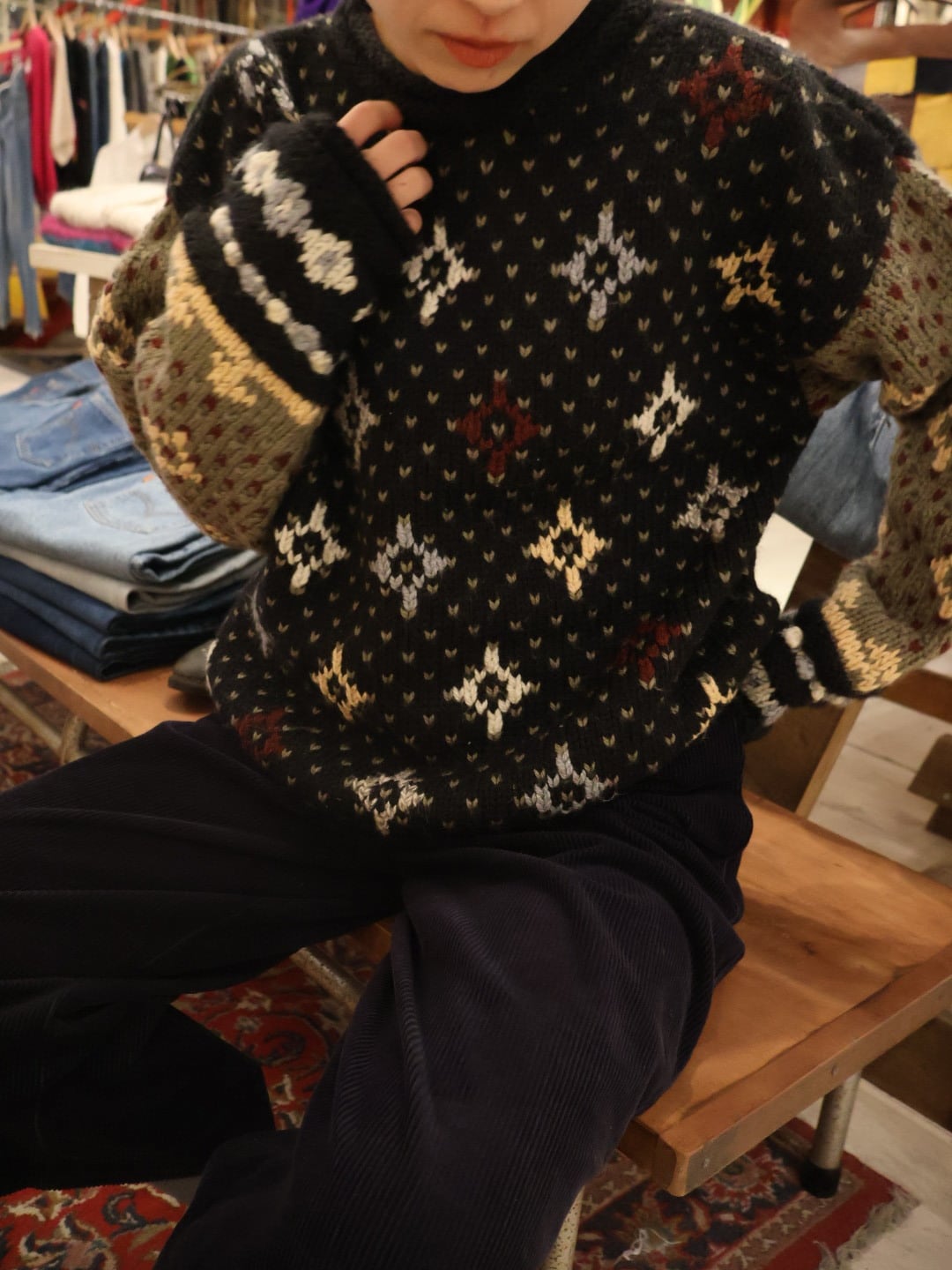 LLBEANの代名詞でもある、バーズアイパターンが全体にあしらわれ、袖口には立体的なぽこぽことした編みが。このような様々な編み柄がMIXされた、贅沢なデザインは手編みならではかと◎