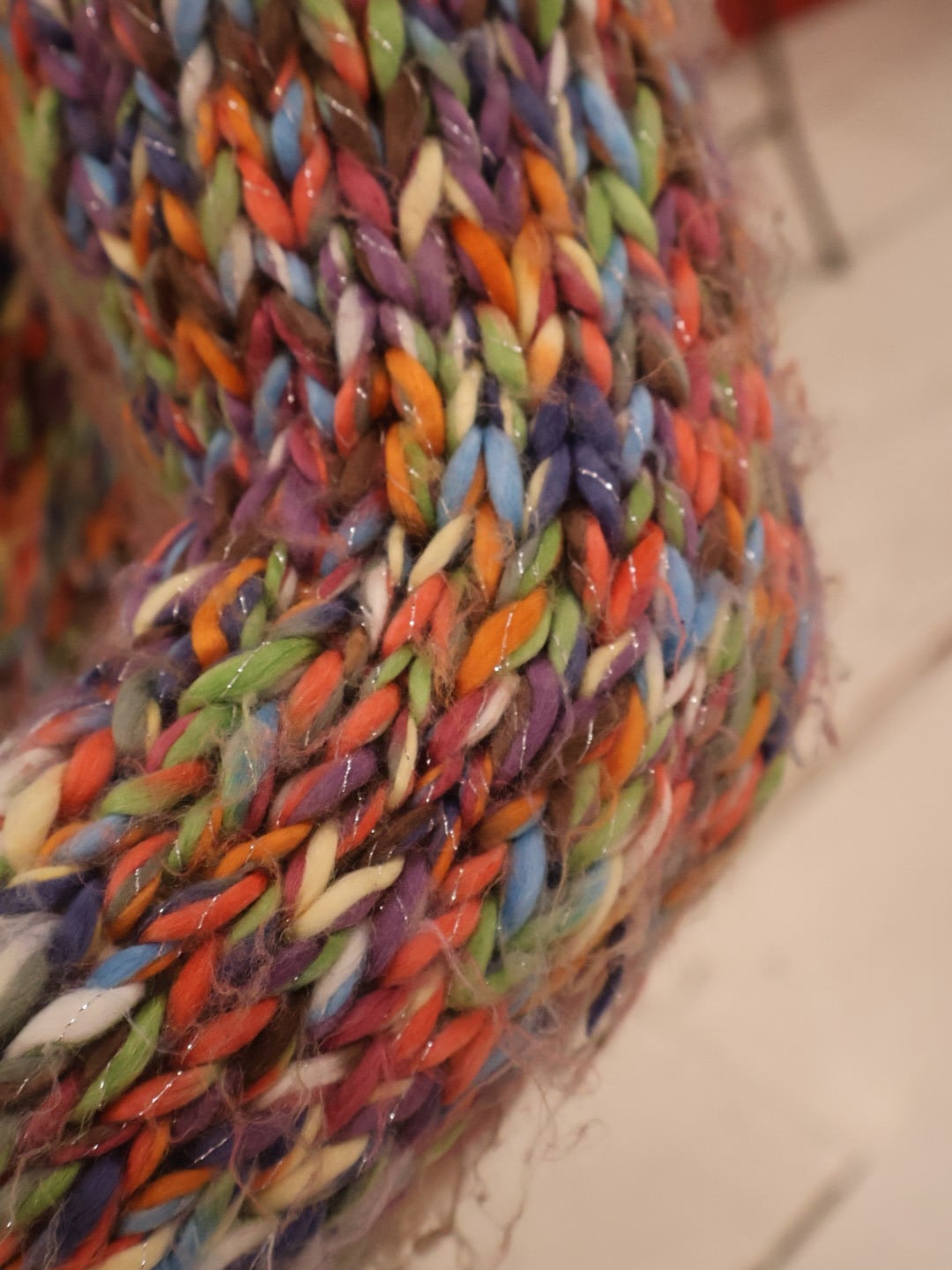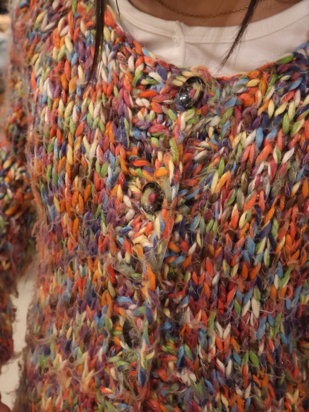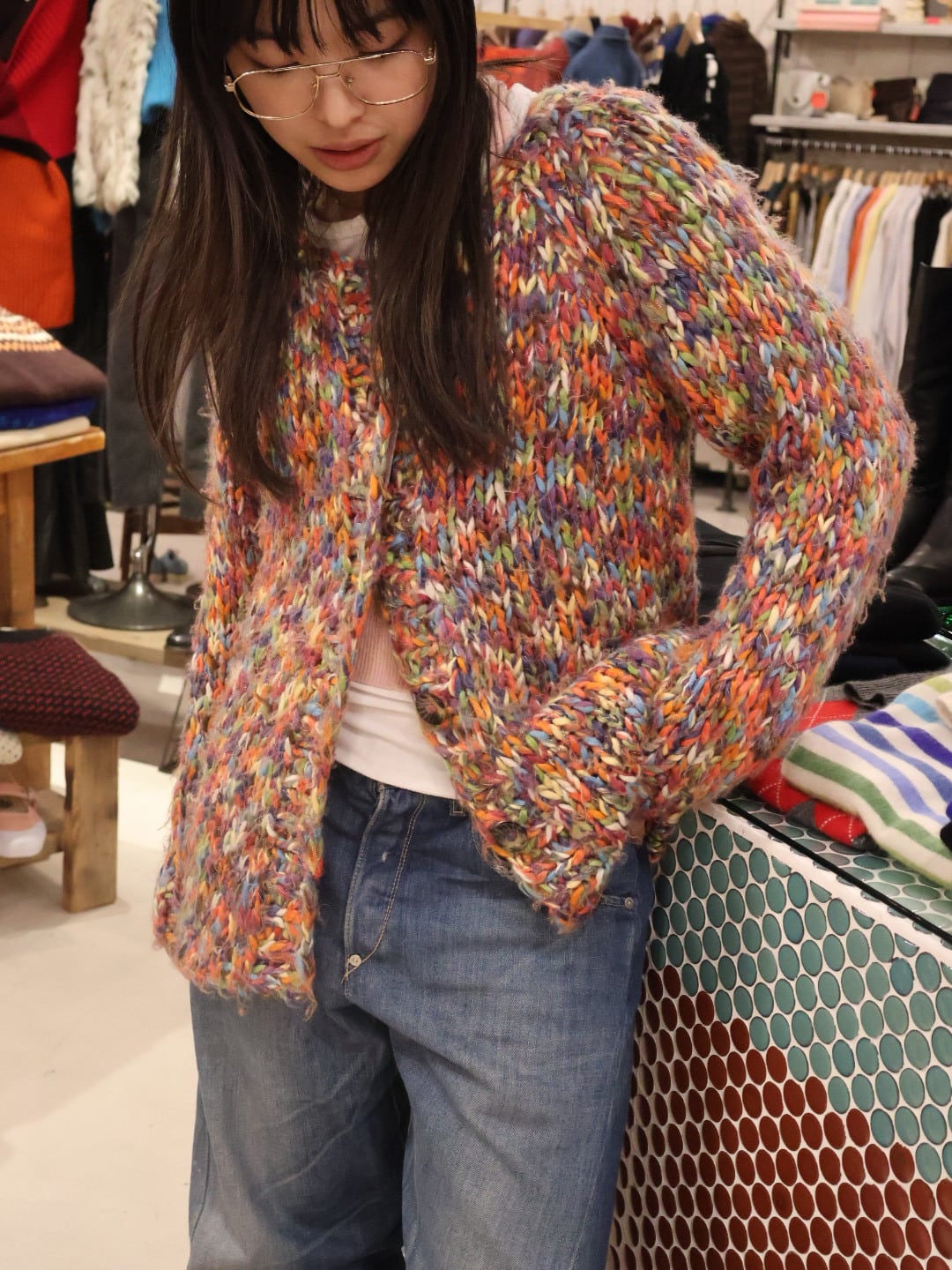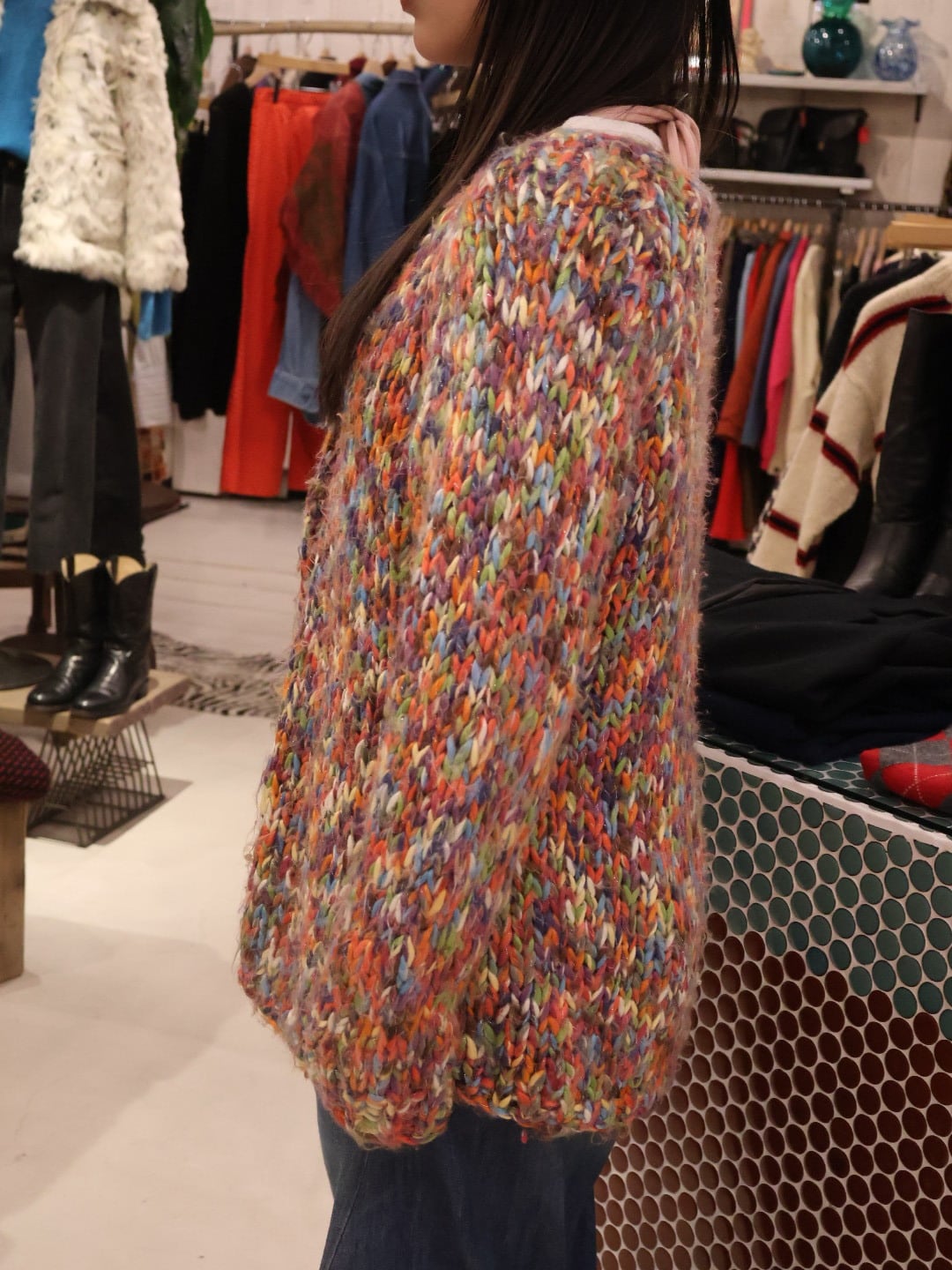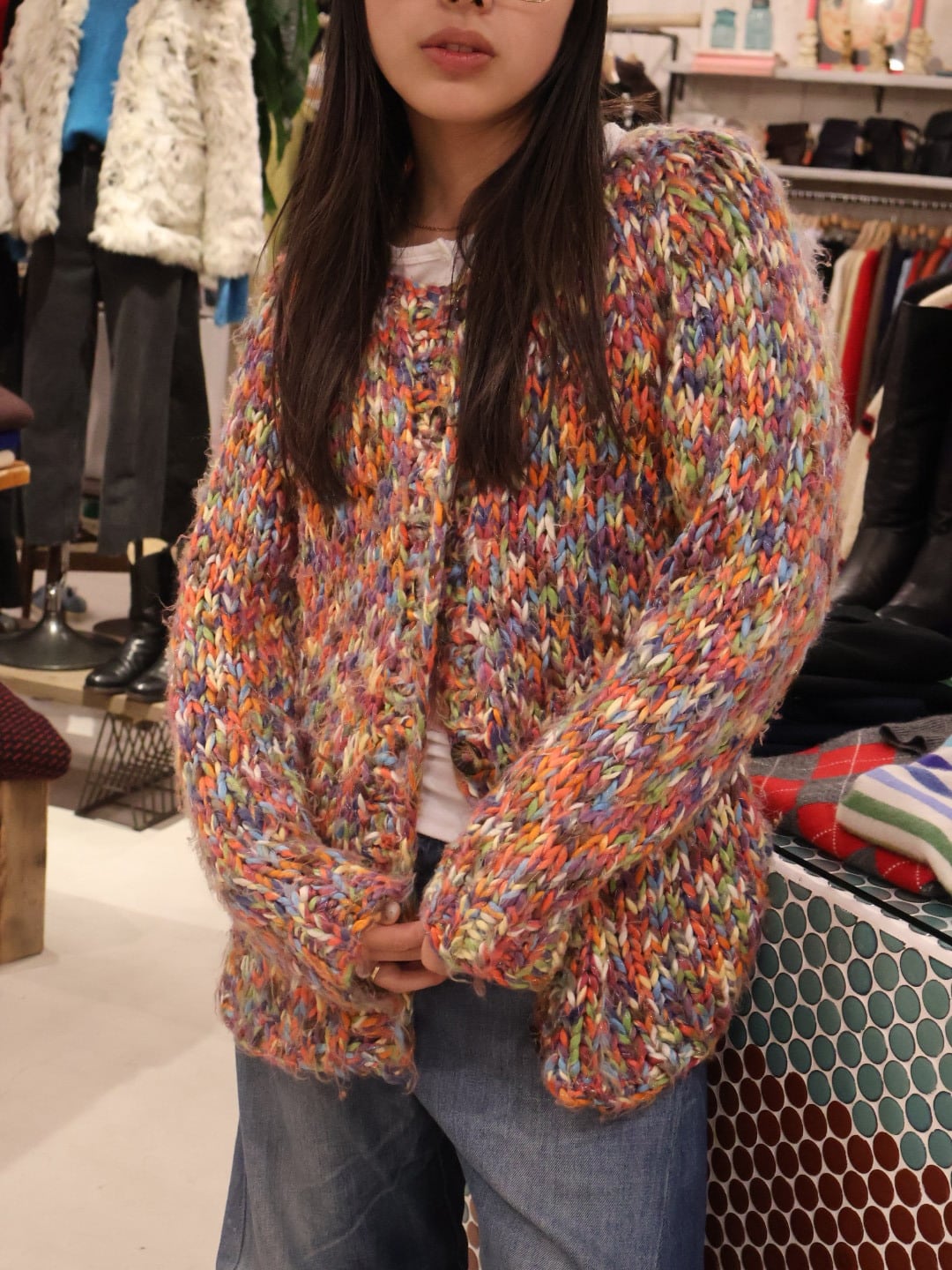 カラフルなミックスカラーが可愛いローゲージニットカーディガン。