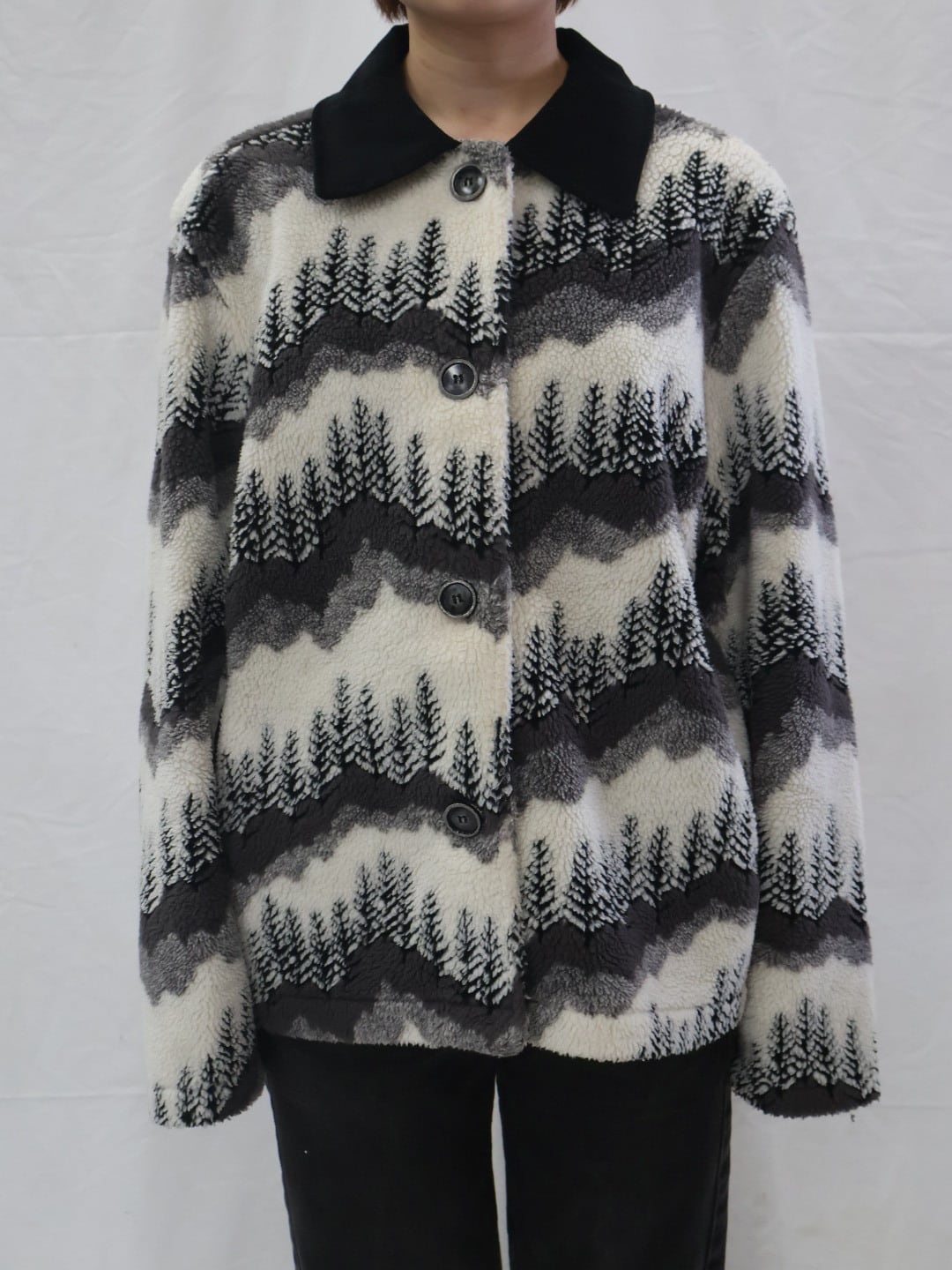 モノトーンカラーのツリー総柄が大人っぽくて可愛いボアフリースジャケット。