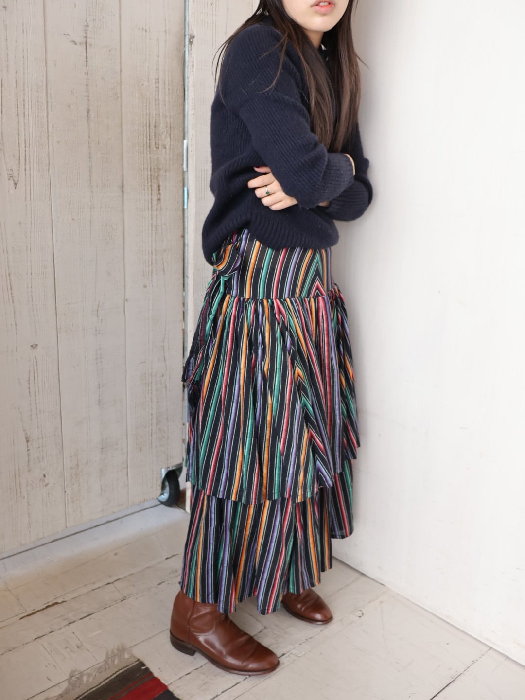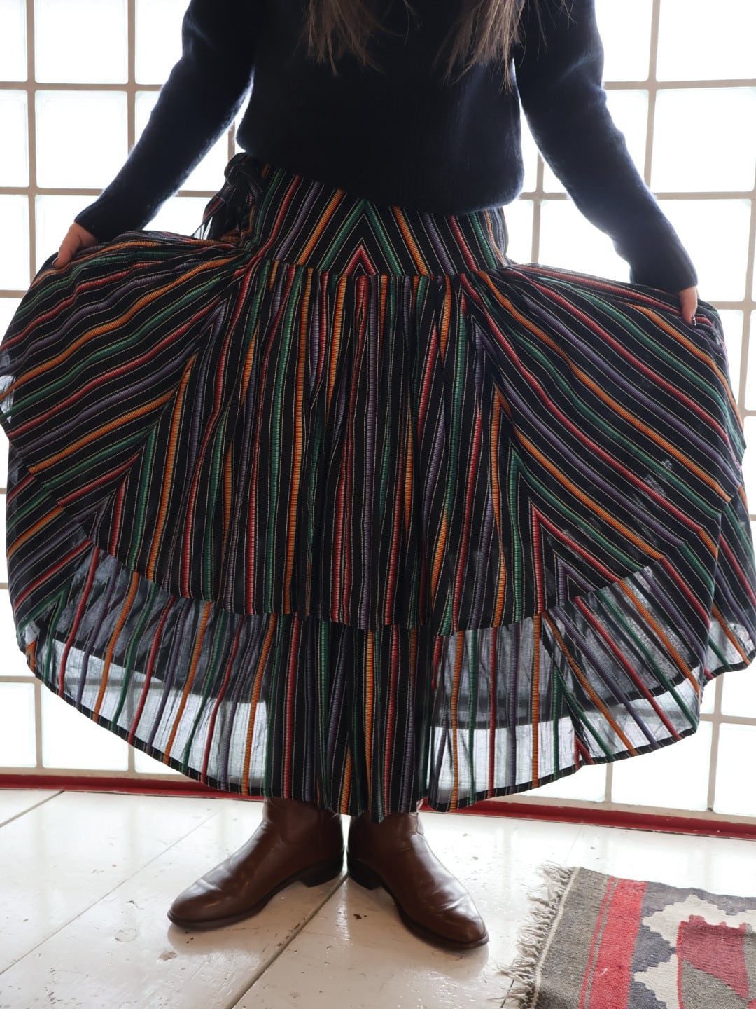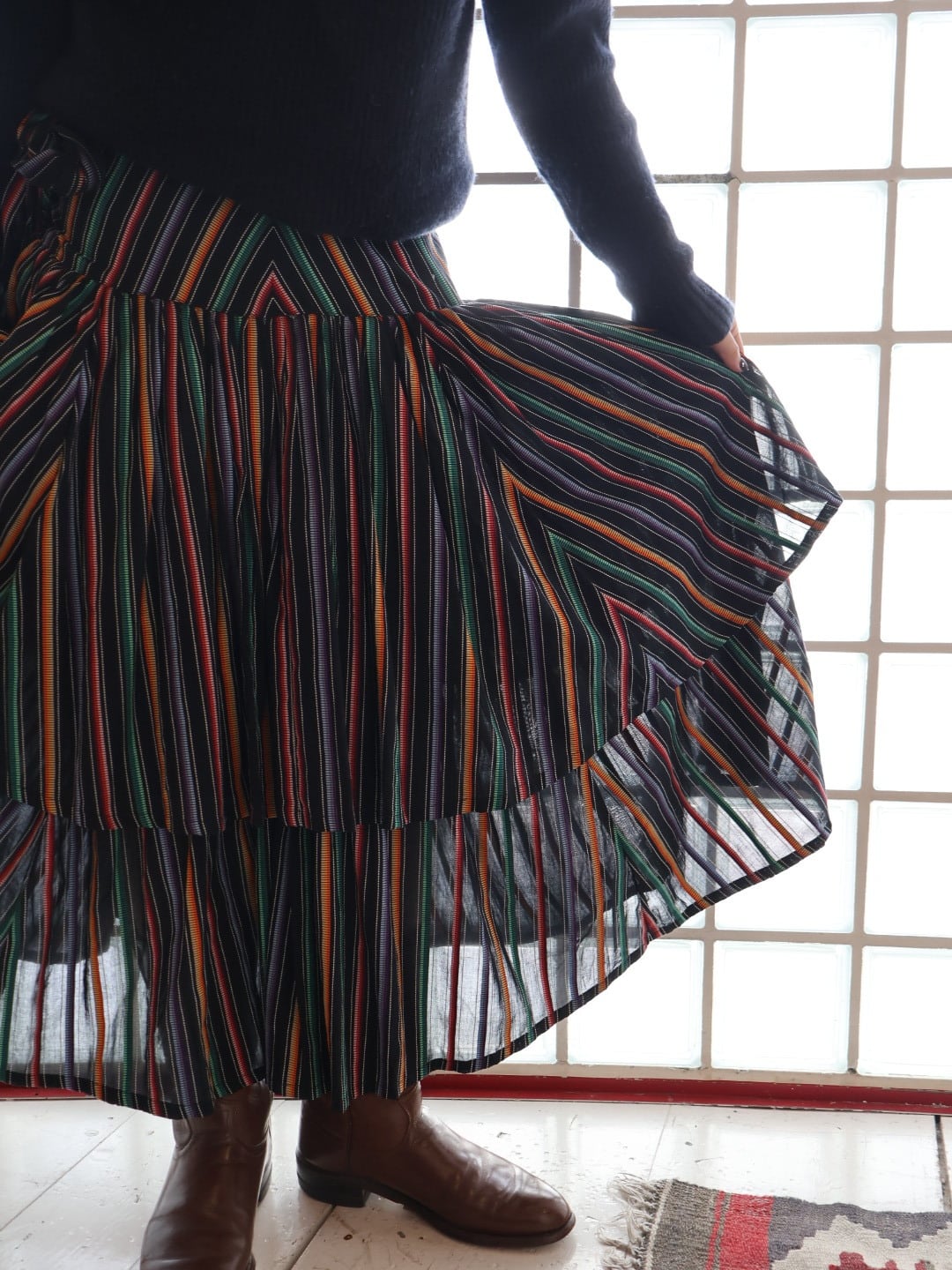 ネイティブの織り柄を彷彿とさせる、マルチカラーのストライプが特徴的なスカート。