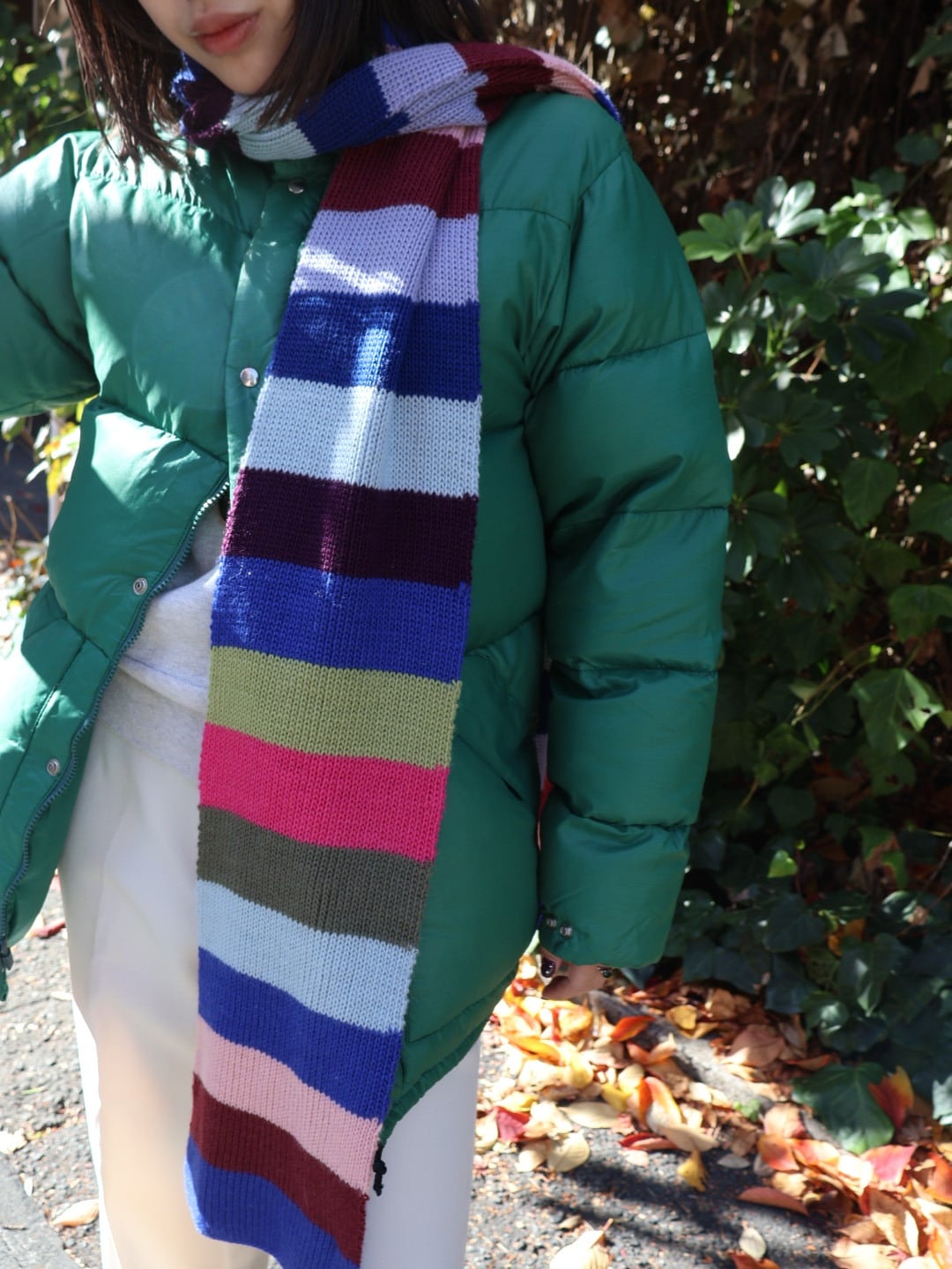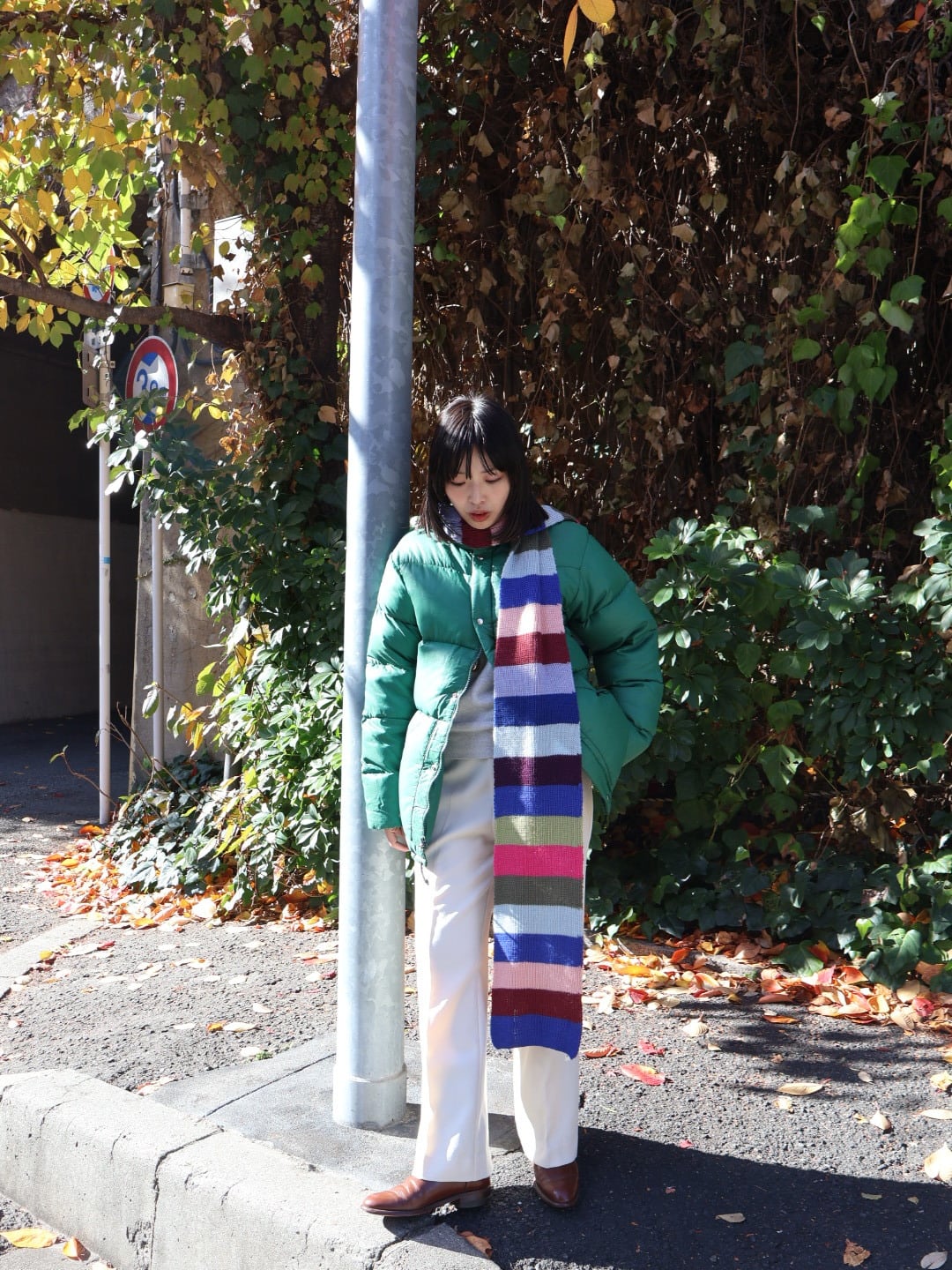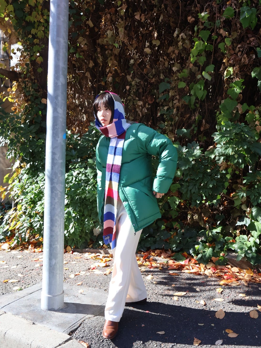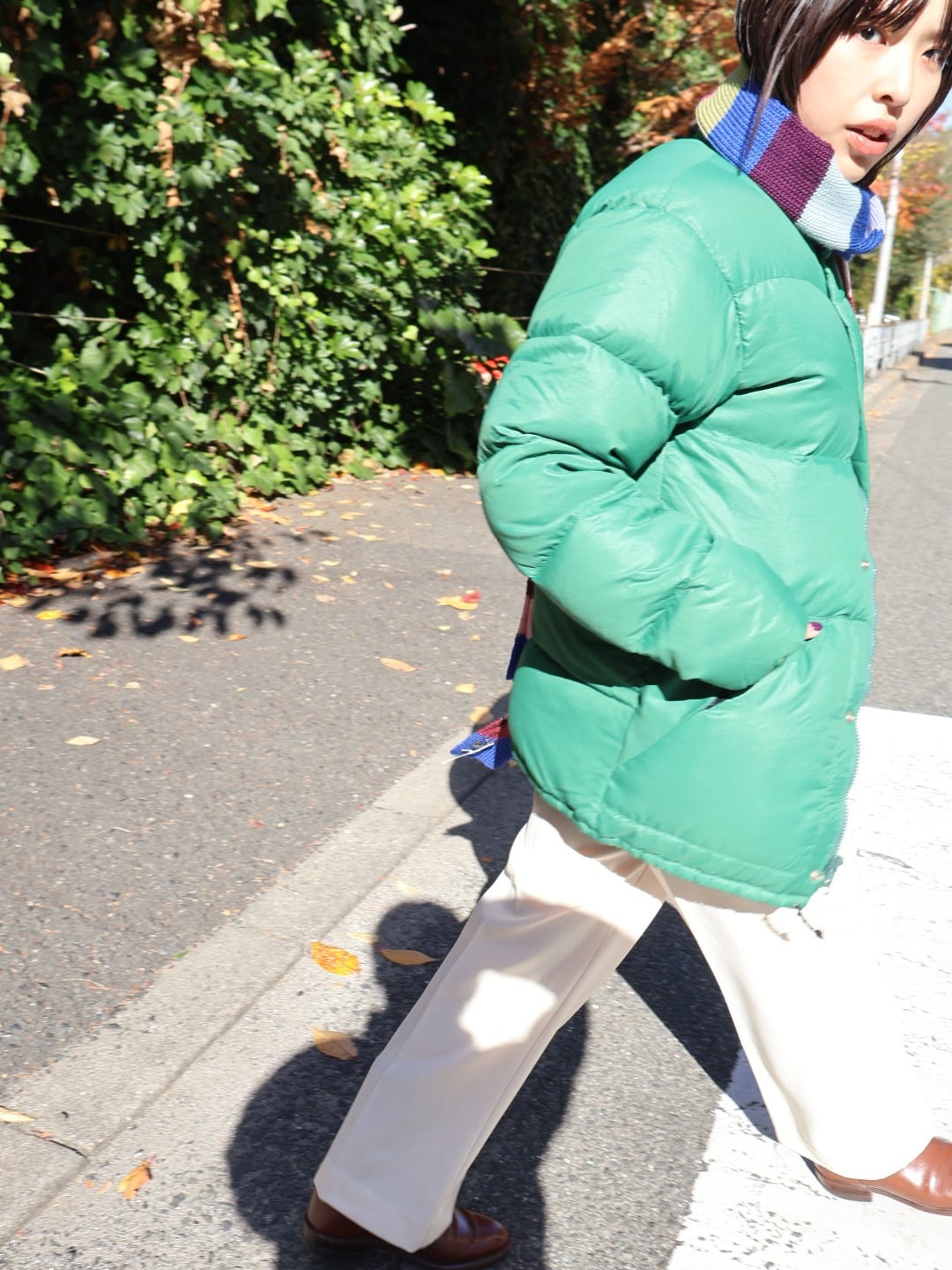 鮮やかなグリーンがスタイリングの主役になるダウンジャケット。暗くなりがちな冬のスタイルも、一気に華やかに。
