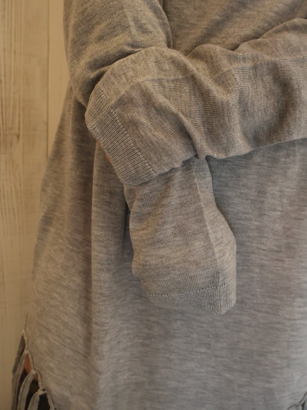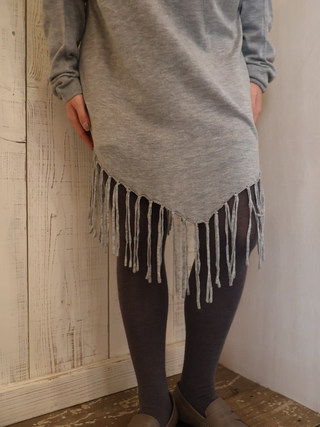 裾にあしらわれたフリンジデザインが特徴的なニット。