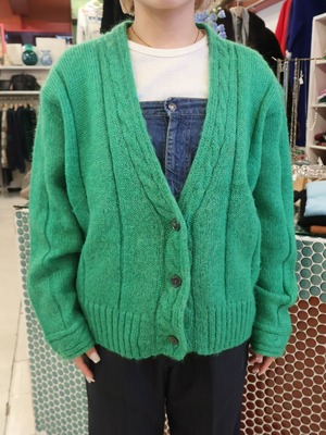 鮮やかなグリーンが冬に映えるモヘアカーディガン。