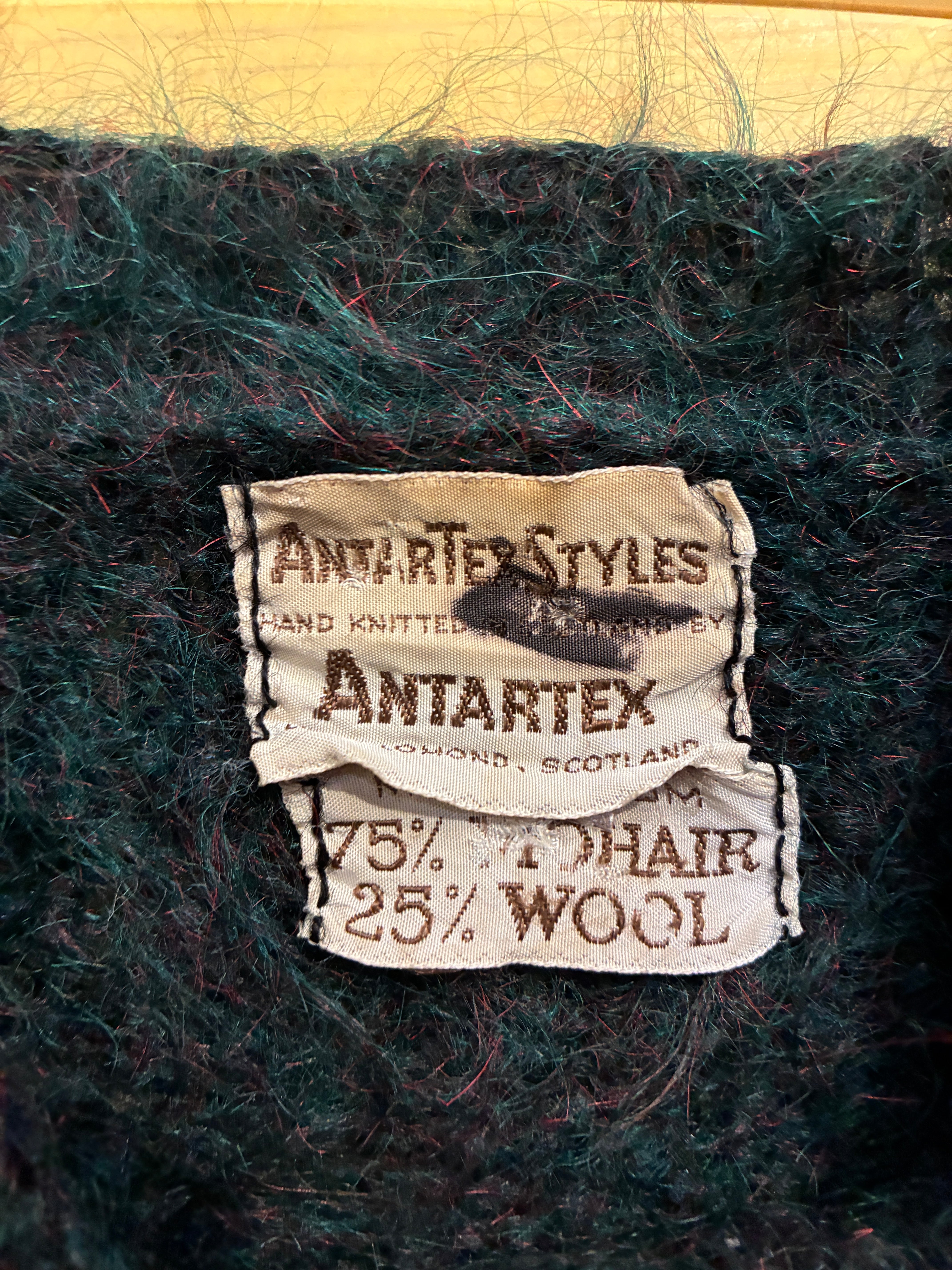 毛足の長さと、グリーンや赤などの絶妙なミックスカラーが特徴的なモヘアカーディガン。