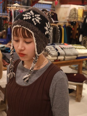 耳当て付きのニットキャップ。