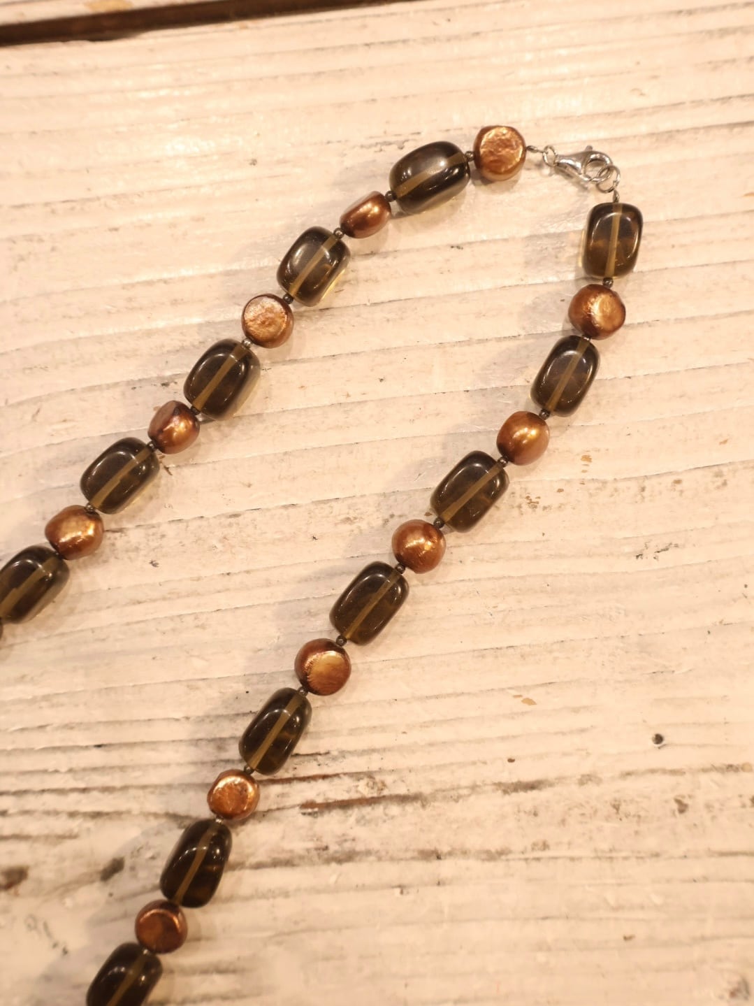 アースカラーで馴染みの良いビーズネックレス。ややメタリックな質感で、顔周りをきらっと華やかに。カジュアル、綺麗め、どちらのスタイルにもハマる一点です。