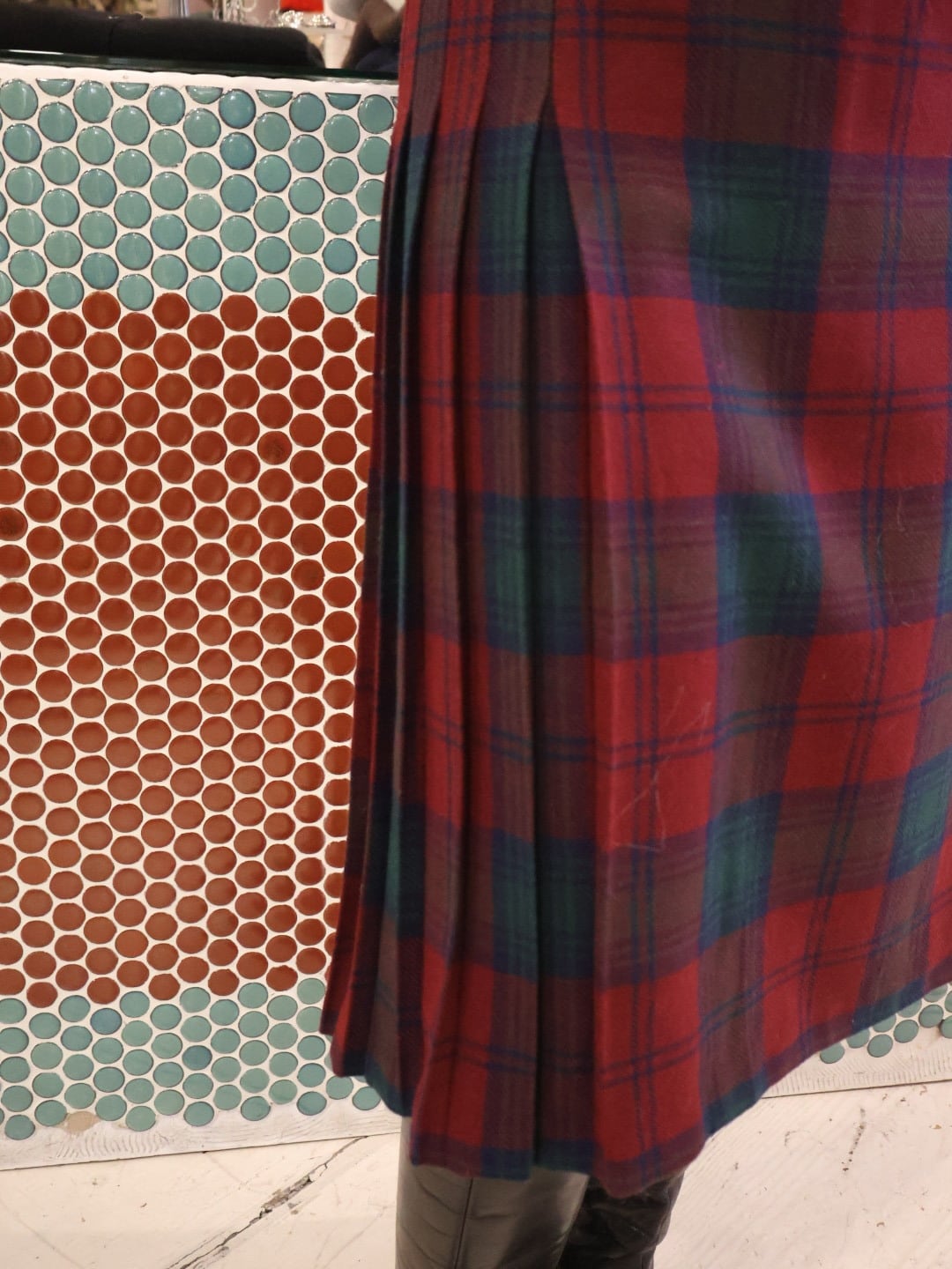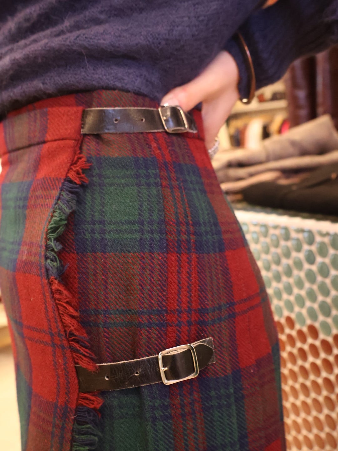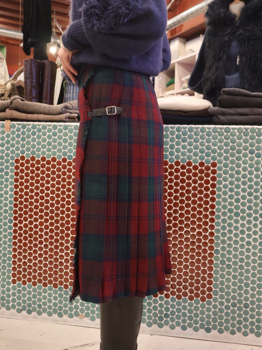 キルトスカートは、タータンチェックの生地にプリーツが施され、腰部分をベルトやピンで留める巻きスカート。