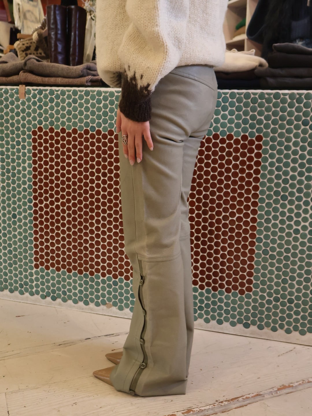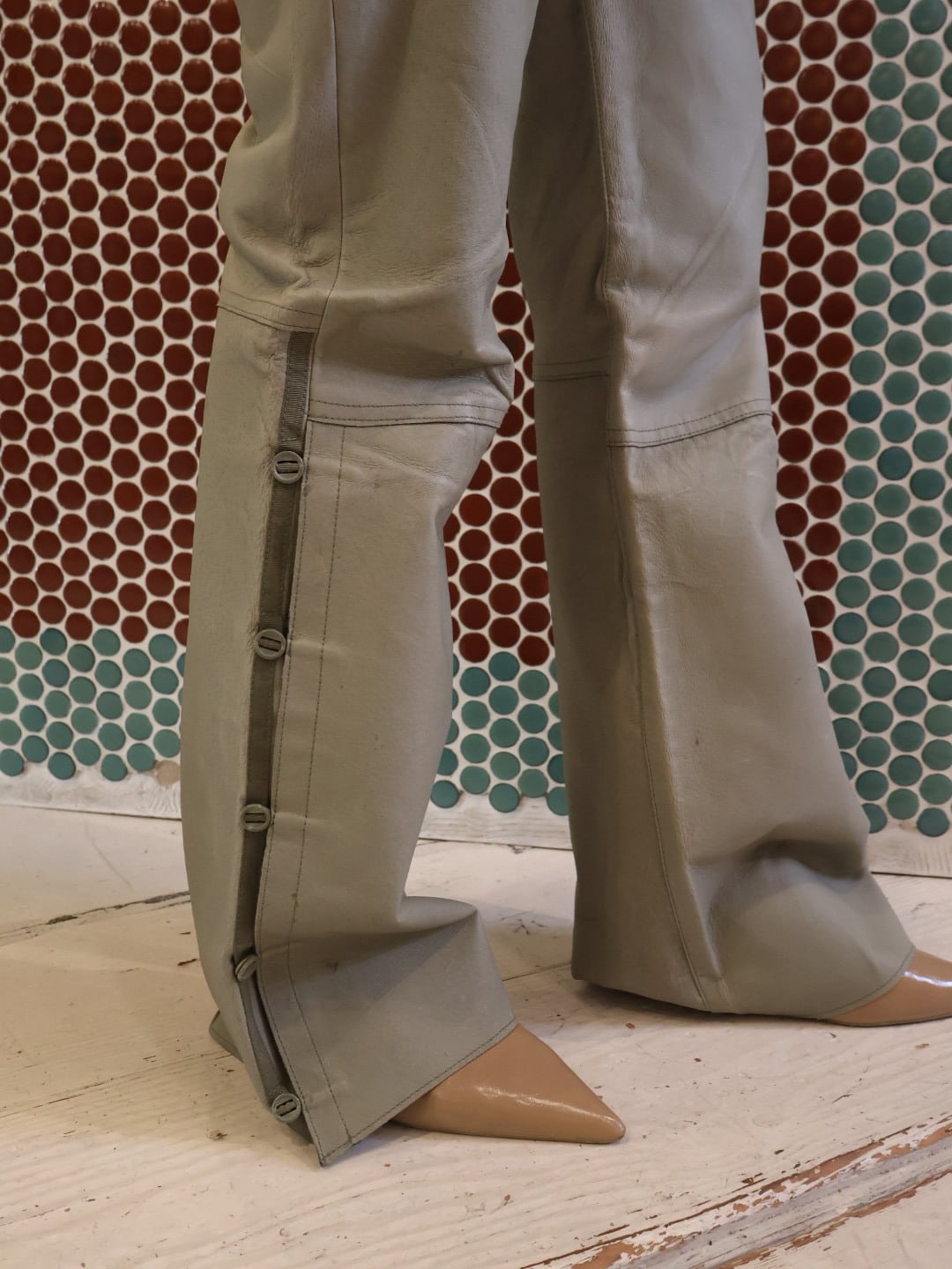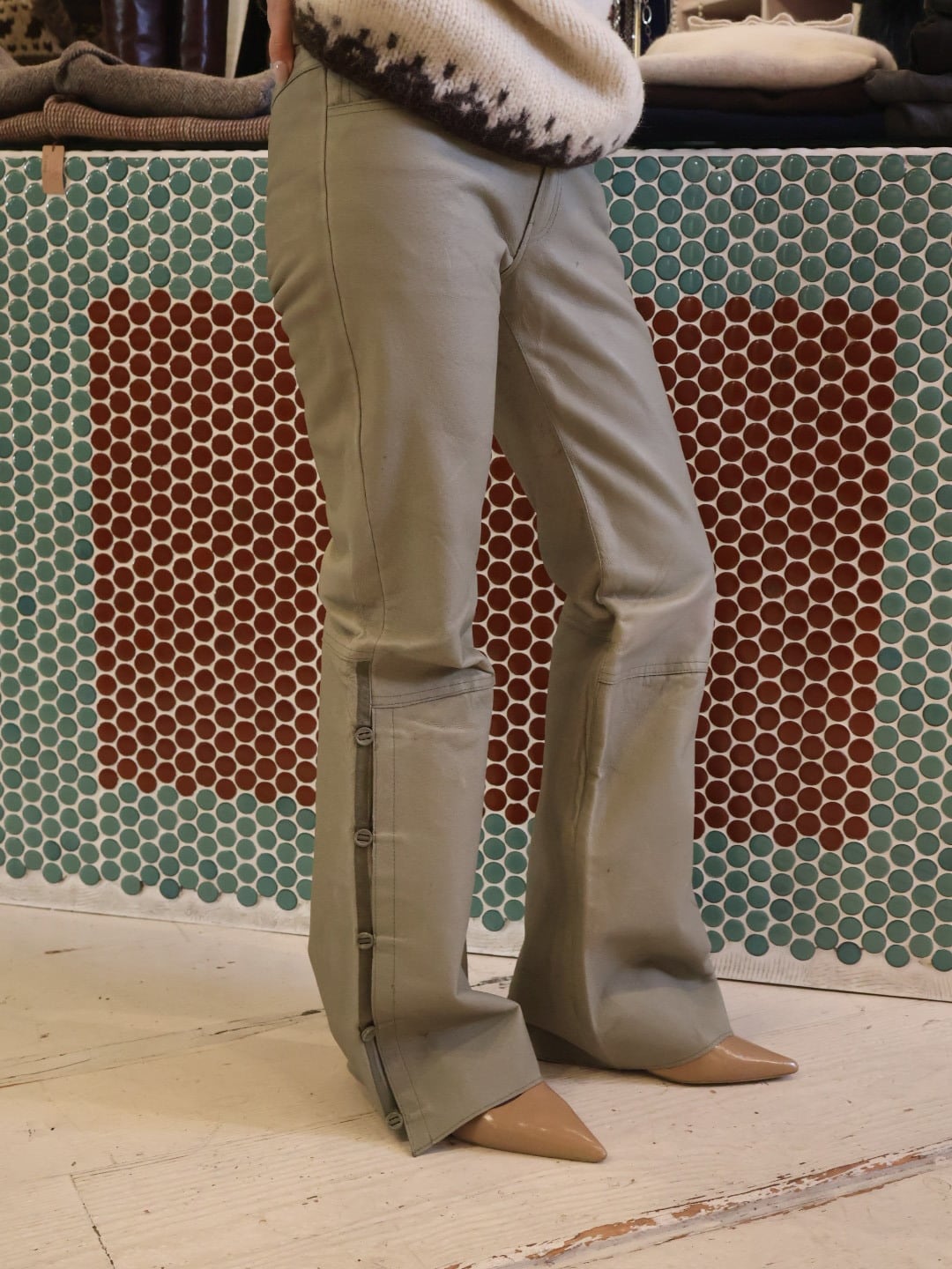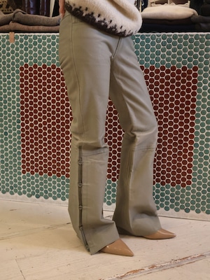 足を長く綺麗に見せるフレアシルエットで、裾はサイドがボタンで開閉可能。