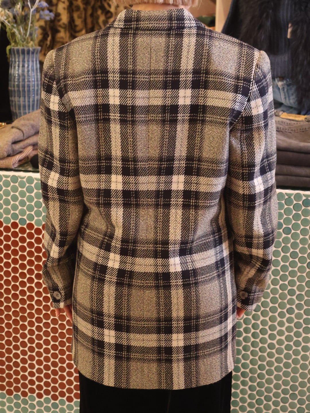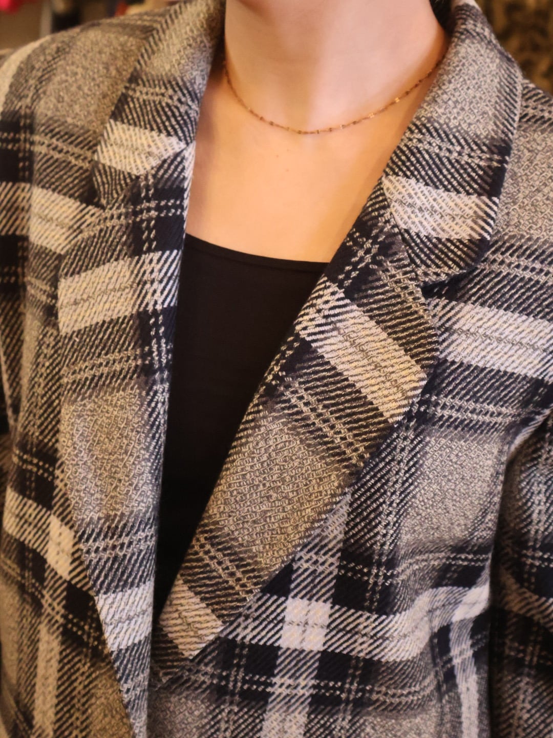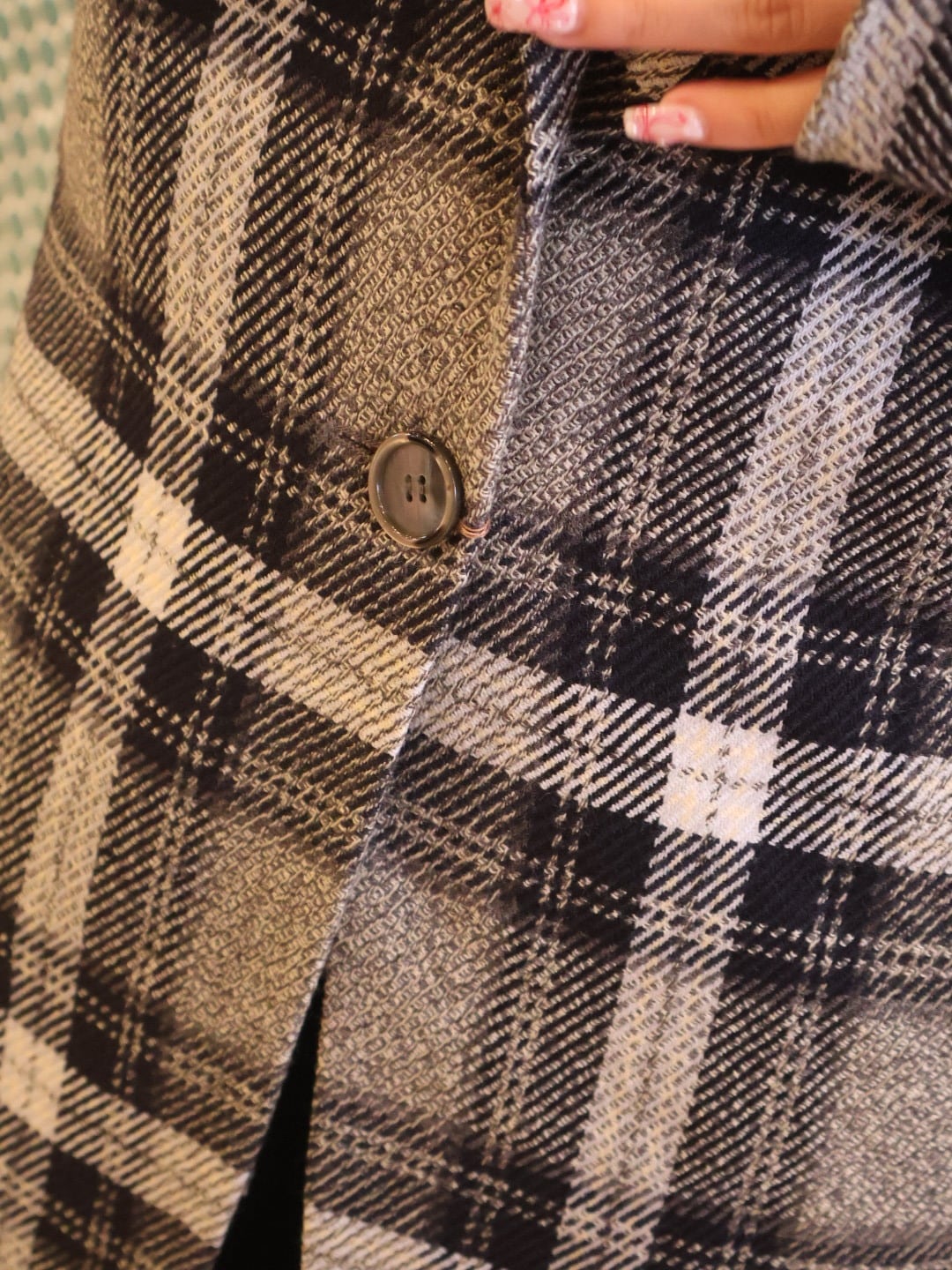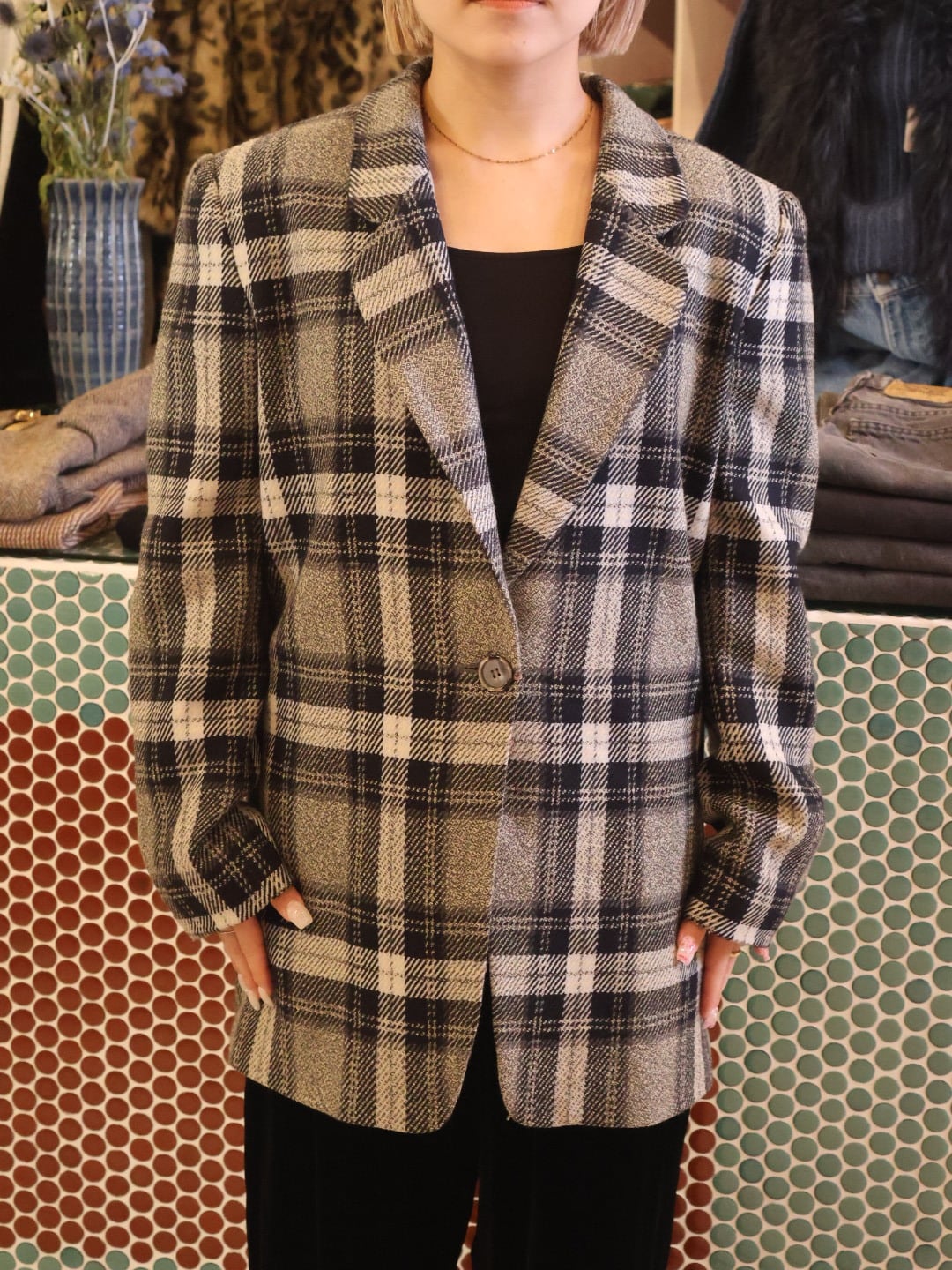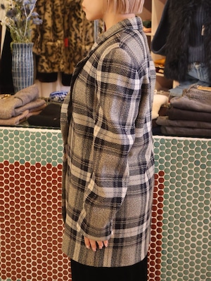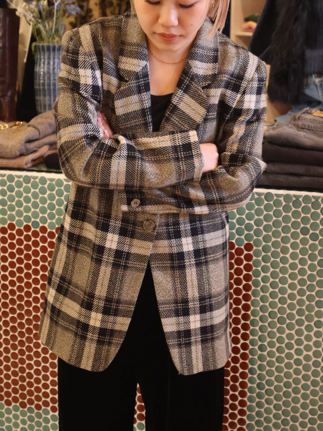 落ち着いた配色のチェック柄が目を惹くテーラードジャケット。