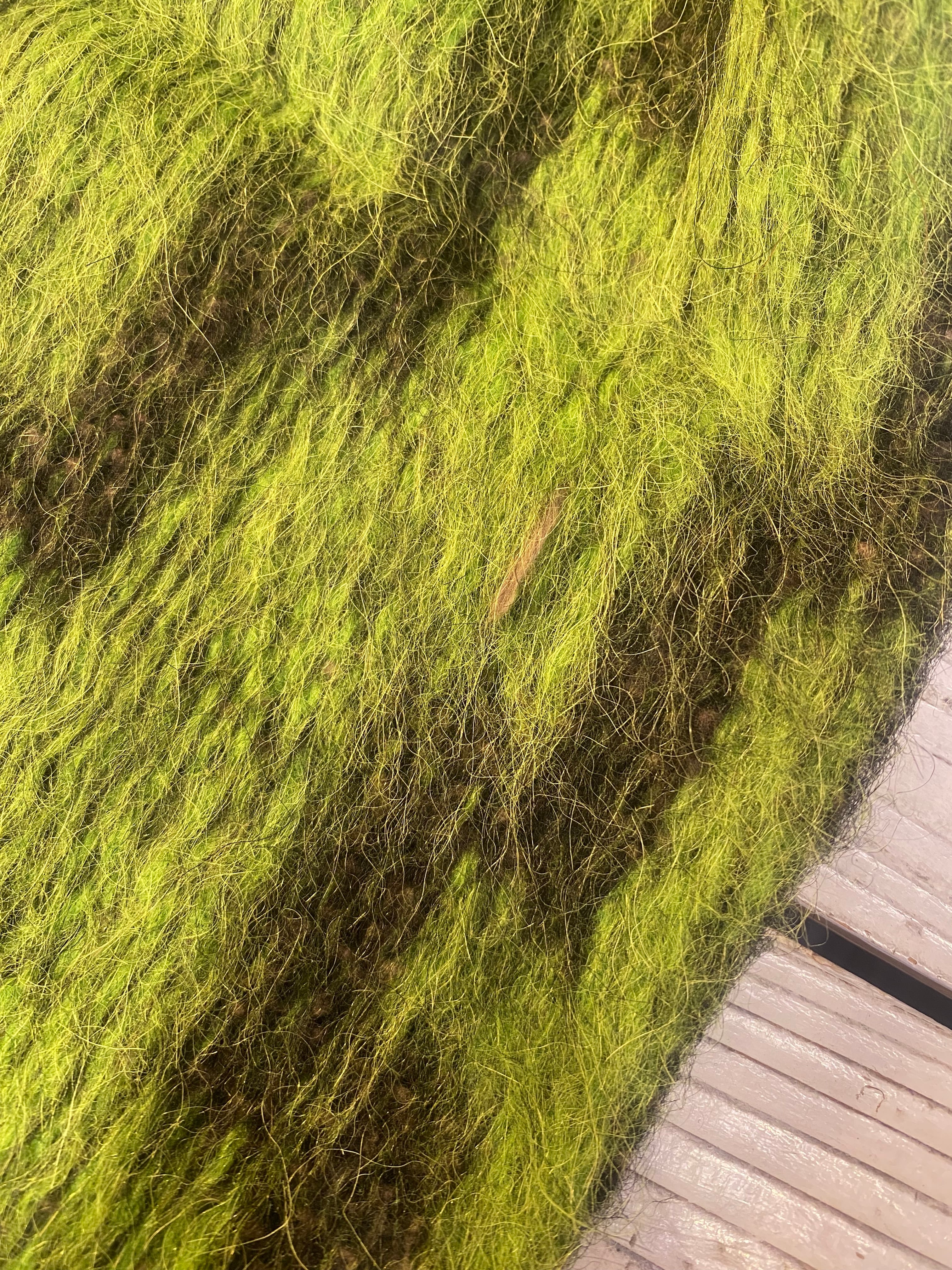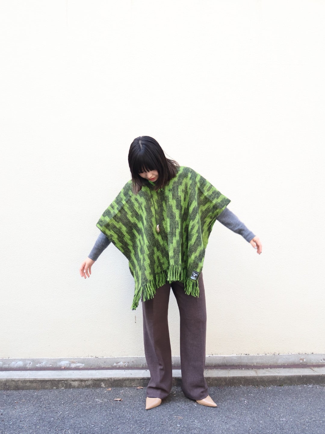 古着らしさのあるネイティブ柄やグリーンとブラックのカラーリングが目を引くニットポンチョ。