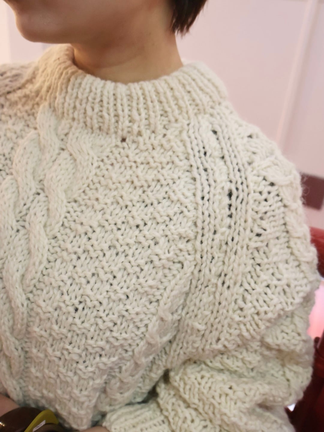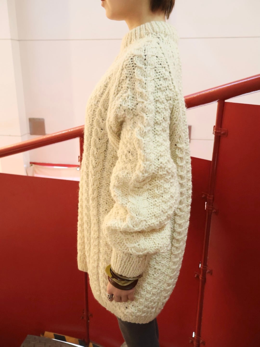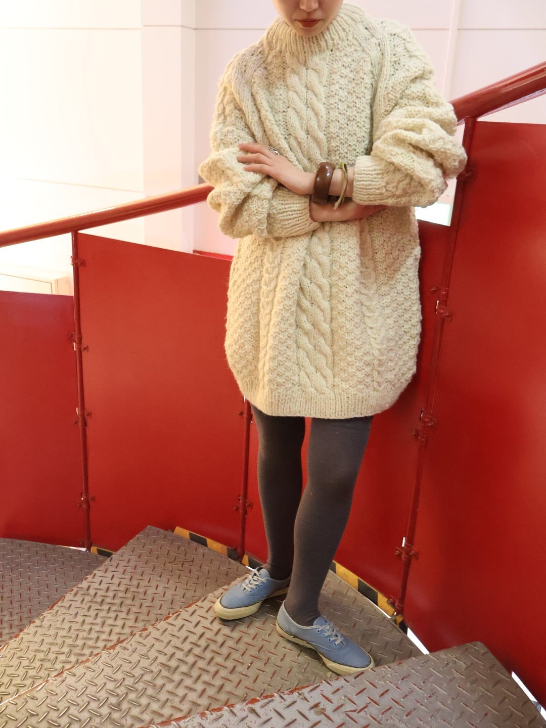 オーバーサイズのフィッシャーマンニットはタイツで合わせたりボトムをコンパクトに纏めてレディースらしく着るのがオススメ。
