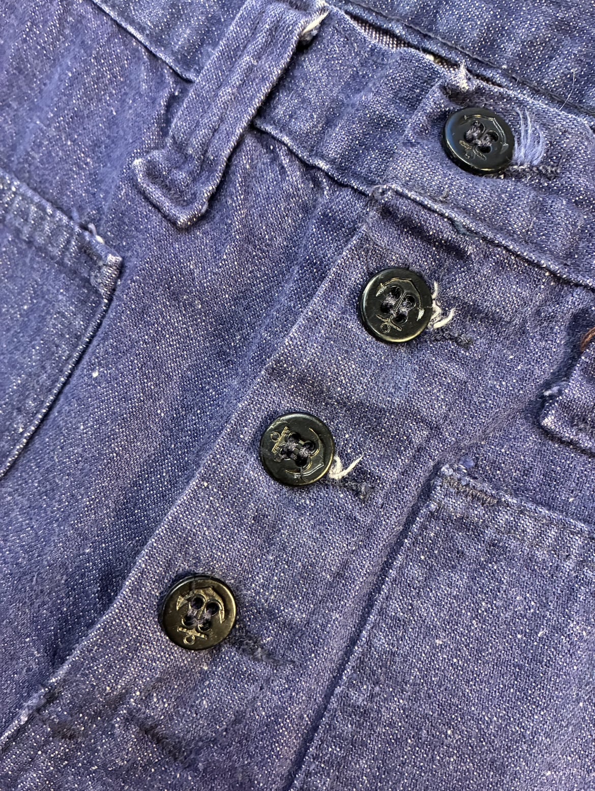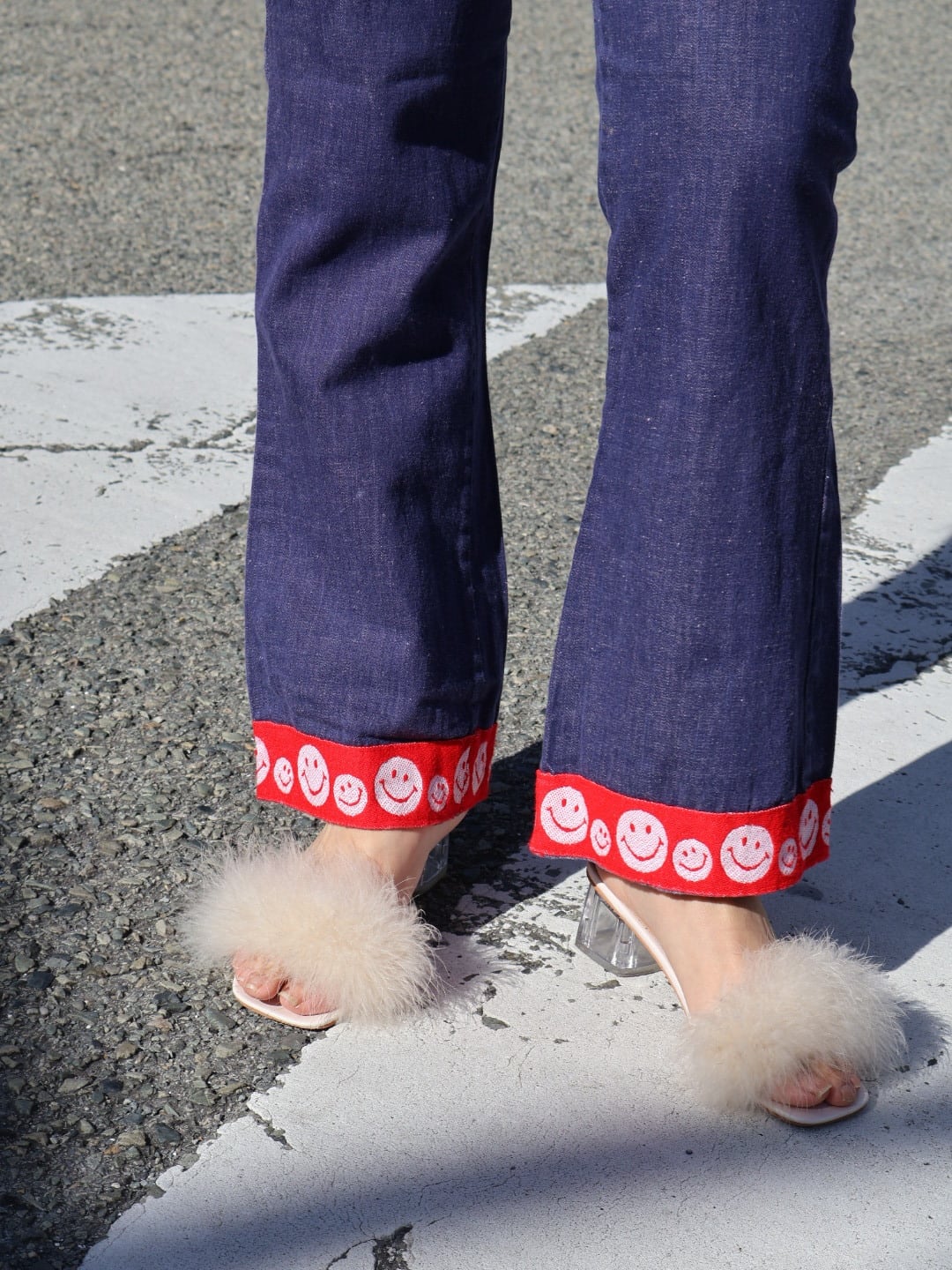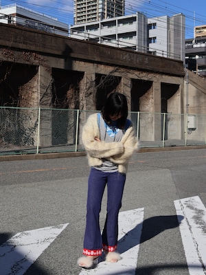 アメリカ海軍のセーラーデニムをカスタムした一本。裾のジャガード織のニコちゃんにきゅんときます。足を長く綺麗に見せるフレアシルエット、長すぎないレングスで、幅広い方におすすめの一本です。