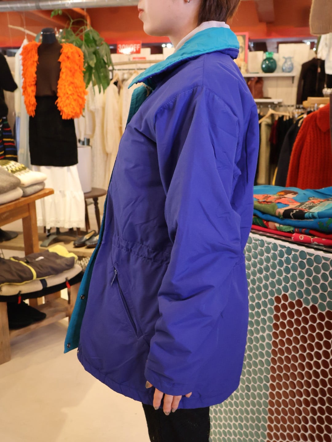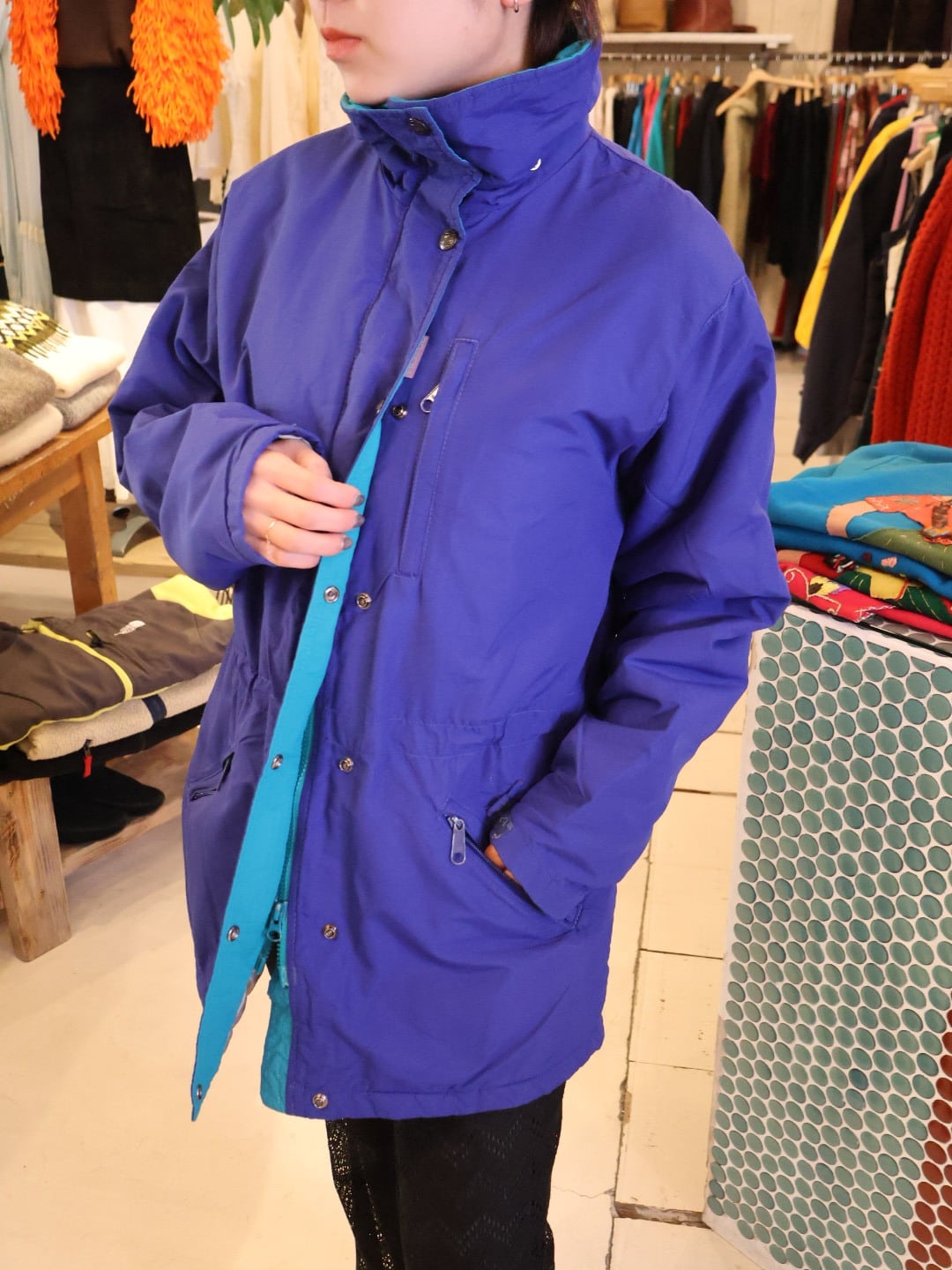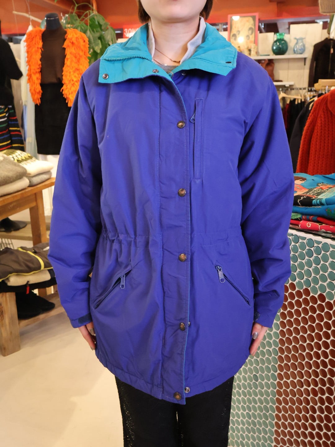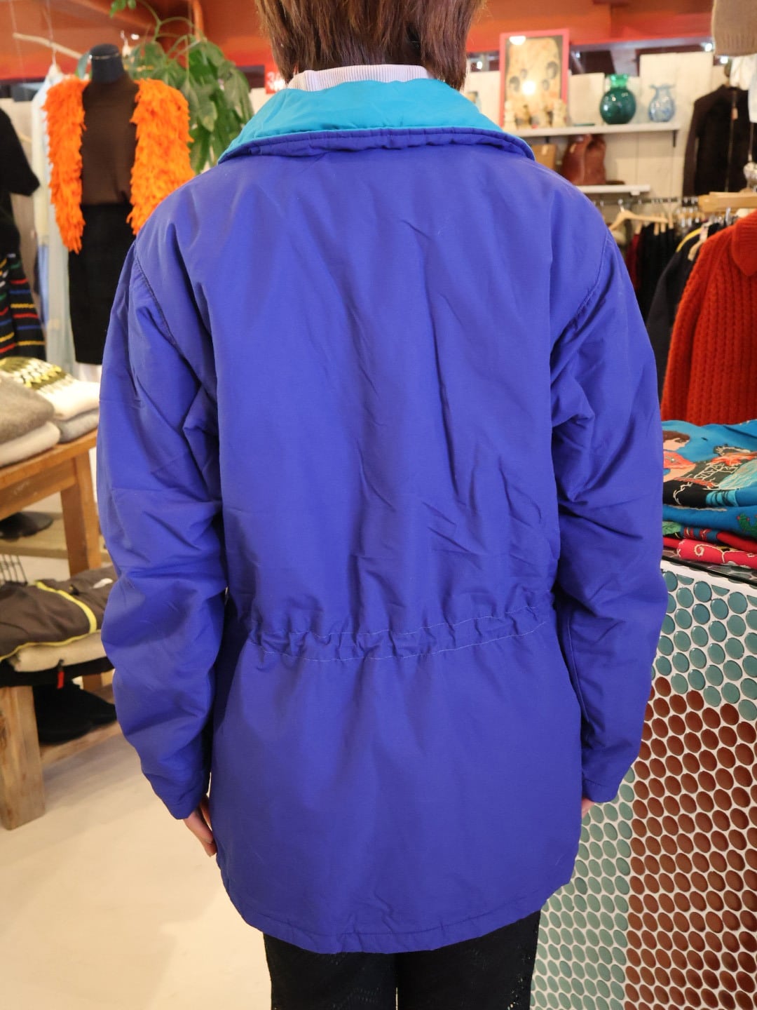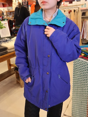 鮮やかなブルーのボディに襟やジップ付近がブルーグリーンで、ポップな色合わせが可愛い一着。