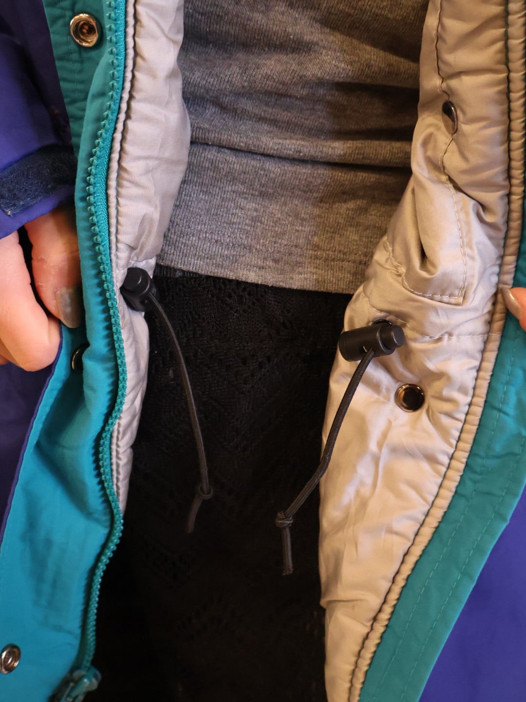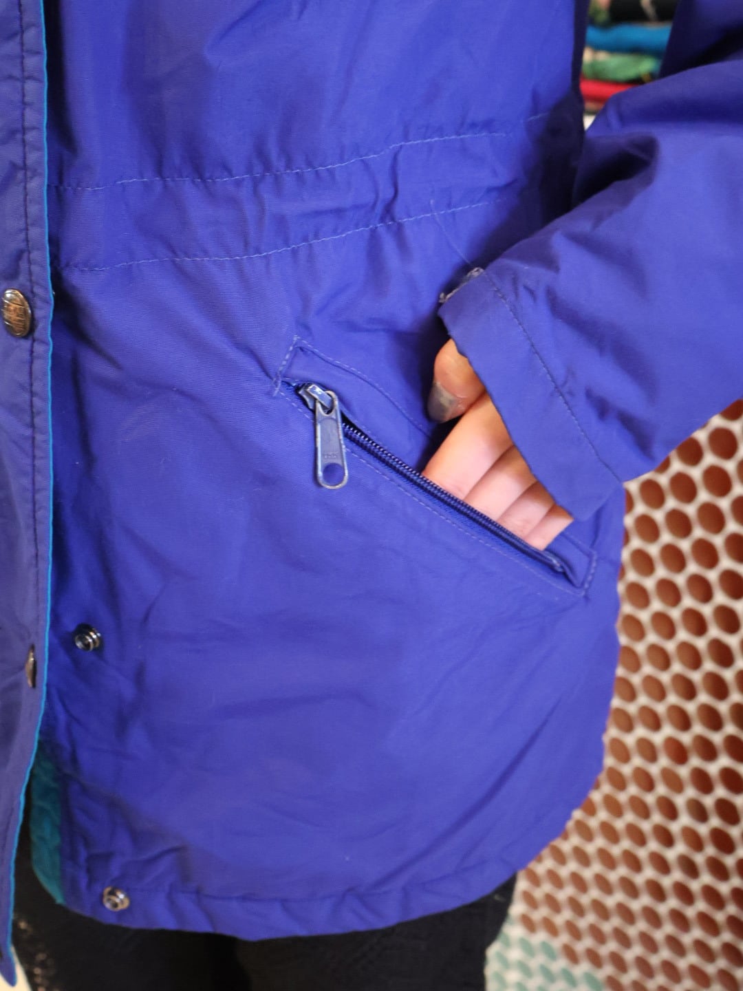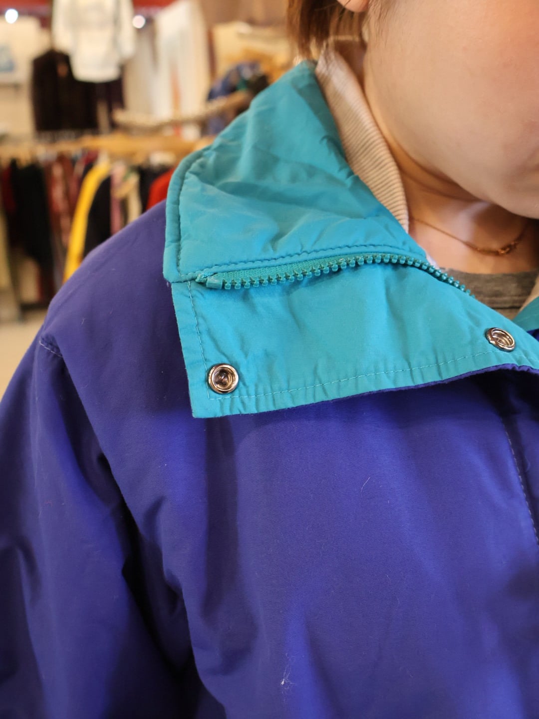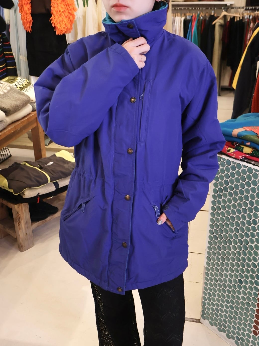鮮やかなブルーのボディに襟やジップ付近がブルーグリーンで、ポップな色合わせが可愛い一着。
