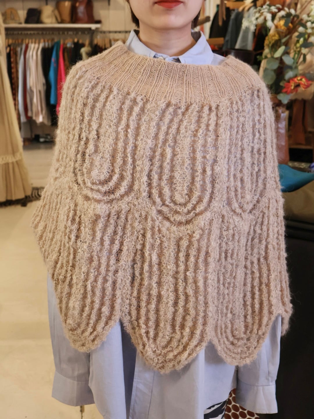 柄や裾のデザインが特徴的なニットポンチョ。