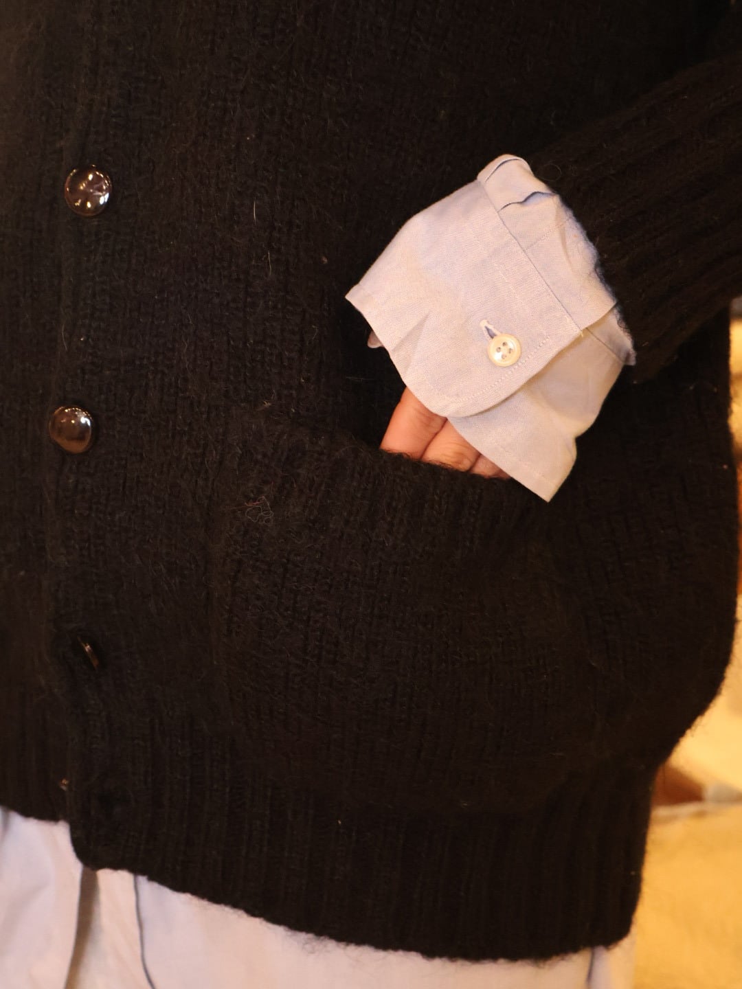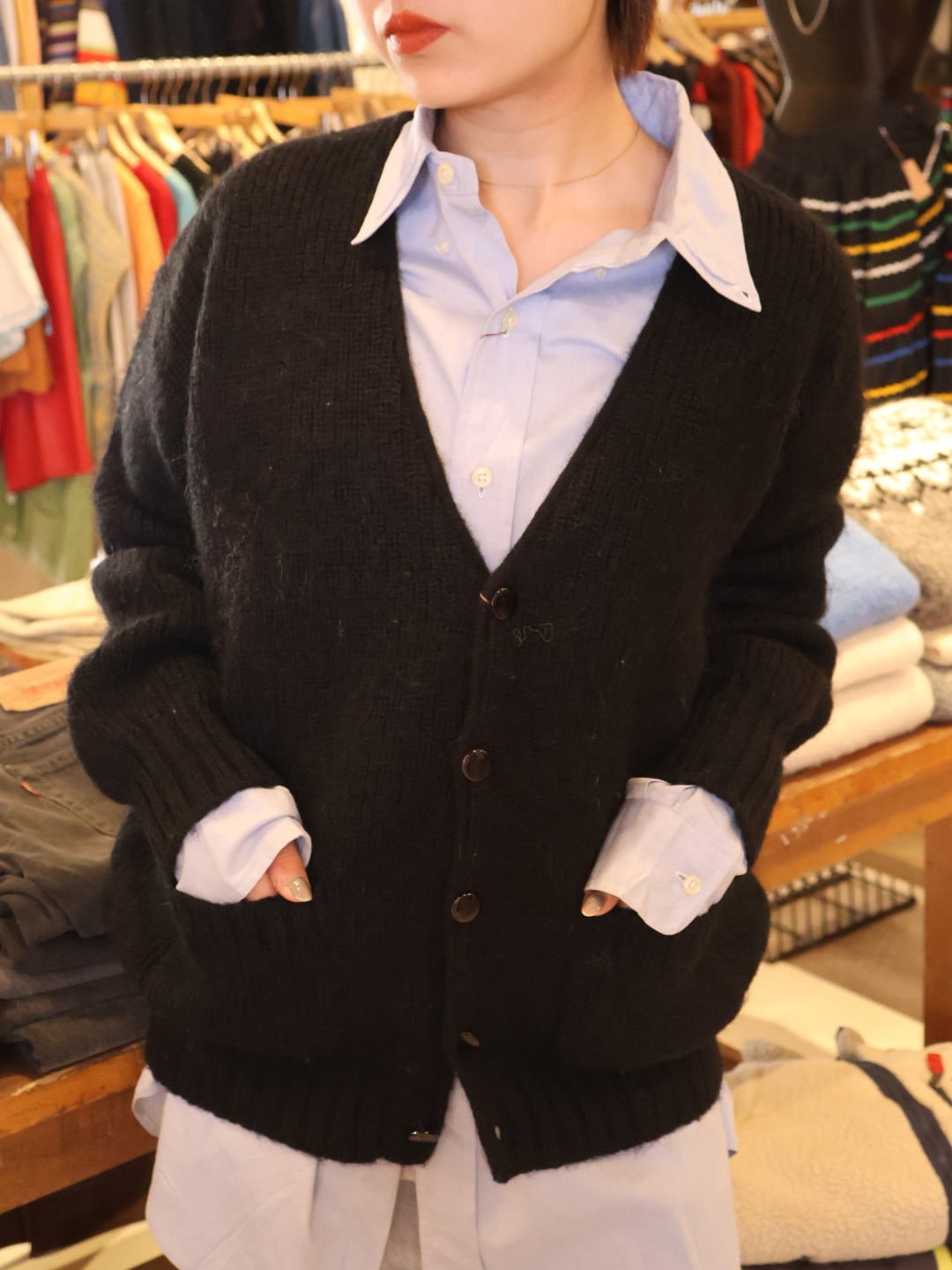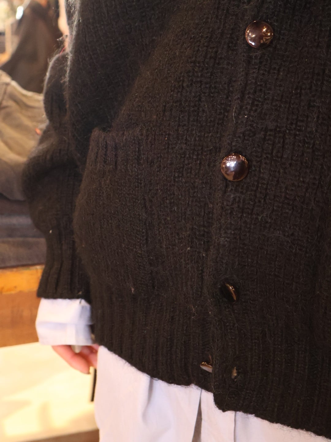 どのスタイルにもマッチングする、オールブラックのモヘアニットカーディガン。