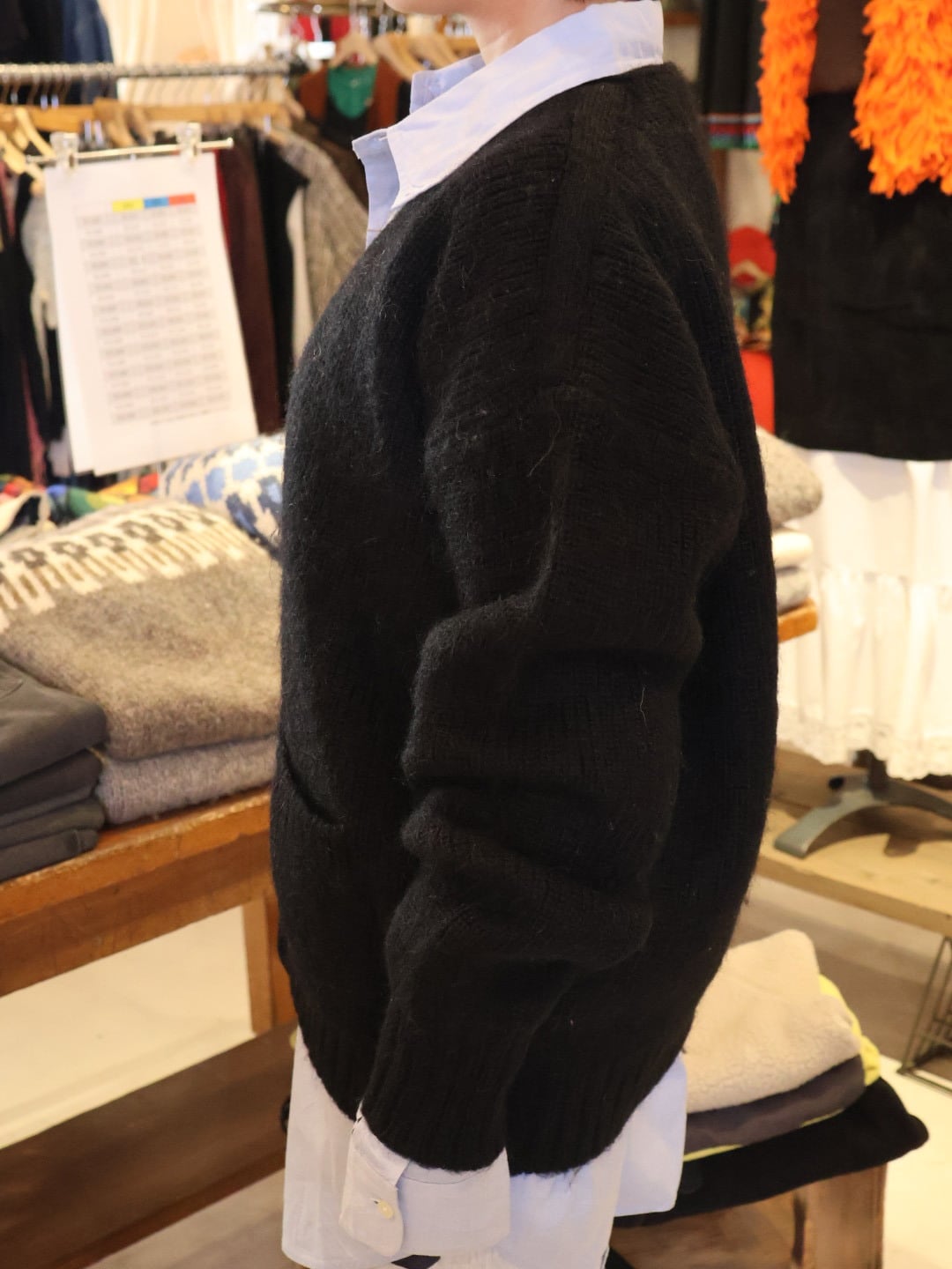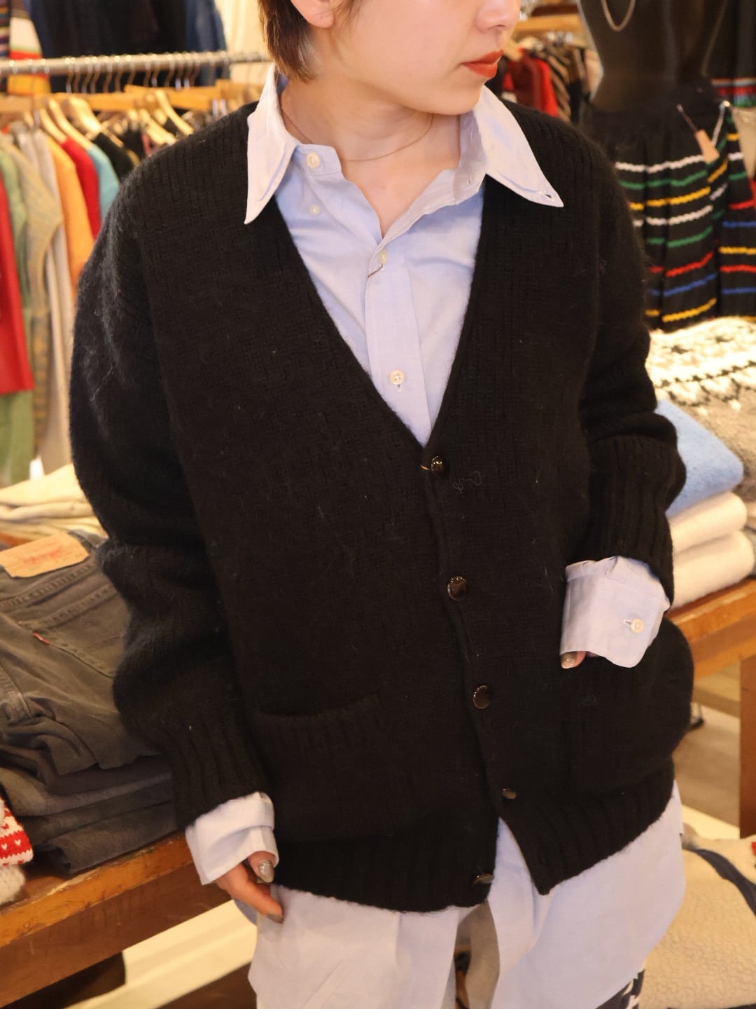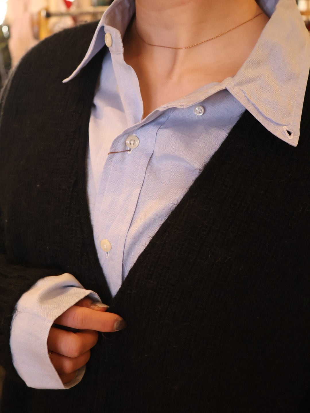 どのスタイルにもマッチングする、オールブラックのモヘアニットカーディガン。