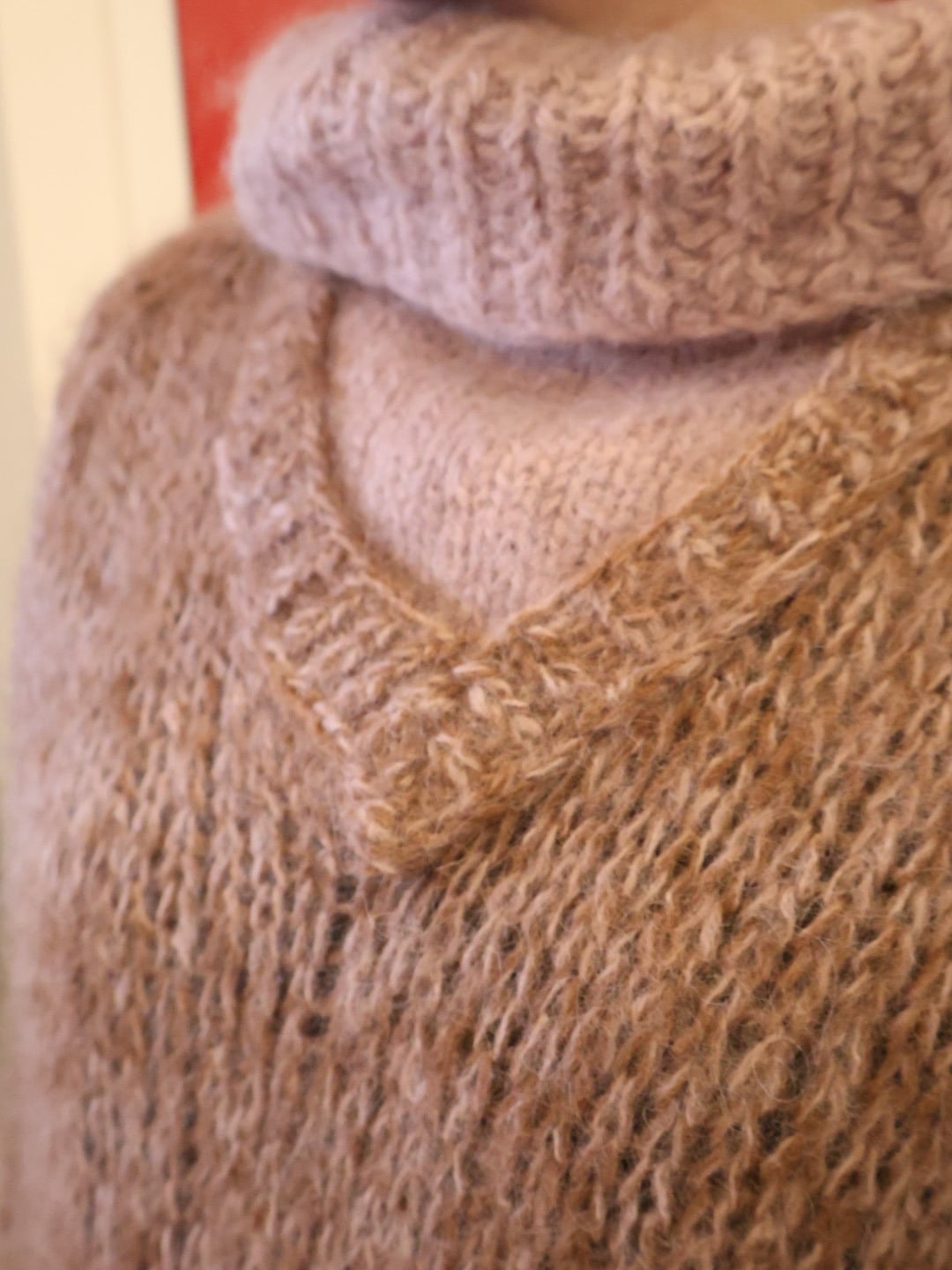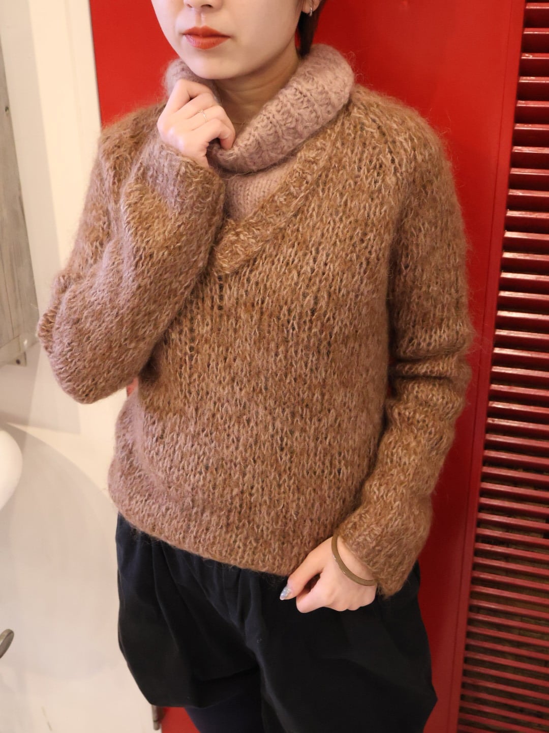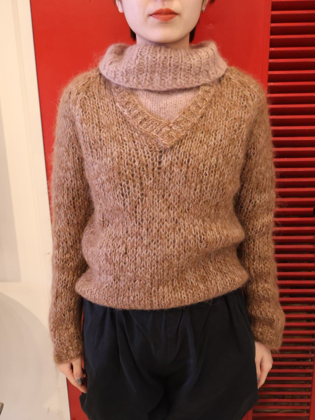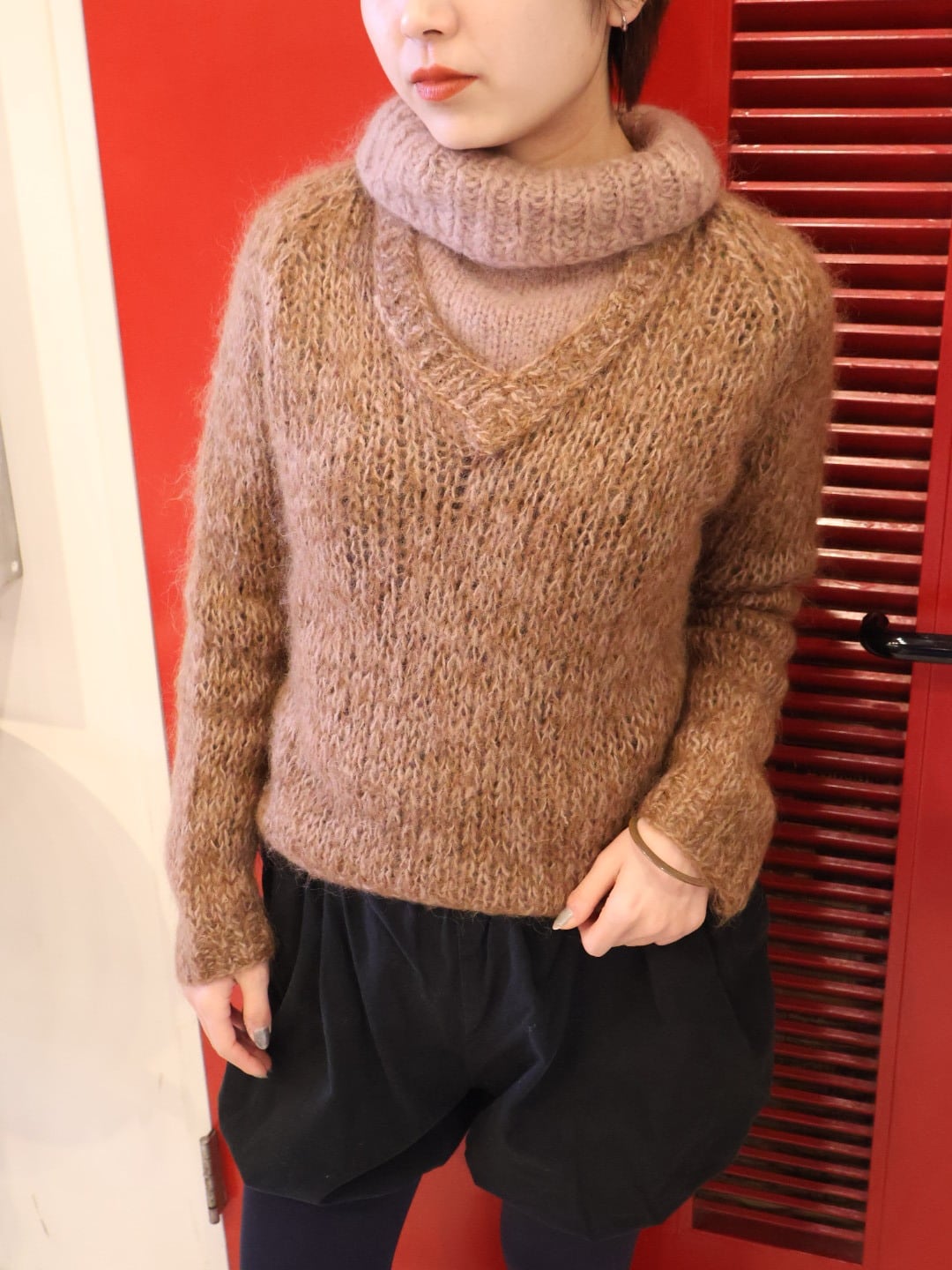 ハイネックニットにVネックのニットをレイヤードしたようなデザインのニットセーター。