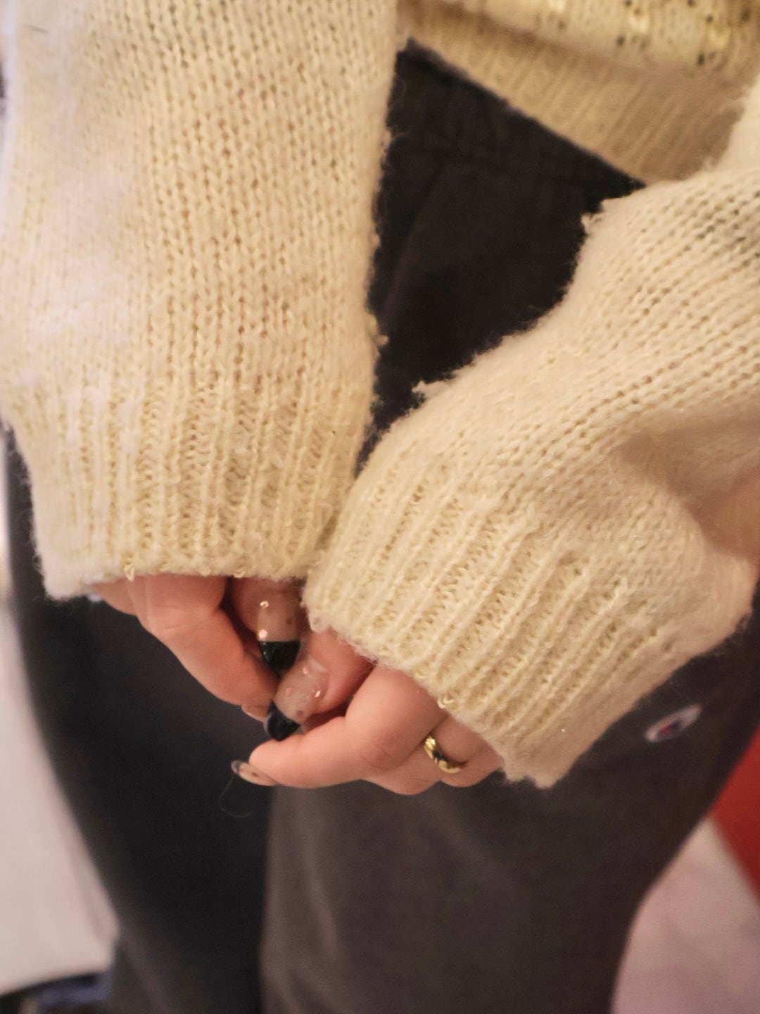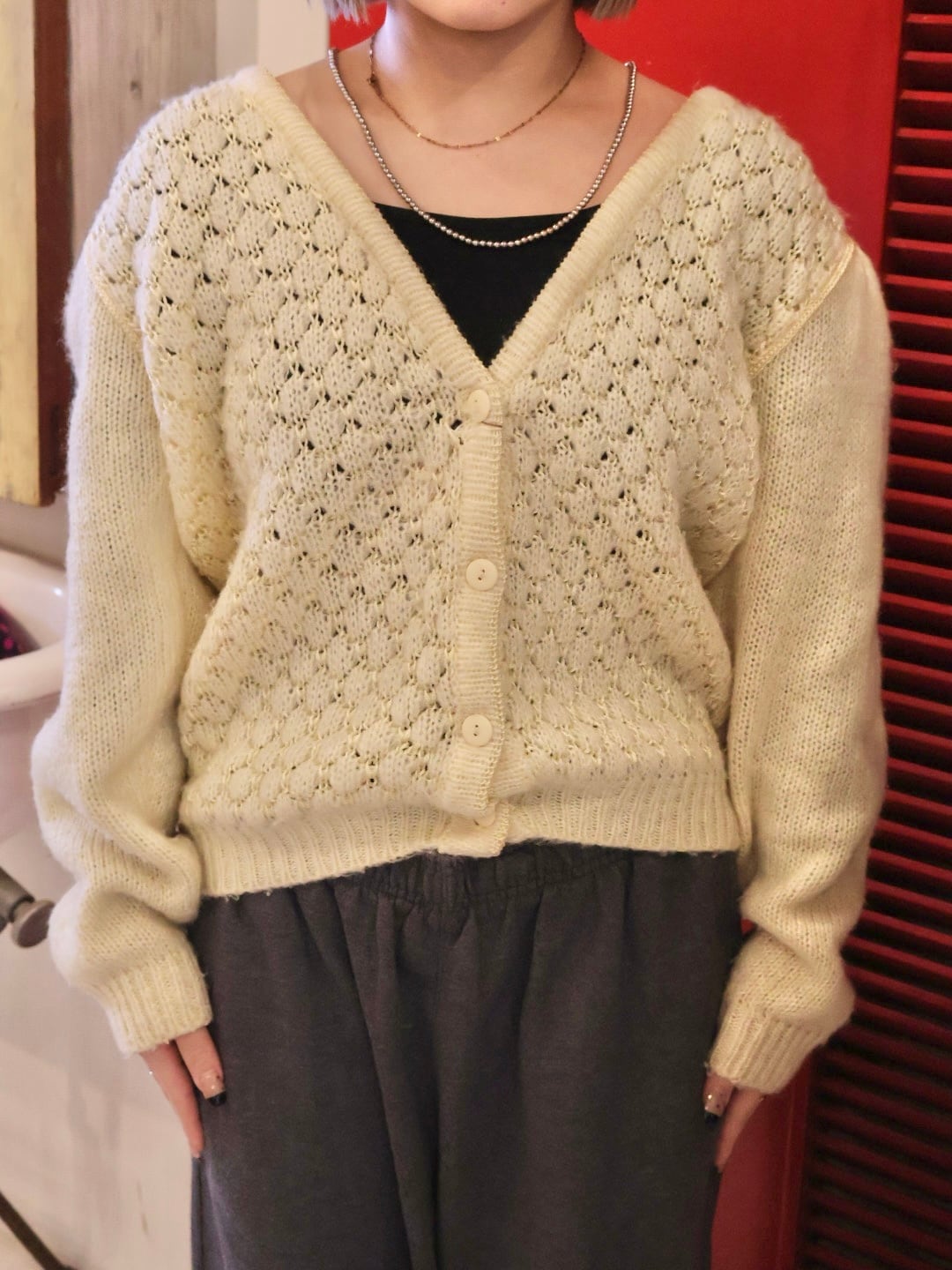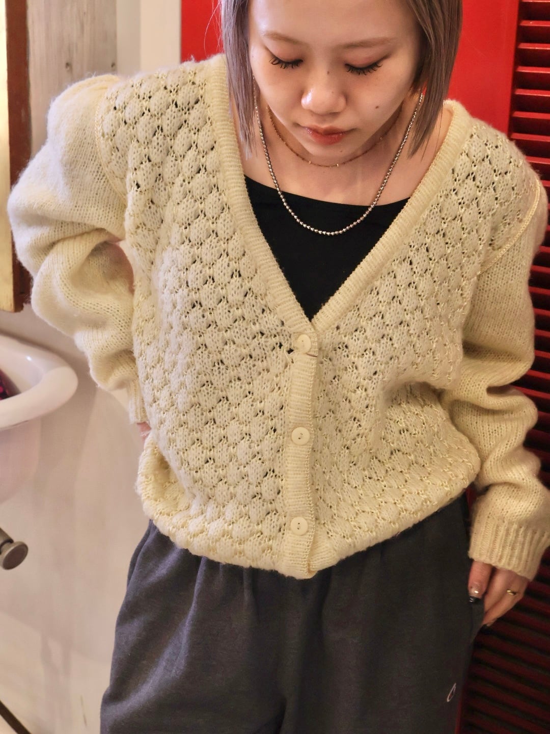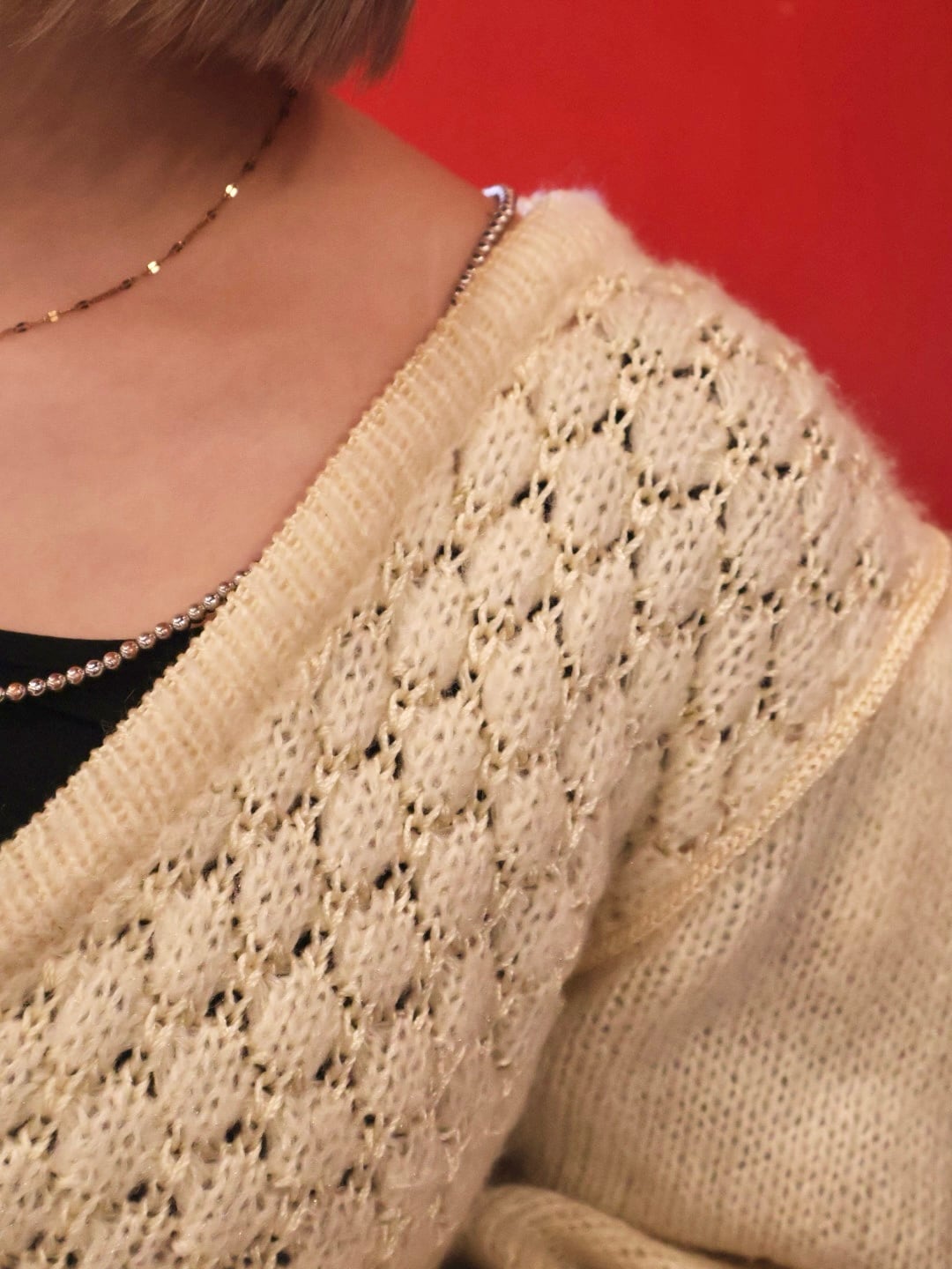 ふっくらとしたニットに光沢感のあるツルッとした糸が編まれたデザインが上品なカーディガン。