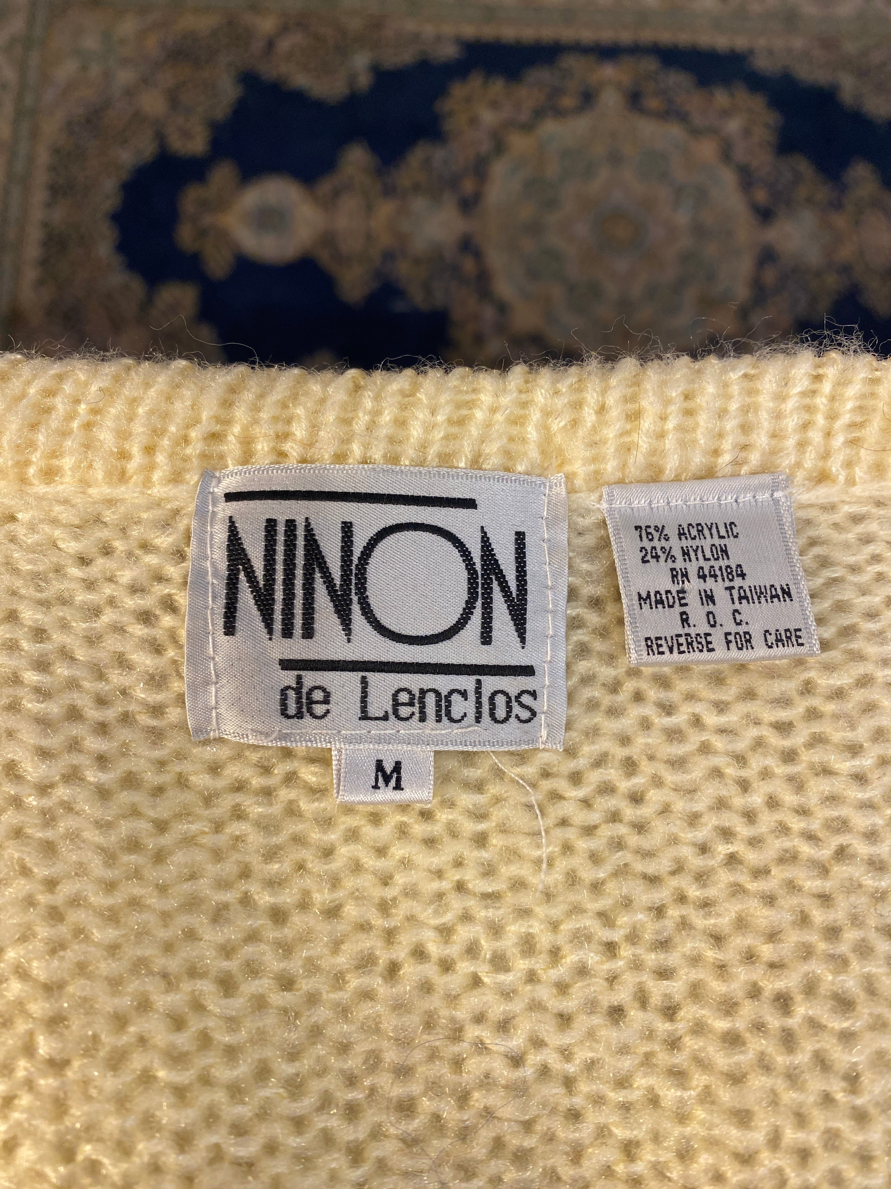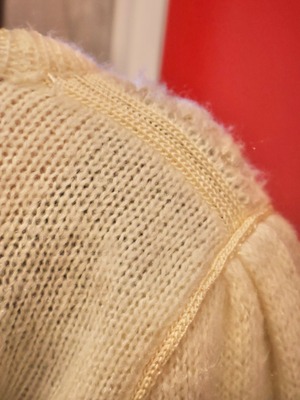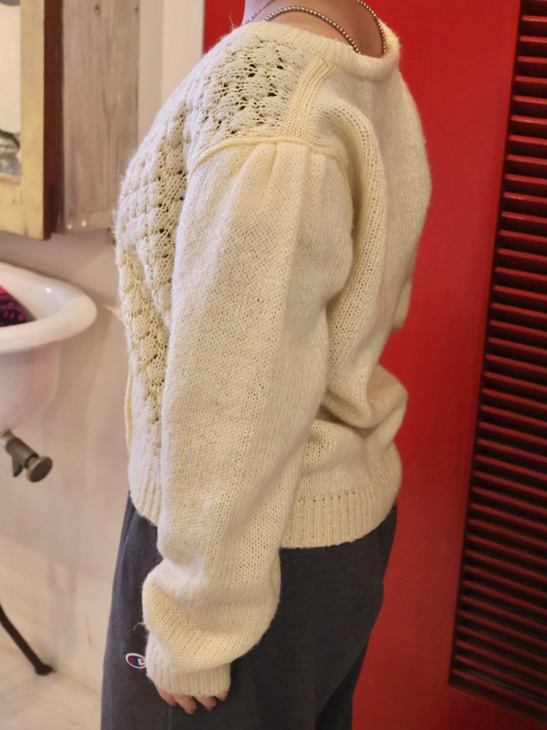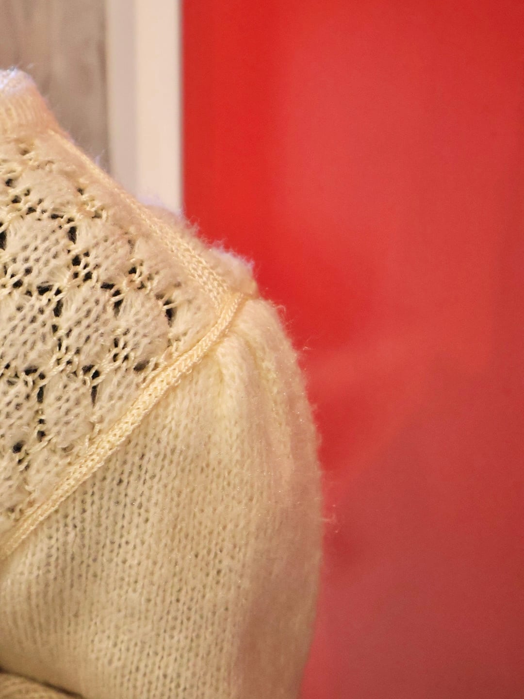 ふっくらとしたニットに光沢感のあるツルッとした糸が編まれたデザインが上品なカーディガン。